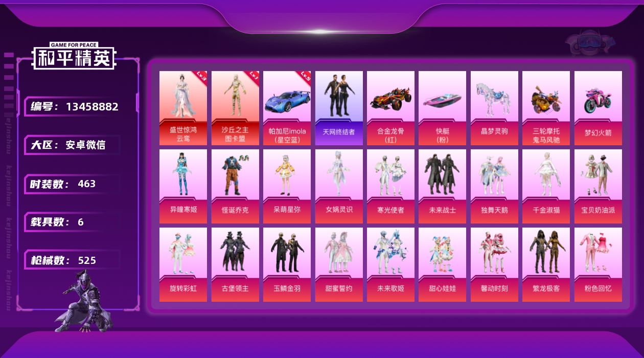 [13458882]女号-29印记-5绝世-无敌战神框-24w热力-满天赋-2神装-65粉装-34特效枪-6载具-1僚机-21粉色飞行器-29王牌印记-463套装-525枪皮