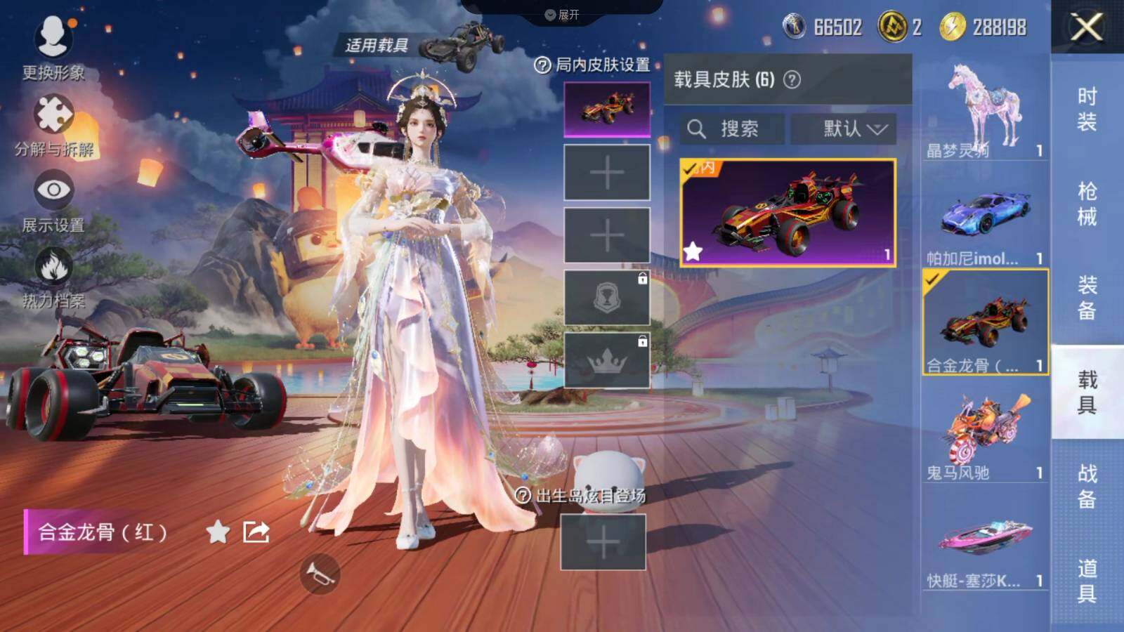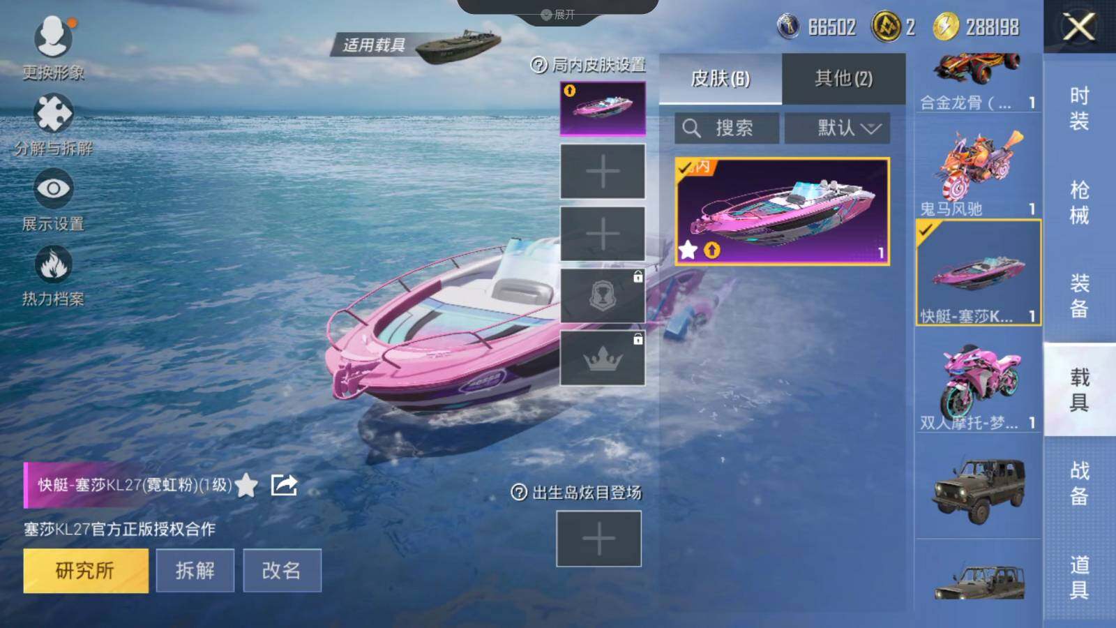【粉色载具】:帕加尼imola(星空蓝),合金龙骨(红),双人摩托-梦幻火箭,鬼马风驰,空客H135-恋语之翼,快艇-塞莎KL27(霓虹粉),晶梦灵驹