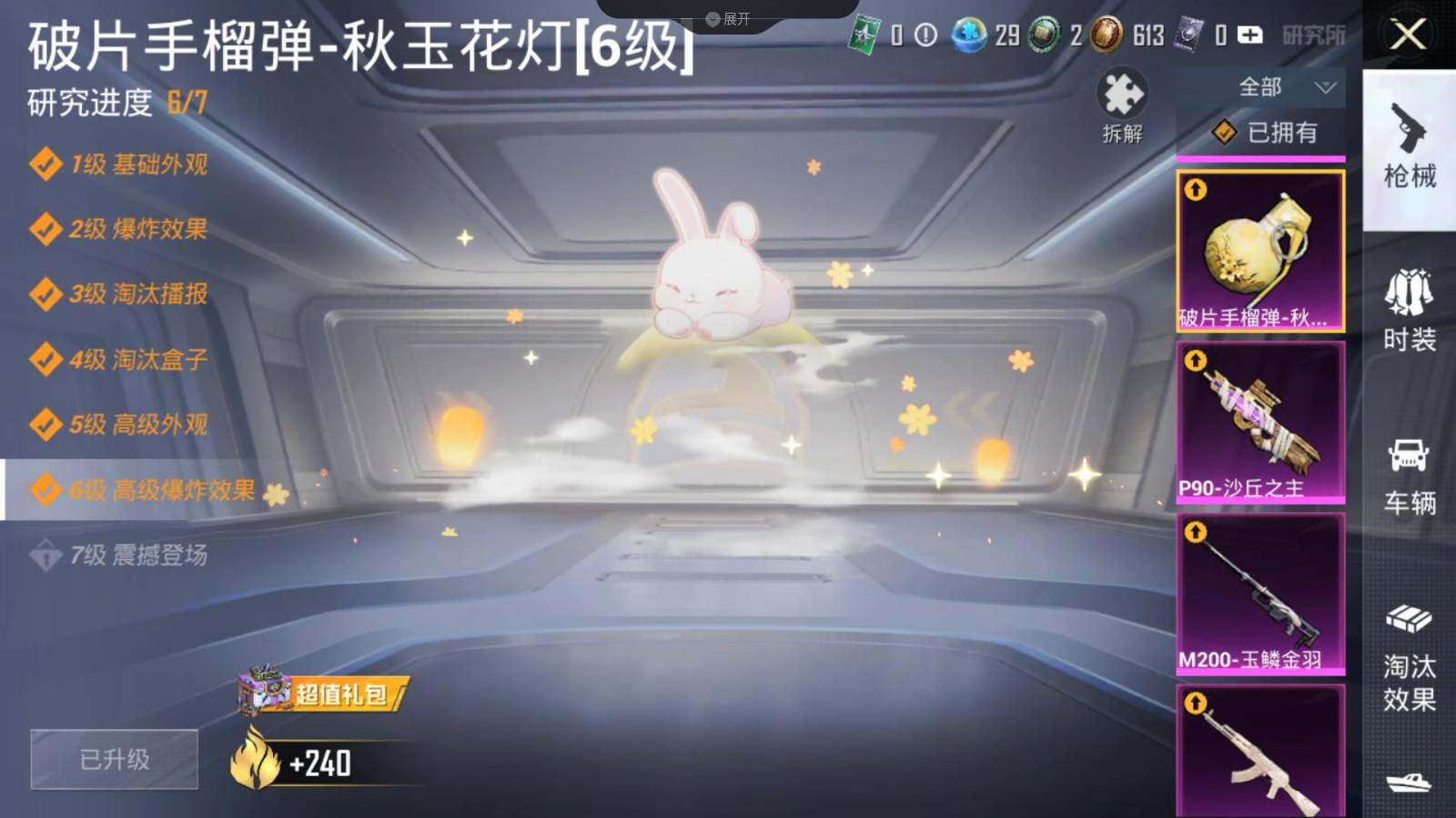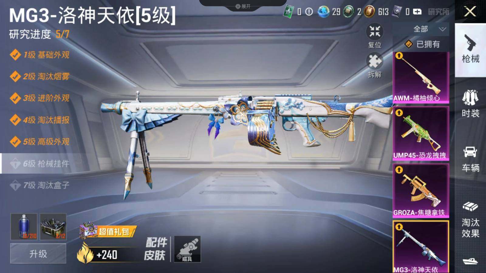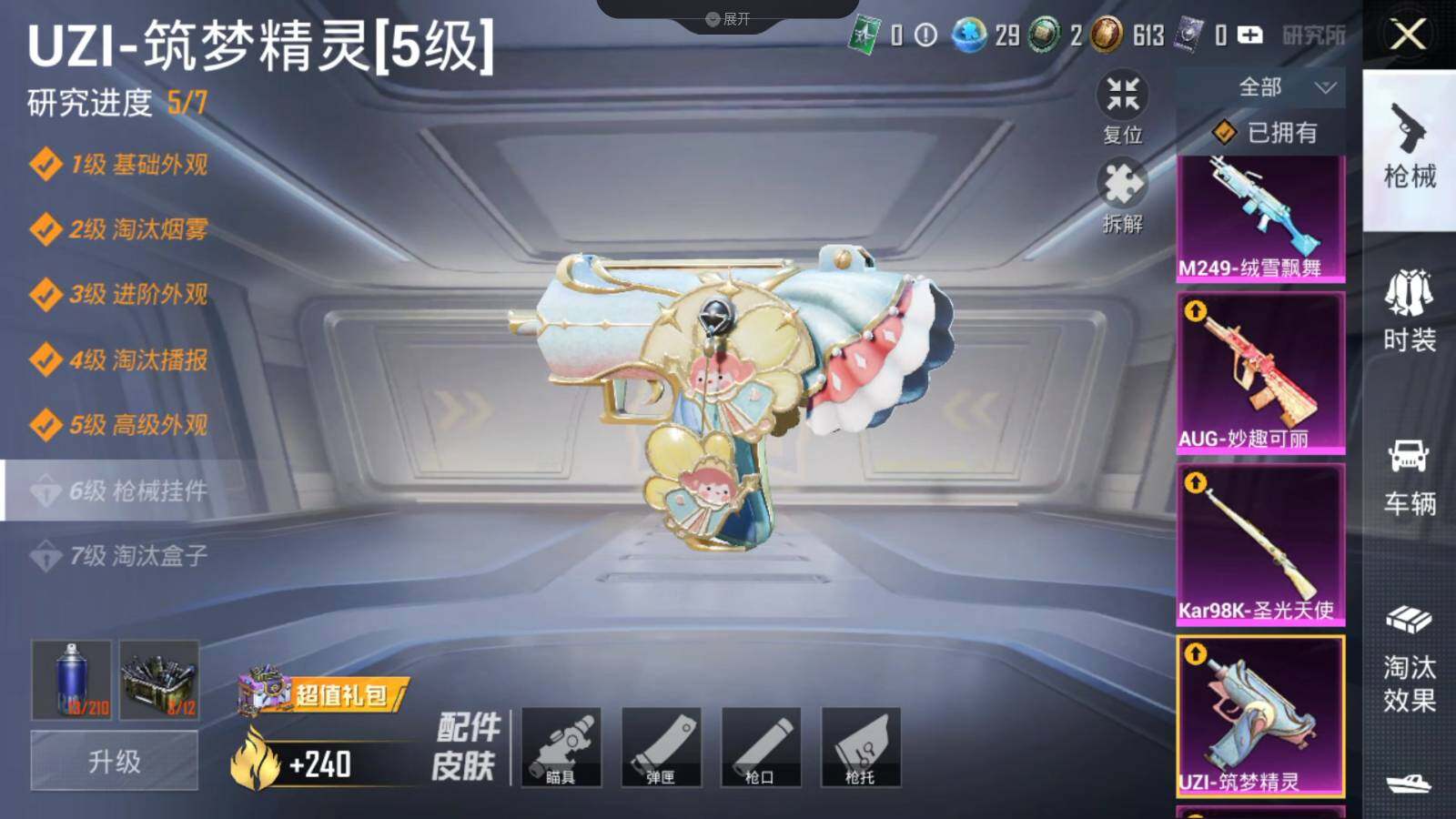 AKM-炫紫旋律,AKM-梦之光华,AKM-白勺歌姬,M16A4-垂柳戏鸭,SCAR-L-梦幻火箭,SCAR-L-童趣迷兔,M416-心之恋语,M416-风花雪月,GROZA-香水柠檬,GROZA-焦糖拿铁,AUG-妙趣可丽,M762-甜蜜誓约,UZI-筑梦精灵,UMP45-雪国精灵,UMP45-恐龙拽拽,Vector-飒粉甜心,汤姆逊-怪笑疯兔,P90-甜蜜草莓,P90-沙丘之主,Kar98K-伏魔团,Kar98K-圣光天使,Kar98K-巳巳如意,AWM-花间之火,AWM-橘柚倾心,Mk14-盛世惊鸿,M200-玉鳞金羽,M249-绒雪飘舞,DP-28-扶摇飞仙,MG3-洛神天依,平底锅-林间仙鹿,平底锅-仲夏莫吉托,烟雾弹-丁香清露,破片手榴弹-秋玉花灯
