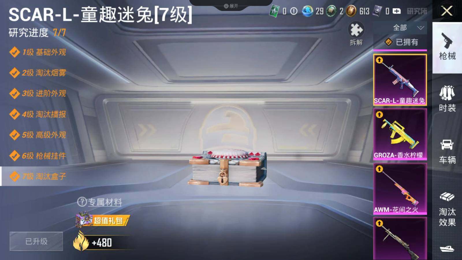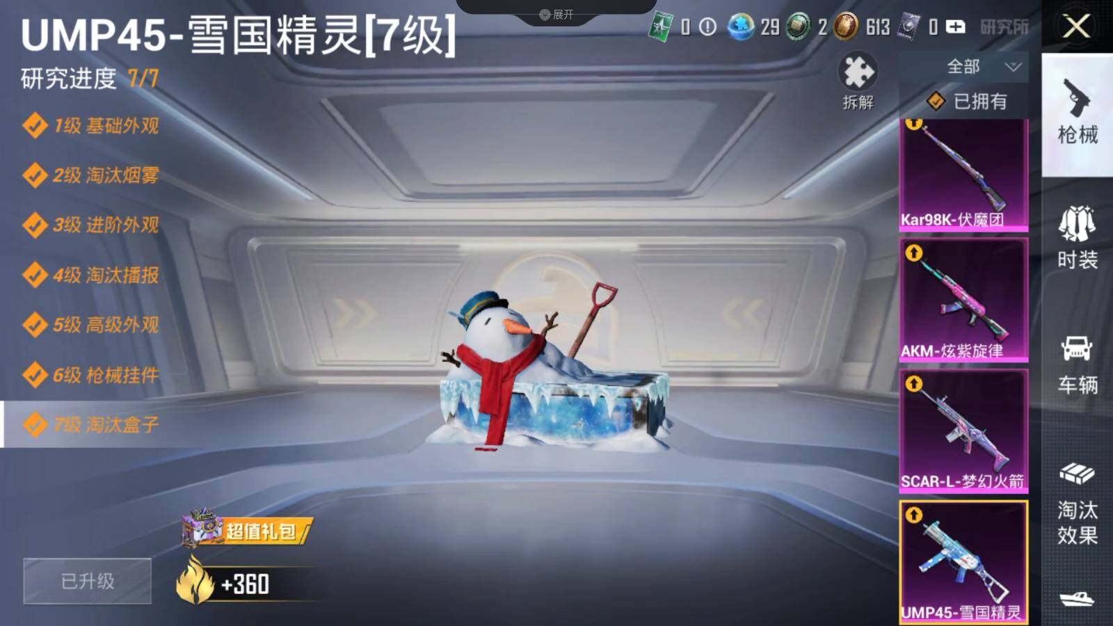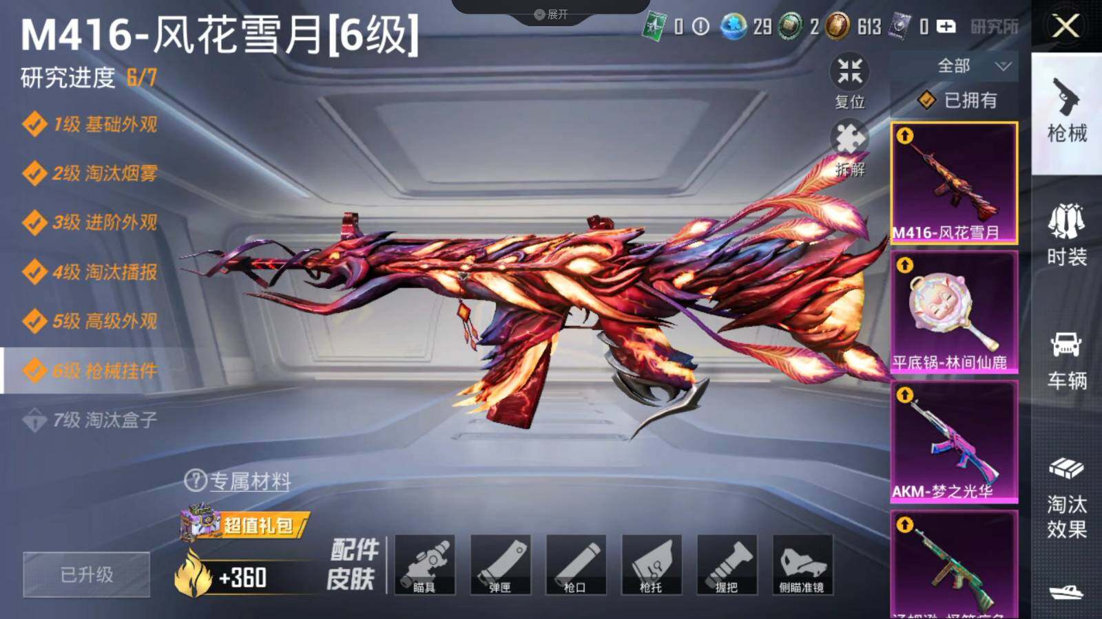 AKM-炫紫旋律,AKM-梦之光华,AKM-白勺歌姬,M16A4-垂柳戏鸭,SCAR-L-梦幻火箭,SCAR-L-童趣迷兔,M416-心之恋语,M416-风花雪月,GROZA-香水柠檬,GROZA-焦糖拿铁,AUG-妙趣可丽,M762-甜蜜誓约,UZI-筑梦精灵,UMP45-雪国精灵,UMP45-恐龙拽拽,Vector-飒粉甜心,汤姆逊-怪笑疯兔,P90-甜蜜草莓,P90-沙丘之主,Kar98K-伏魔团,Kar98K-圣光天使,Kar98K-巳巳如意,AWM-花间之火,AWM-橘柚倾心,Mk14-盛世惊鸿,M200-玉鳞金羽,M249-绒雪飘舞,DP-28-扶摇飞仙,MG3-洛神天依,平底锅-林间仙鹿,平底锅-仲夏莫吉托,烟雾弹-丁香清露,破片手榴弹-秋玉花灯
