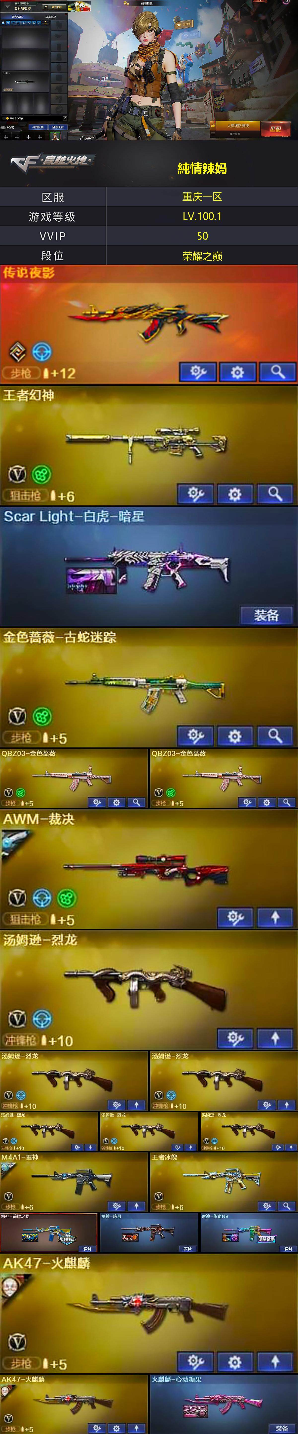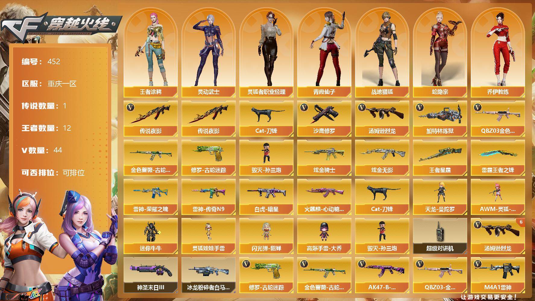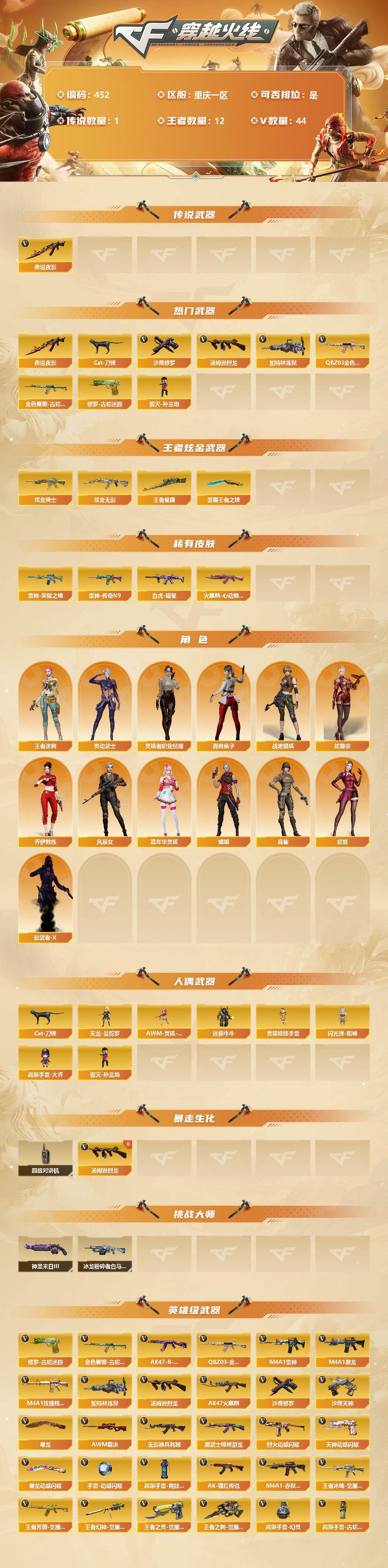[13166031]重庆一区-44V-12王者-2炫金 【传说武器】:传说夜影 【热门武器】:传说夜影,QBZ03-金色蔷薇*2,金色蔷薇-古蛇迷踪,修罗-古蛇迷踪,Cat-刀锋,汤姆逊-烈龙*6,加特林-炼狱,毁灭-孙三炮,沙鹰-修罗*3 【王者炫金武器】:王者星霆,雷霆王者之锋,炫金骑士,炫金无影 【皮肤】:Scar Light-白虎-暗星,雷神-暗月,雷神-荣耀之魄,雷神-传奇N9,火麒麟-心动糖果,战神-粉色甜心皮肤,战神-流金岁月皮肤,AK47-B-常胜将军-曹操,AK47-B-常胜将军-刘备*2,麒麟刺-荣耀世冠白鲨 【角色】:战地猎狐,王者涂鸦,蛇隐宗,乔伊教练,风暴女,嘉年华灵狐,娟娟,灵动武士,灵狐者-职业经理,麻雀,青霞仙子,蛇姬,影武者-X 【人偶武器】:毁灭-孙三炮,天龙-曼陀罗,AWM-灵狐-15周年嘉年华,Cat-刀锋,迷你牛牛,灵狐娃娃手雷,闪光弹-貂蝉,高爆手雷-大乔 【暴走生化】:超级对讲机 【挑战大师】:冰龙粉碎者-白马银枪,神圣爆裂者-末日III 【英雄级武器】:AK47-火麒麟*2,M4A1-黑龙,M4A1-雷神,无影-神兵利器,黑武士-锦绣游龙,金色蔷薇-古蛇迷踪,M4A1-玫瑰精灵,QBZ03-金色蔷薇*2,烈火-动感闪耀,AK-47-猩红传说*2,王者冰魄-觉醒版,AK47-B-常胜将军,王者芳薇-觉醒版,AWM-裁决,王者幻神-觉醒版,加特林-炼狱,汤姆逊-烈龙*6,沙鹰-修罗*3,沙鹰-天神,天神-动感闪耀,修罗-古蛇迷踪,王者之灵-觉醒版,屠龙,屠龙-动感闪耀,王者之刺-觉醒版,高爆手雷-幻灵,高爆手雷-竞技荣光,手雷-动感闪耀,高爆手雷-古蛇迷踪,高爆手雷-玄豹,高爆手雷-雷霆王者,闪光弹-幻灵,闪光弹-玄豹,烟雾弹-幻灵*2,烟雾弹-古蛇迷踪,烟雾弹-玄豹*2,M4A1-赤狱骑士 【特殊枪械】:6烈龙,1炼狱