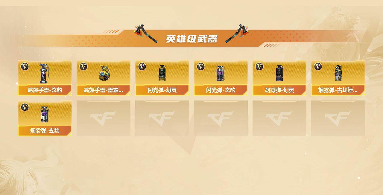 【英雄级武器】:AK47-火麒麟*2,M4A1-黑龙,M4A1-雷神,无影-神兵利器,黑武士-锦绣游龙,金色蔷薇-古蛇迷踪,M4A1-玫瑰精灵,QBZ03-金色蔷薇*2,烈火-动感闪耀,AK-47-猩红传说*2,王者冰魄-觉醒版,AK47-B-常胜将军,王者芳薇-觉醒版,AWM-裁决,王者幻神-觉醒版,加特林-炼狱,汤姆逊-烈龙*6,沙鹰-修罗*3,沙鹰-天神,天神-动感闪耀,修罗-古蛇迷踪,王者之灵-觉醒版,屠龙,屠龙-动感闪耀,王者之刺-觉醒版,高爆手雷-幻灵,高爆手雷-竞技荣光,手雷-动感闪耀,高爆手雷-古蛇迷踪,高爆手雷-玄豹,高爆手雷-雷霆王者,闪光弹-幻灵,闪光弹-玄豹,烟雾弹-幻灵*2,烟雾弹-古蛇迷踪,烟雾弹-玄豹*2,M4A1-赤狱骑士