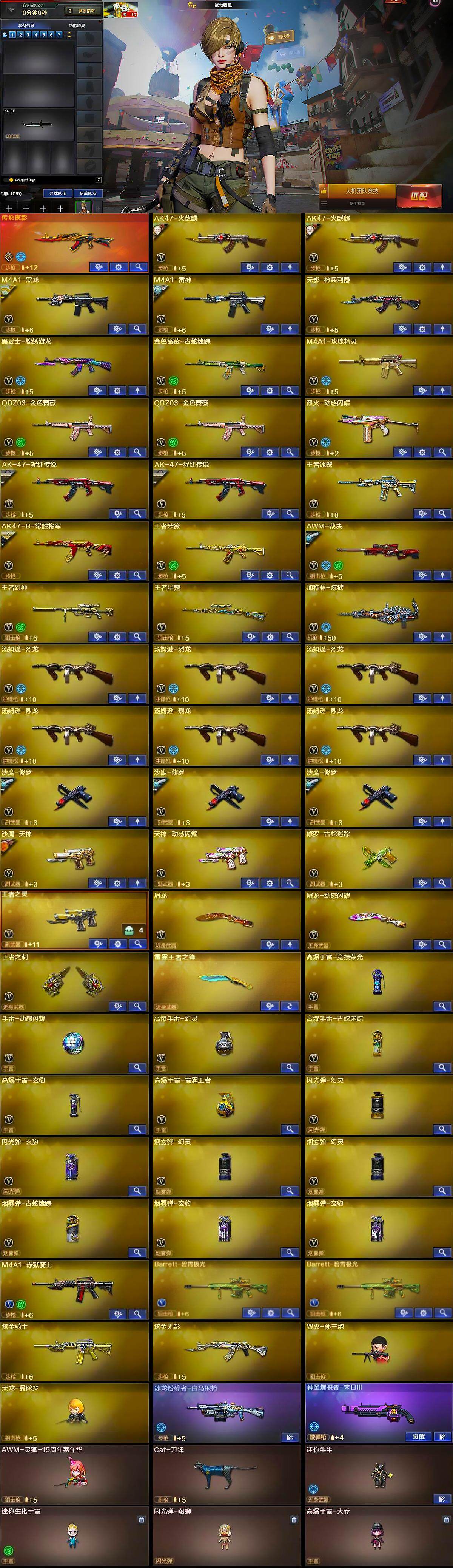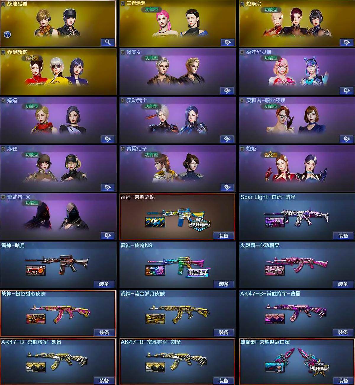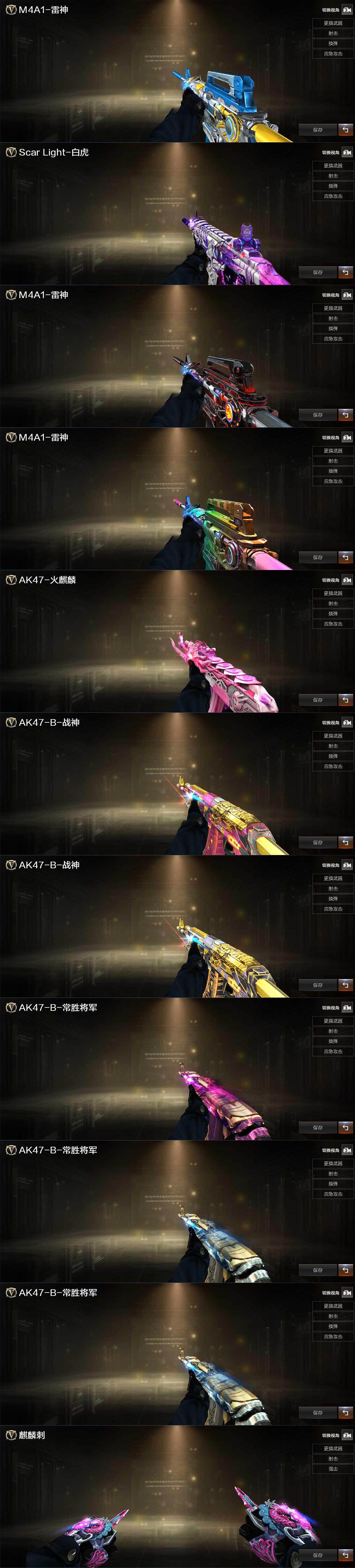【皮肤】:Scar Light-白虎-暗星,雷神-暗月,雷神-荣耀之魄,雷神-传奇N9,火麒麟-心动糖果,战神-粉色甜心皮肤,战神-流金岁月皮肤,AK47-B-常胜将军-曹操,AK47-B-常胜将军-刘备*2,麒麟刺-荣耀世冠白鲨