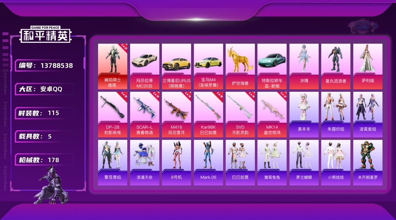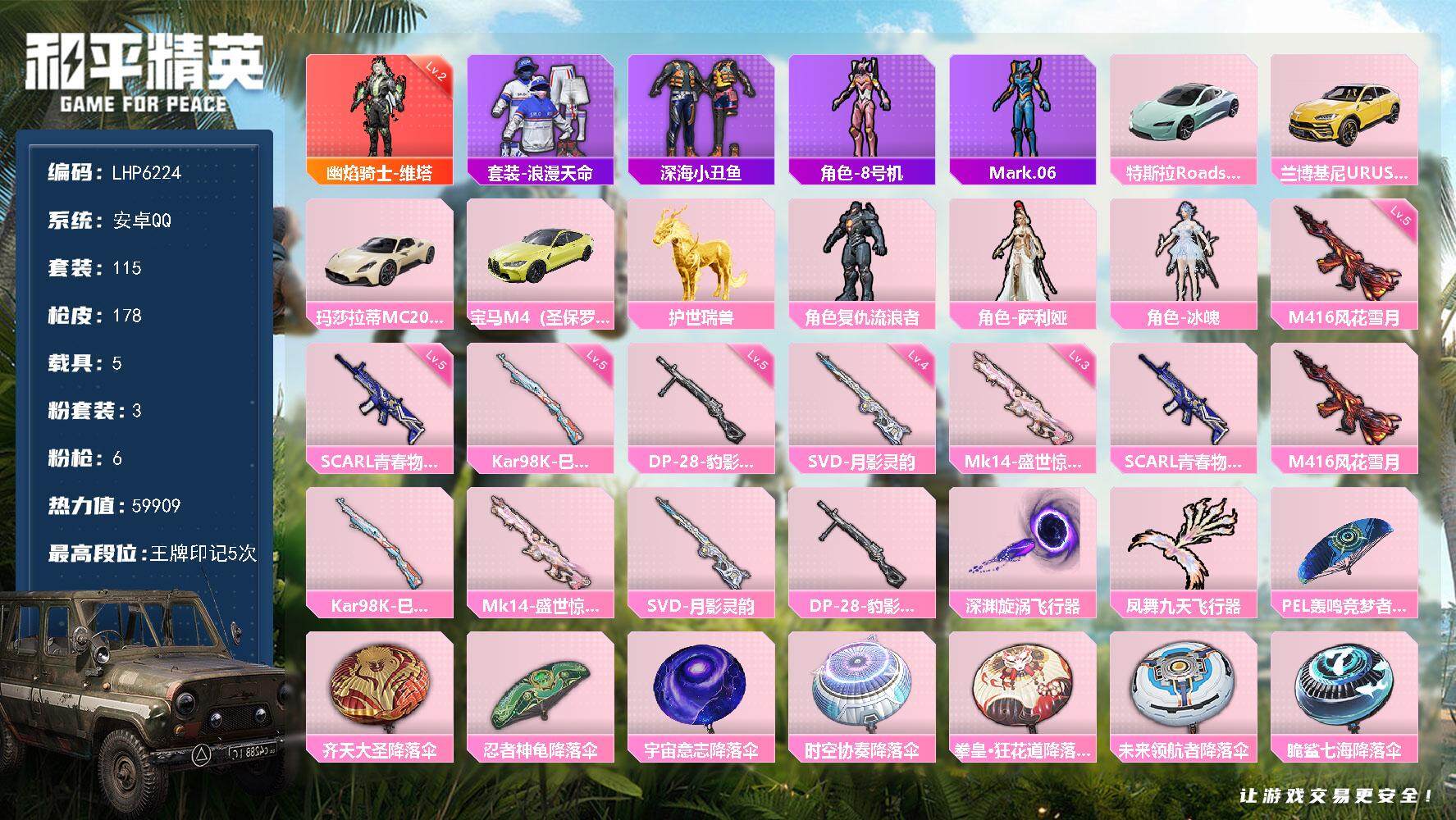[13788538]【店主推荐捡漏号!可直接换绑】/素材身法号 安卓 手Q-1神装-3粉装-6特效枪-5载具-4粉色飞行器-5.9w热力值-5王牌印记-115套装-178枪皮【红色神装等级】:幽焰骑士-维塔(二级)【热门品类】:套装-浪漫天命,套装-深海小丑鱼,角色-8号机,角色-Mark.06【粉色载具】:特斯拉Roadster(水滴蓝),兰博基尼URUS(明艳黄),玛莎拉蒂MC20(星石白),宝马M4(圣保罗黄),护世瑞兽【粉色套装】:角色-复仇流浪者,角色-萨利娅,角色-冰魄【粉色枪皮等级】:SCAR-L-青春物语(五级),M416-风花雪月(五级),Kar98K-巳巳如意(五级),Mk14-盛世惊鸿(三级),SVD-月影灵韵(四级),DP-28-豹影疾电(五级)【粉色飞行器】:深渊漩涡飞行器,凤舞九天飞行器
