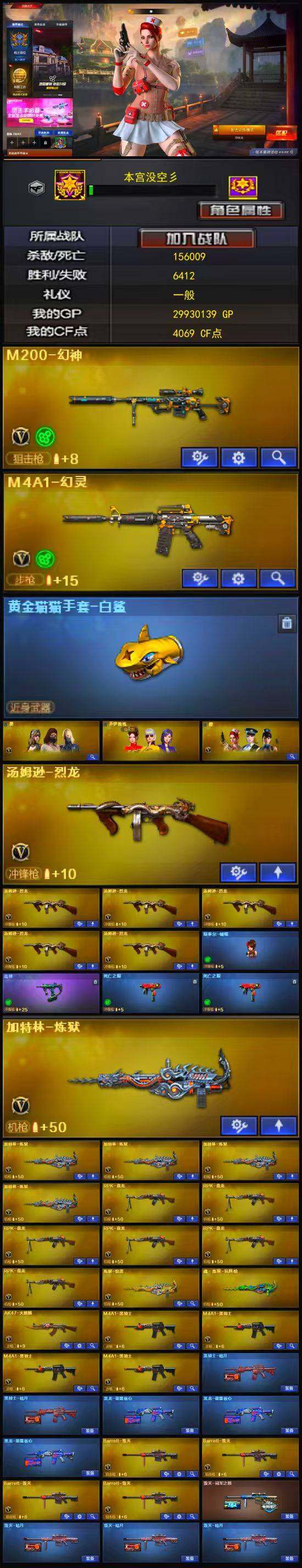 【热门武器】:M200-幻神,死亡之眼*2,毒蜂,M4A1-黑骑士*4,汤姆逊-烈龙*6,RPK-盘龙*6,加特林-炼狱*5,斯泰尔-蝴蝶,沙鹰-修罗*2,黄金猫猫手套-白鲨