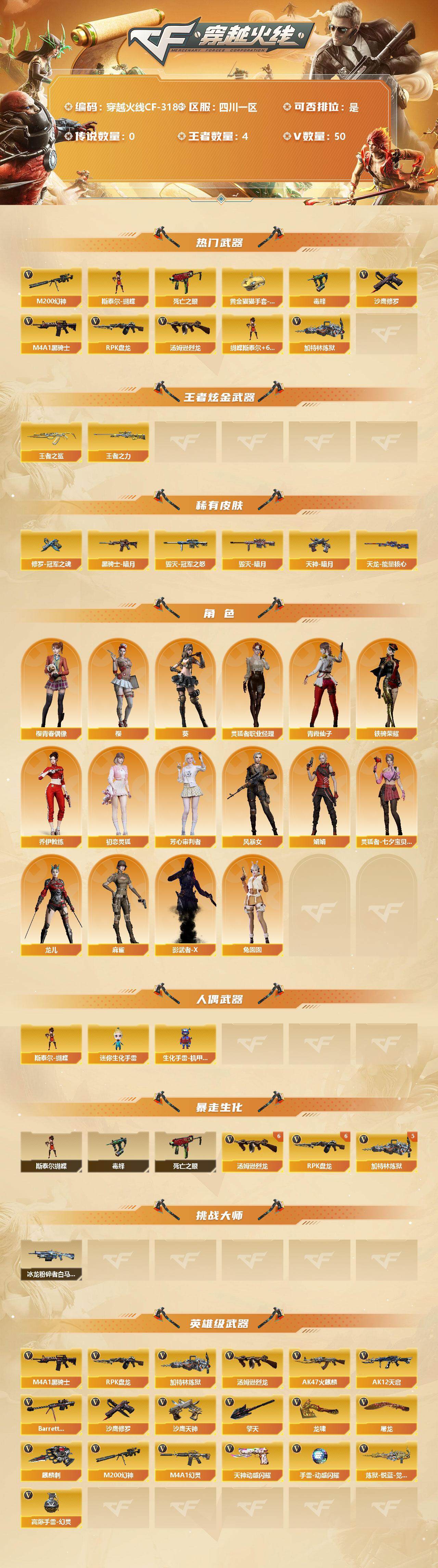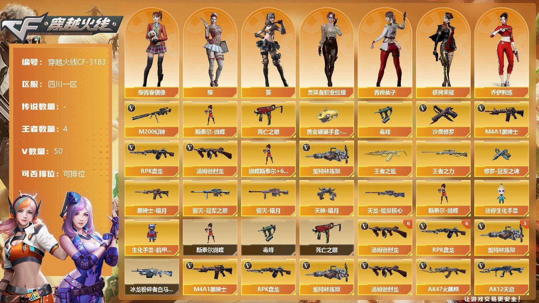 [13174481]四川一区-50V-4王者-0炫金 【热门武器】:M200-幻神,死亡之眼*2,毒蜂,M4A1-黑骑士*4,汤姆逊-烈龙*6,RPK-盘龙*6,加特林-炼狱*5,斯泰尔-蝴蝶,沙鹰-修罗*2,黄金猫猫手套-白鲨 【王者炫金武器】:王者之鲨,王者之力 【皮肤】:火麒麟-雷神,毁灭-暗月*3,毁灭-冠军之怒,黑龙-能量核心*3,黑骑士-暗月*2,无影-暗月*4,天启-暗月*3,天龙-能量核心,修罗-能量核心,修罗-冠军之魂,天神-暗月 【角色】:葵,樱,乔伊教练,初恋灵狐,芳心审判者,风暴女*2,娟娟,灵狐者-七夕宝贝,灵狐者-职业经理,龙儿,麻雀,青霞仙子,铁骑荣耀,兔囡囡,樱-青春偶像,影武者-X 【人偶武器】:斯泰尔-蝴蝶,迷你生化手雷,生化手雷-机甲核心 【暴走生化】:毒蜂,斯泰尔-蝴蝶,死亡之眼*2 【挑战大师】:冰龙粉碎者-白马银枪 【英雄级武器】:AK47-火麒麟,M4A1-黑骑士*4,AK12-天启,M4A1-幻灵,Barrett-毁灭*4,M200-幻神,RPK-盘龙*6,加特林-炼狱*5,炼狱-悦蓝-觉醒版,汤姆逊-烈龙*6,沙鹰-修罗*2,沙鹰-天神*4,天神-动感闪耀,屠龙*5,龙啸,擎天,麒麟刺*3,高爆手雷-幻灵,手雷-动感闪耀 【特殊枪械】:蝴蝶斯泰尔+6烈龙,4黑骑士,6烈龙,6盘龙,5炼狱,1蝴蝶斯泰尔