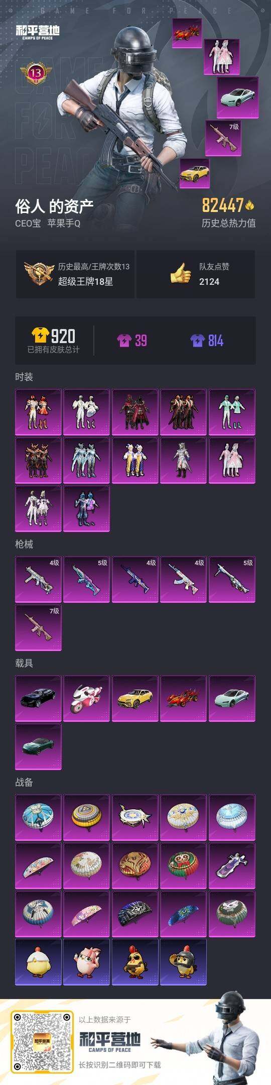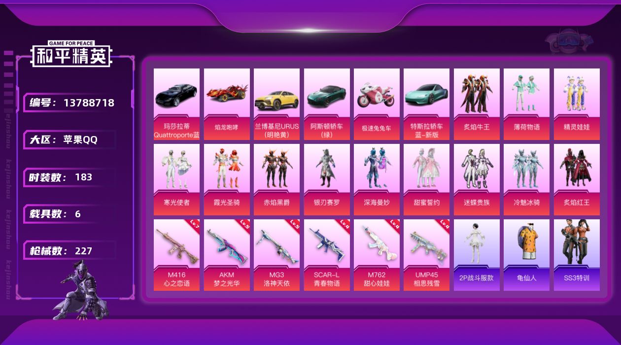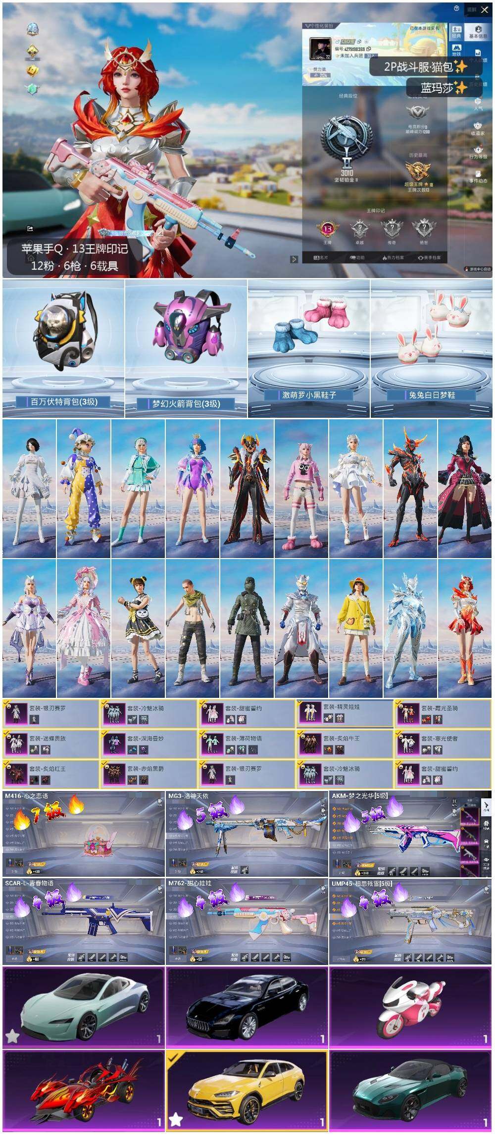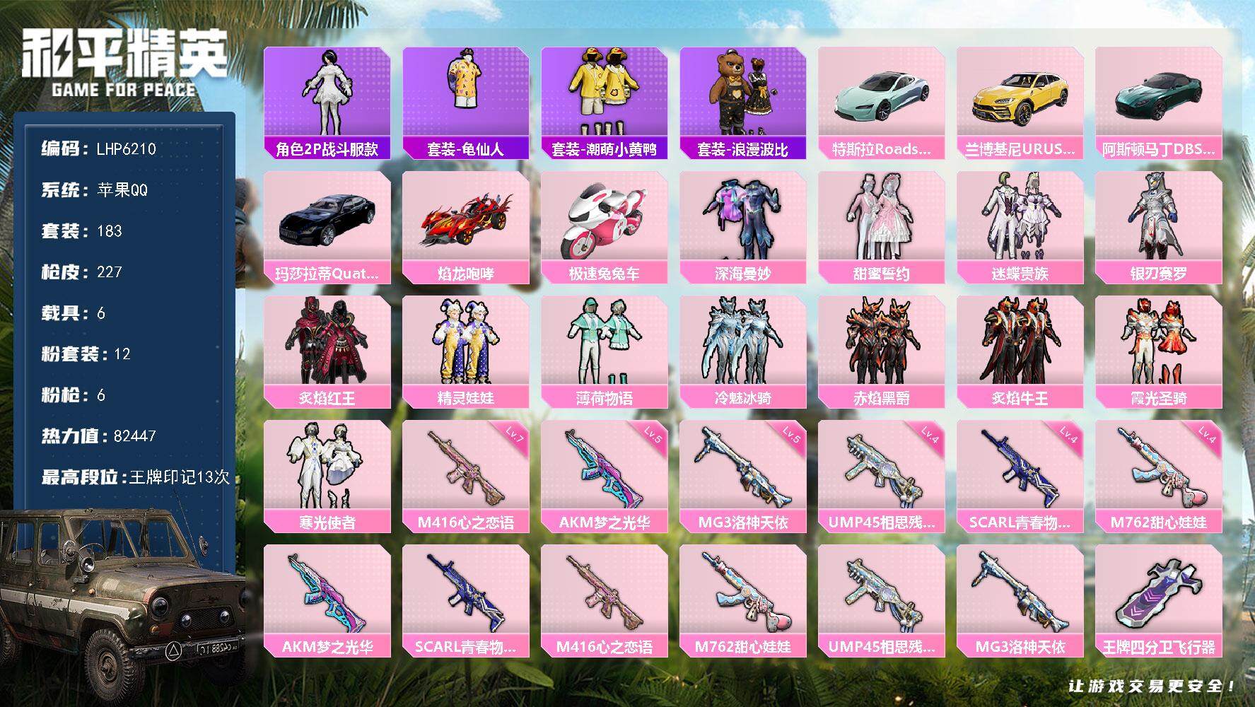 [13788718]【店主推荐捡漏号!可直接换绑】/素材身法号 苹果 手Q-12粉装-6特效枪-6载具-2粉色飞行器-8.2w热力值-13王牌印记-183套装-227枪皮【热门品类】:角色-2P战斗服款,套装-龟仙人,套装-潮萌小黄鸭,套装-浪漫波比【粉色载具】:特斯拉Roadster(水滴蓝),兰博基尼URUS(明艳黄),阿斯顿马丁DBS(绿),玛莎拉蒂Quattroporte(夜幕蓝),焰龙咆哮,极速兔兔车【粉色套装】:粉装-深海曼妙,粉装-甜蜜誓约,粉装-迷蝶贵族,粉装-银刃赛罗,粉装-炙焰红王,粉装-精灵娃娃,粉装-薄荷物语,粉装-冷魅冰骑,粉装-赤焰黑爵,粉装-炙焰牛王,粉装-霞光圣骑,粉装-寒光使者【粉色枪皮等级】:AKM-梦之光华(五级),SCAR-L-青春物语(四级),M416-心之恋语(七级),M762-甜心娃娃(四级),UMP45-相思残雪(四级),MG3-洛神天依(五级)【粉色飞行器】:王牌四分卫飞行器,圣光天使飞行器