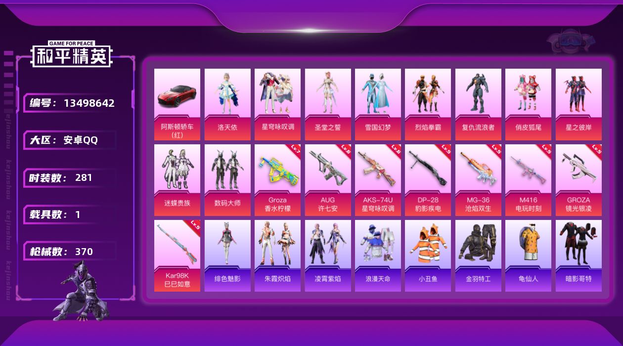 [13498642]【店主推荐捡漏号!可直接换绑】/素材身法号/地铁满天赋 安卓 手Q-11粉装-8特效枪-1载具-3粉色飞行器-12.4w热力值-24王牌印记-281套装-370枪皮【热门品类】:粉装-雪国幻梦,粉装-梦幻火箭,套装-浪漫天命,套装-都市猎人,套装-深海小丑鱼,套装-小丑鱼,套装-奇异狩猎者,套装-金羽特工,套装-龟仙人,套装-暗影哥特【粉色载具】:阿斯顿马丁DBS(红)【粉色套装】:粉装-数码大师,粉装-雪国幻梦,粉装-梦幻火箭,粉装-迷蝶贵族,粉装-俏皮狐尾,粉装-星之彼岸,粉装-烈焰拳霸,角色-洛天依,角色-复仇流浪者,角色-圣堂之誓,粉装-星穹咏叹调【粉色枪皮等级】:M416-电玩时刻(五级),GROZA-香水柠檬(七级),GROZA-镜光银凌(五级),AUG-许七安(六级),AKS-74U-星穹咏叹调(六级),Kar98K-巳巳如意(五级),DP-28-豹影疾电(五级),MG-36-沧焰双生(五级)【粉色飞行器】:锦绣火鲤飞行器,阿狸红飞行器,幽焰列车飞行器
