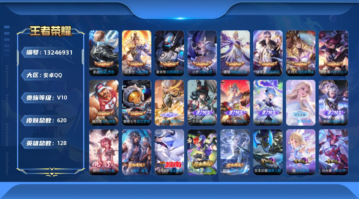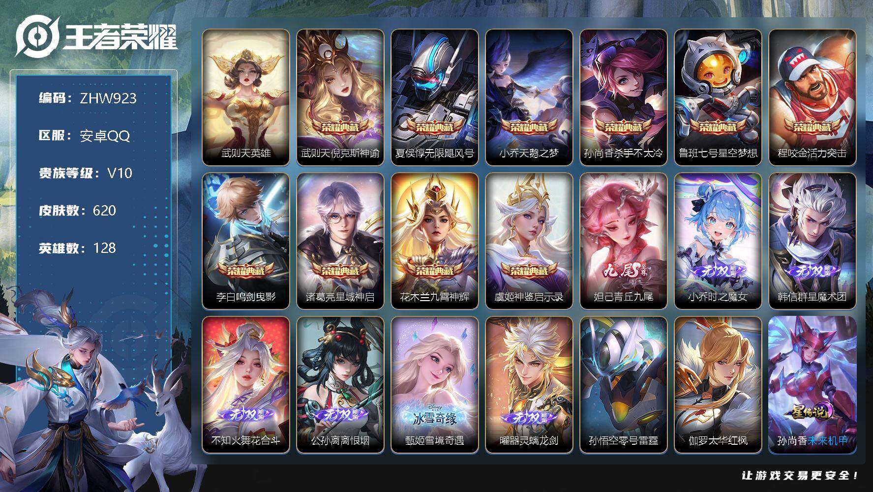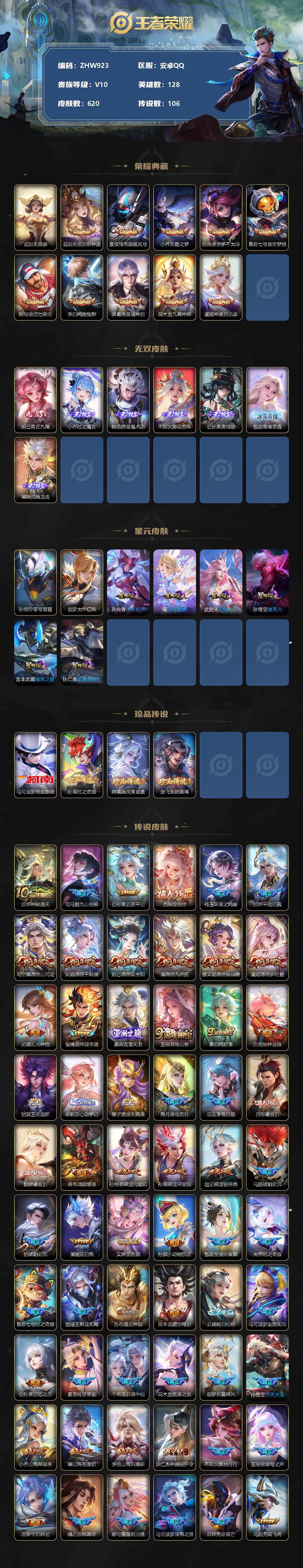 [13246931]安卓Q-V10-至尊星耀I段位-128英雄-620皮肤-10典藏-7无双-87星传说-4珍品传说-106传说-199史诗 【英雄全皮】:刘禅全皮,高渐离全皮,阿轲全皮,扁鹊全皮,白起全皮,典韦全皮,达摩全皮,司马懿全皮,姜子牙全皮,刘邦全皮,艾琳全皮,不知火舞全皮,娜可露露全皮,橘右京全皮,钟馗全皮,苍全皮,太乙真人全皮,鬼谷子全皮,大乔全皮,黄忠全皮,苏烈全皮,梦奇全皮,狂铁全皮,米莱狄全皮,李信全皮,盾山全皮,孙策全皮,猪八戒全皮,亚连全皮,马超全皮,海月全皮,曜全皮,西施全皮,鲁班大师全皮,蒙恬全皮,盘古全皮,阿古朵全皮,桑启全皮,夏洛特全皮,司空震全皮,金蝉全皮,赵怀真全皮,戈娅全皮,空空儿全皮,影全皮,海诺全皮 【荣耀典藏】:武则天英雄,武则天倪克斯神谕,夏侯惇无限飓风号,小乔天鹅之梦,孙尚香杀手不太冷,鲁班七号星空梦想,程咬金活力突击,李白鸣剑曳影,诸葛亮星域神启,花木兰九霄神辉,虞姬神鉴启示录 【无双皮肤】:妲己青丘九尾,小乔时之魔女,韩信群星魔术团,不知火舞花合斗,公孙离离恨烟,甄姬雪境奇遇,曜器灵螭龙剑 【珍品传说】:马可波罗怪盗基德,孙策时之奇旅,嫦娥器灵落星盏,张飞兔狲蓬尾 【传说皮肤】:后羿神树通天,司马懿九山相柳,公孙离云诺千山,西施续相思,杨玉环星之鸣奏,后羿千劫归真,司空震愿照山河定,女娲愿照千秋盛,妲己愿照众生和,澜愿照九州拓,蔡文姬愿照福禄聚,虞姬愿照岁时盈,云缨幻光神枪,裴擒虎祥瑞亨通,嬴政玄雷天君,王昭君映山客,桑启鸣野蒿,庄周牧神诗旅,铠冥王哈迪斯,朵莉亚心动手记,墨子黄金天蝎座,海月金乌负日,亚连落雪白狼,吕布曦玄引,貂蝉曦玄引,典韦战鼓燎原,孙尚香乘龙问璇玑,孙策乘龙淬吴钩,赵云乘龙铭钟鼎,马超琥珀纪元,铠琥珀纪元,澜逐花归海,艾琳觅芳踪,孙膑小动物乐团,甄姬至美化雀舞,大乔时之奇旅,鲁班七号时之奇旅,兰陵王影龙天霄,吕布遇见神鼓,宫本武藏惊梅引,云缨鹤归松栖,马可波罗妄想实况,公孙离记忆之芯,夏洛特浮生妄,干将莫邪画中仙,花木兰燃星之曲,伽罗炽翼辉光,孙悟空齐天大圣,小乔山海琳琅生,曜山海苍雷引,李信山海炽霜斩,狄仁杰神器狴犴令,不知火舞绯月行,王昭君星穹之声,百里守约碎云,橘右京枫霜尽,娜可露露前尘镜,马可波罗深海之息,后羿无尽星芒,马超无双飞将,大乔挚爱花嫁,孙策挚爱之约,露娜启示之音,蔡文姬花朝如约,女娲补天,孙