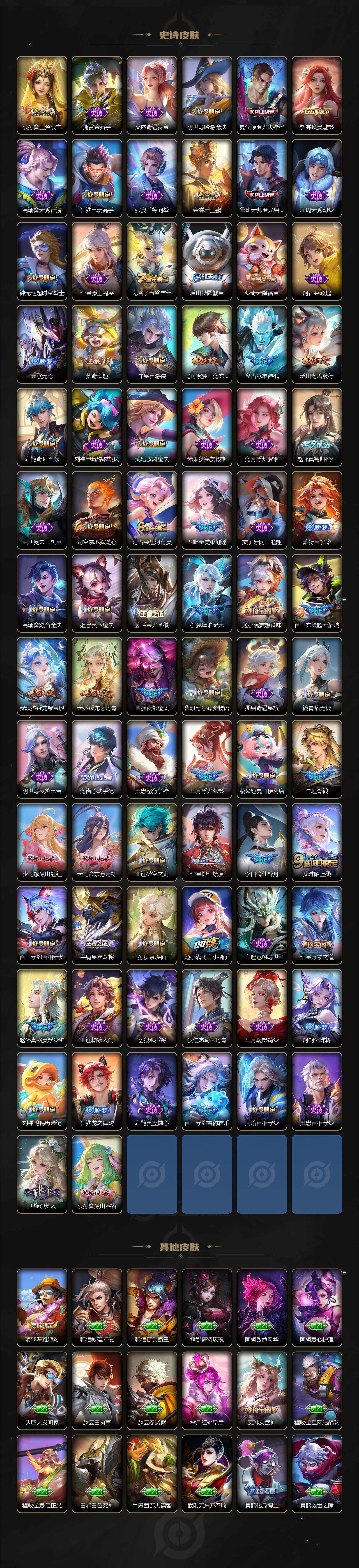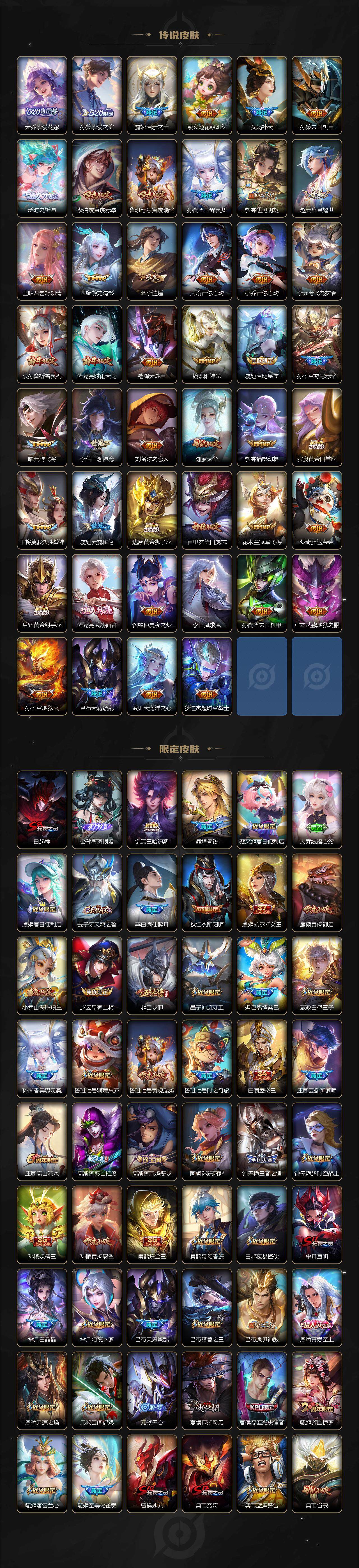 【英雄全皮】:刘禅全皮,高渐离全皮,阿轲全皮,扁鹊全皮,白起全皮,典韦全皮,达摩全皮,司马懿全皮,姜子牙全皮,刘邦全皮,艾琳全皮,不知火舞全皮,娜可露露全皮,橘右京全皮,钟馗全皮,苍全皮,太乙真人全皮,鬼谷子全皮,大乔全皮,黄忠全皮,苏烈全皮,梦奇全皮,狂铁全皮,米莱狄全皮,李信全皮,盾山全皮,孙策全皮,猪八戒全皮,亚连全皮,马超全皮,海月全皮,曜全皮,西施全皮,鲁班大师全皮,蒙恬全皮,盘古全皮,阿古朵全皮,桑启全皮,夏洛特全皮,司空震全皮,金蝉全皮,赵怀真全皮,戈娅全皮,空空儿全皮,影全皮,海诺全皮