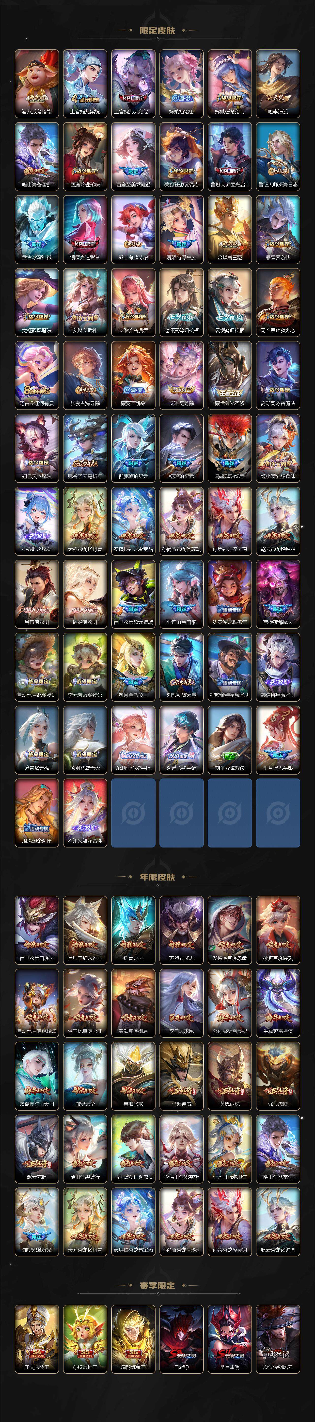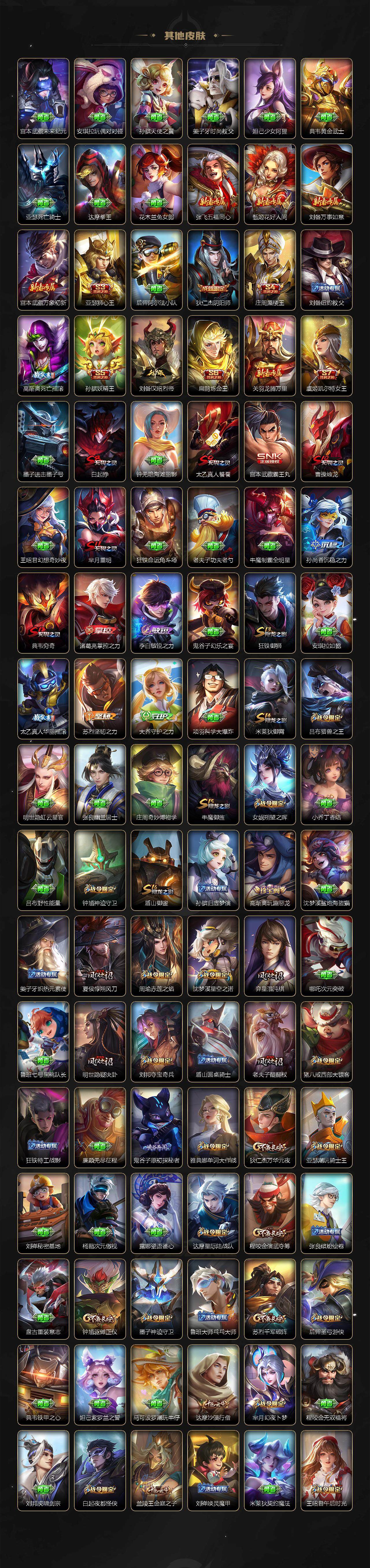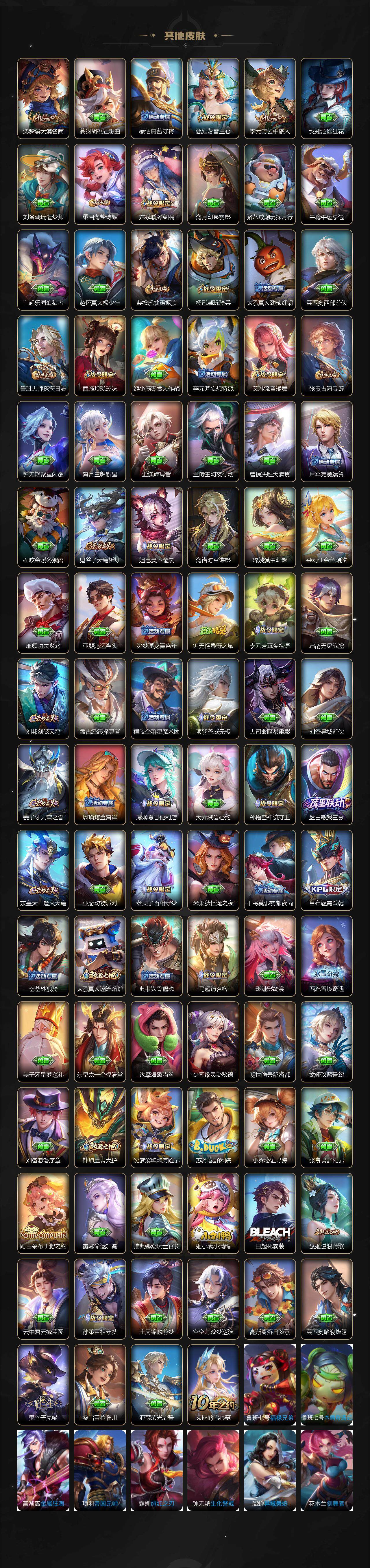 关羽冰锋战神,裴擒虎李小龙,上官婉儿梁祝,牛魔奔雷神使,公孙离祈雪灵祝,诸葛亮时雨天司,赵云龙胆,黄忠烈魂,张飞虎魄,马超神威,典韦岱宗,伽罗太华,上官婉儿天狼绘梦者,马可波罗逐梦之星,铠青龙志,百里玄策白虎志,苏烈玄武志,百里守约朱雀志,周瑜真爱至上,孙悟空至尊宝,妲己热情桑巴,干将莫邪冰霜恋舞曲,花木兰青春决赛季,蔡文姬奇迹圣诞,芈月白晶晶,庄周云端筑梦师,大乔白鹤梁神女,猪八戒猪悟能,廉颇寅虎·御盾,孙尚香异界灵契,老夫子圣诞老人,孙悟空孙行者,镜匿光追影者,韩信傲雪梅枪,鲁班七号寅虎·瑞焰,孙膑寅虎·展翼,杨玉环寅虎·心曲,裴擒虎寅虎·赤拳,云中君时之祈愿,瑶时之祈愿,女娲补天,公孙离玉兔公主,露娜启示之音,夏侯惇匿光决锋者,后羿无尽星芒,马可波罗深海之息,金蝉唐三藏,娜可露露前尘镜,橘右京枫霜尽,鲁班大师匿光启智者,王昭君星穹之声,不知火舞绯月行,盾山梦圆繁星,马可波罗山海·玄木吟,盘古冰霜神祇,瑶山海·碧波行,兰陵王影龙天霄,西施至美·乘鲤谣,甄姬至美·化雀舞,桑启鸣野蒿,艾琳陌上桑,王昭君映山客,澜愿照·九州拓,蔡文姬愿照·福禄聚,虞姬愿照·岁时盈,司空震愿照·山河定,妲己愿照·众生和,女娲愿照·千秋盛