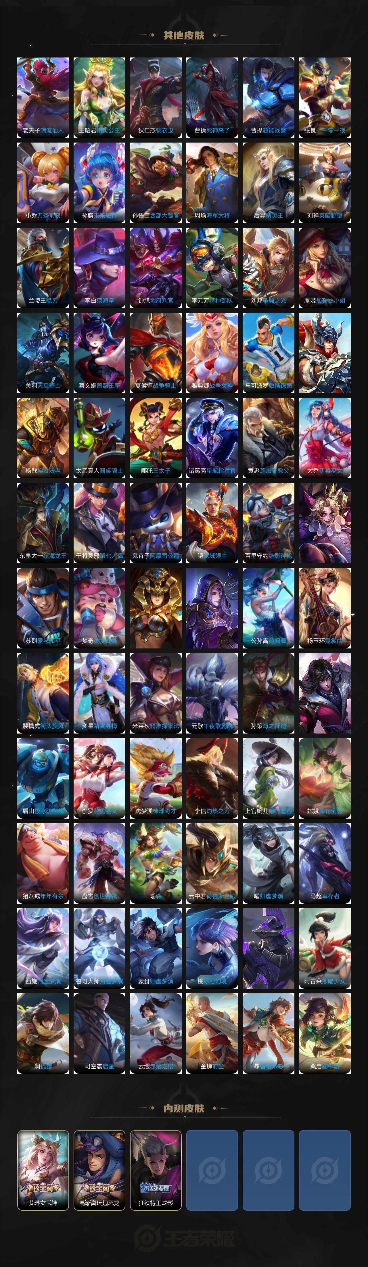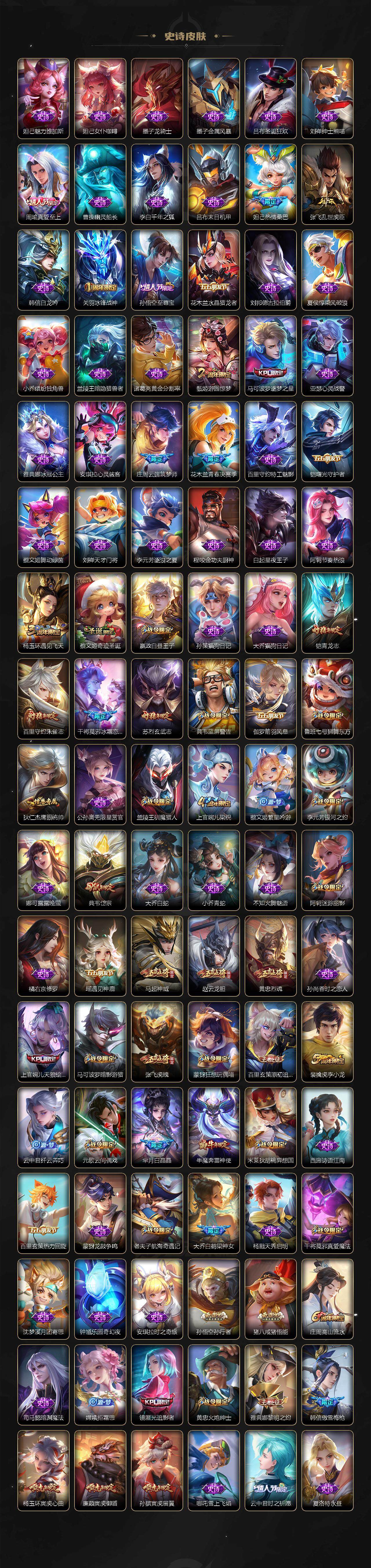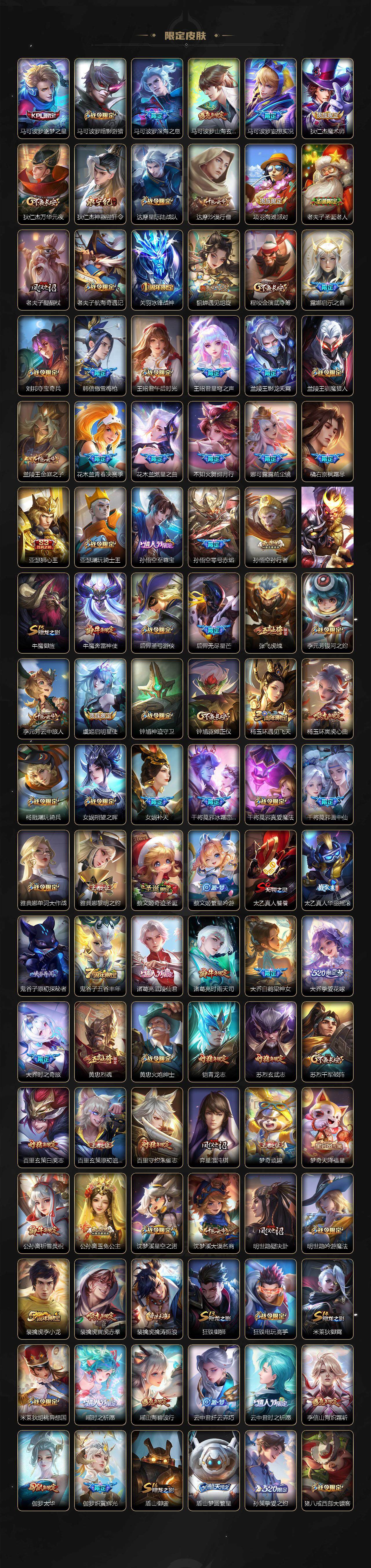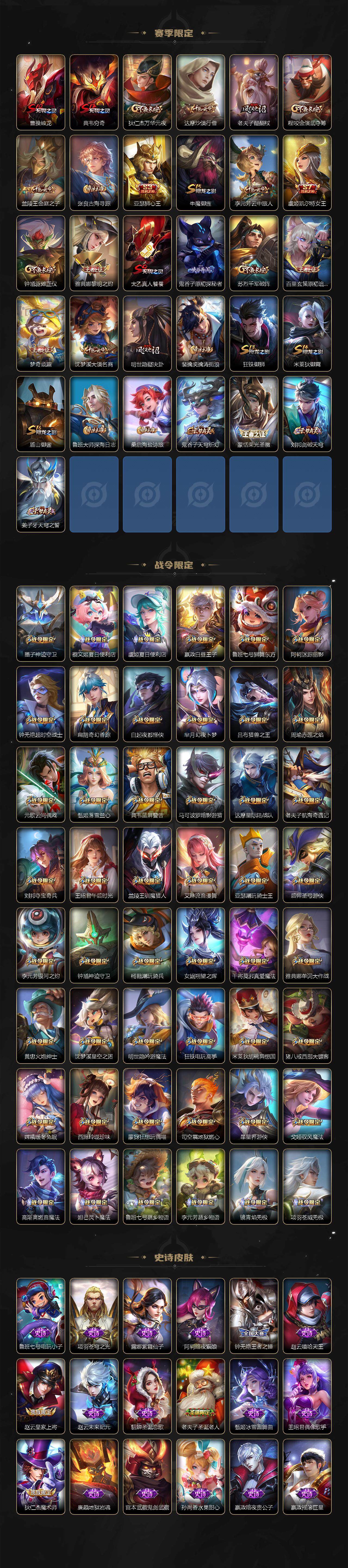 关羽冰锋战神,裴擒虎李小龙,上官婉儿梁祝,牛魔奔雷神使,公孙离祈雪灵祝,诸葛亮时雨天司,赵云龙胆,黄忠烈魂,张飞虎魄,马超神威,典韦岱宗,伽罗太华,上官婉儿天狼绘梦者,马可波罗逐梦之星,铠青龙志,百里玄策白虎志,苏烈玄武志,百里守约朱雀志,周瑜真爱至上,孙悟空至尊宝,妲己热情桑巴,干将莫邪冰霜恋舞曲,花木兰青春决赛季,蔡文姬奇迹圣诞,芈月白晶晶,庄周云端筑梦师,大乔白鹤梁神女,猪八戒猪悟能,廉颇寅虎·御盾,孙尚香异界灵契,老夫子圣诞老人,孙悟空孙行者,镜匿光追影者,韩信傲雪梅枪,鲁班七号寅虎·瑞焰,孙膑寅虎·展翼,杨玉环寅虎·心曲,裴擒虎寅虎·赤拳,云中君时之祈愿,瑶时之祈愿,女娲补天,公孙离玉兔公主,露娜启示之音,夏侯惇匿光决锋者,后羿无尽星芒,马可波罗深海之息,金蝉唐三藏,娜可露露前尘镜,橘右京枫霜尽,鲁班大师匿光启智者,王昭君星穹之声,不知火舞绯月行,盾山梦圆繁星,马可波罗山海·玄木吟,盘古冰霜神祇,瑶山海·碧波行,兰陵王影龙天霄,西施至美·乘鲤谣,甄姬至美·化雀舞,桑启鸣野蒿,艾琳陌上桑,王昭君映山客,澜愿照·九州拓,蔡文姬愿照·福禄聚,虞姬愿照·岁时盈,司空震愿照·山河定,妲己愿照·众生和,女娲愿照·千秋盛