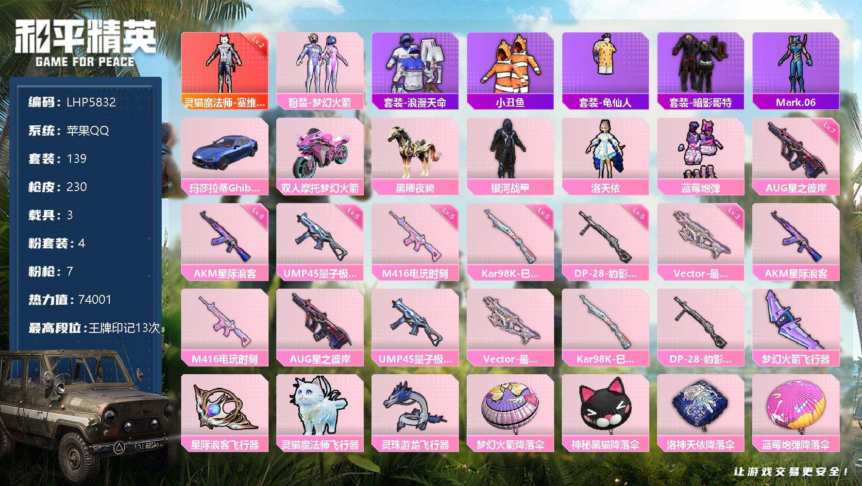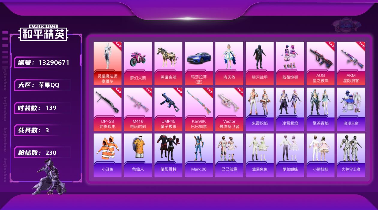 [13290671]素材身法号/地铁满天赋 苹果 手Q-1神装-4粉装-7特效枪-3载具-4粉色飞行器-7.4w热力值-13王牌印记-139套装-230枪皮【红色神装等级】:灵猫魔法师-塞维尔(二级)【热门品类】:粉装-梦幻火箭,套装-浪漫天命,套装-小丑鱼,套装-龟仙人,套装-暗影哥特,角色-Mark.06【粉色载具】:玛莎拉蒂Ghibli(蓝),双人摩托-梦幻火箭,黑曜夜骑【粉色套装】:粉装-银河战甲,粉装-梦幻火箭,角色-洛天依,粉装-蓝莓炮弹【粉色枪皮等级】:AKM-星际浪客(六级),M416-电玩时刻(五级),AUG-星之彼岸(七级),UMP45-量子极限(五级),Vector-最终圣卫者(三级),Kar98K-巳巳如意(五级),DP-28-豹影疾电(五级)【粉色飞行器】:梦幻火箭飞行器,星际浪客飞行器,灵猫魔法师飞行器,灵珠游龙飞行器
