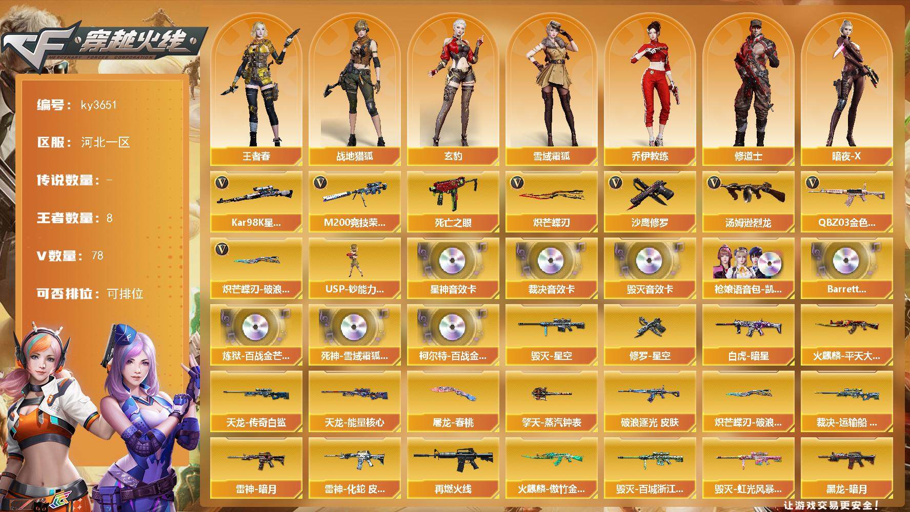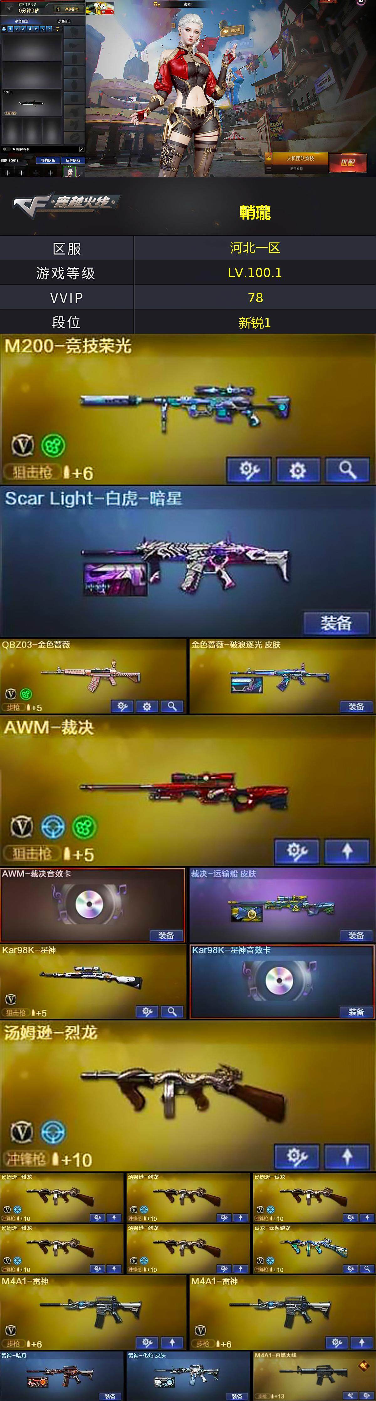 [13819508]河北一区-78V-8王者-0炫金 【热门武器】:QBZ03-金色蔷薇,M200-竞技荣光,死亡之眼,Kar98K-星神,汤姆逊-烈龙*6,USP-钞能力灵狐,沙鹰-修罗*3,炽芒蝶刃,炽芒蝶刃-破浪逐光 皮肤 【音效卡】:Barrett-毁灭音效卡,AWM-裁决音效卡,枪娘语音包-凯萨林,Kar98K-星神音效卡,Barrett-碧霄极光音效卡,炼狱-百战金芒-庆典舞曲音效卡,死神-雪域霜狐-怀旧音效卡,柯尔特-百战金芒-庆典舞曲音效卡 【皮肤】:Scar Light-白虎-暗星,金色蔷薇-破浪逐光 皮肤,裁决-运输船 皮肤,雷神-暗月,雷神-化蛇 皮肤,M4A1-再燃火线,火麒麟-平天大圣,火麒麟-傲竹金蛇 皮肤,毁灭-星空,毁灭-百城浙江 皮肤,毁灭-虹光风暴 皮肤,黑龙-暗月,无影-能量核心,天龙-能量核心,AWM-天龙-传奇白鲨,修罗-能量核心*2,修罗-星空,屠龙-春桃 皮肤,屠龙-破浪逐光 皮肤,屠龙-惊鸿 皮肤,龙啸-蛇姬 皮肤,轻型军用手斧-再燃火线,擎天-蒸汽钟表 皮肤,麒麟刺-萌杀皮肤,炽芒蝶刃-破浪逐光 皮肤 【角色】:玄豹,战地猎狐,王者春,雪域霜狐,乔伊教练,修道士,暗夜-X,北极狐-X,电竞少女,芳心审判者,娟娟,兰妹妹,0号玩家,灵狐者-X,龙儿,曼陀罗-X,潜龙队-X,蛇姬,斯沃特-X,兔囡囡,维纳斯,新娜塔莎,雪莉杨-摸金校尉,夜玫瑰-宠粉,影武者-X 【人偶武器】:USP-钞能力灵狐,迷你生化手雷,迷你艾比 【暴走生化】:死亡之眼,超级对讲机 【挑战大师】:激光毁灭者III 【英雄级武器】:M4A1-千变,AK47-火麒麟,M4A1-雷神*2,AK47-无影,AK12-天启,无影-神兵利器,FAMAS G2-天戎,死神-雪域霜狐,M4A1-玫瑰精灵*2,QBZ03-金色蔷薇,超新星-悦享-觉醒版,黑骑士-海王,AWM-天龙,Barrett-毁灭,AWM-裁决,Kar98K-星神,M200-竞技荣光,炼狱-百战金芒,汤姆逊-烈龙*6,烈龙-云海游龙,AA-12-雷霆,沙鹰-修罗*3,沙鹰-天神*5,屠龙*5,龙啸,擎天,麒麟刺*2,擎天-竞技荣光,炽芒蝶刃,麒麟刺-百战金芒,丛林匕首-玄豹,高爆手雷-竞技荣光*8,闪光弹-竞技荣光*6,闪光弹-玄豹,闪光弹-雷霆王者-觉醒版*2,烟雾弹-竞技荣光*6,烟雾弹-玄豹*3,烟雾弹-雷霆