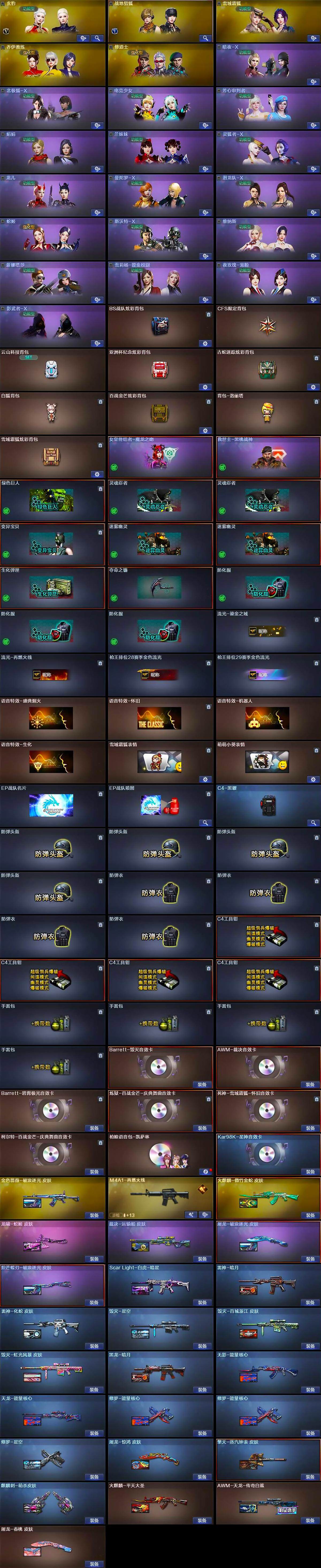 【英雄级武器】:M4A1-千变,AK47-火麒麟,M4A1-雷神*2,AK47-无影,AK12-天启,无影-神兵利器,FAMAS G2-天戎,死神-雪域霜狐,M4A1-玫瑰精灵*2,QBZ03-金色蔷薇,超新星-悦享-觉醒版,黑骑士-海王,AWM-天龙,Barrett-毁灭,AWM-裁决,Kar98K-星神,M200-竞技荣光,炼狱-百战金芒,汤姆逊-烈龙*6,烈龙-云海游龙,AA-12-雷霆,沙鹰-修罗*3,沙鹰-天神*5,屠龙*5,龙啸,擎天,麒麟刺*2,擎天-竞技荣光,炽芒蝶刃,麒麟刺-百战金芒,丛林匕首-玄豹,高爆手雷-竞技荣光*8,闪光弹-竞技荣光*6,闪光弹-玄豹,闪光弹-雷霆王者-觉醒版*2,烟雾弹-竞技荣光*6,烟雾弹-玄豹*3,烟雾弹-雷霆