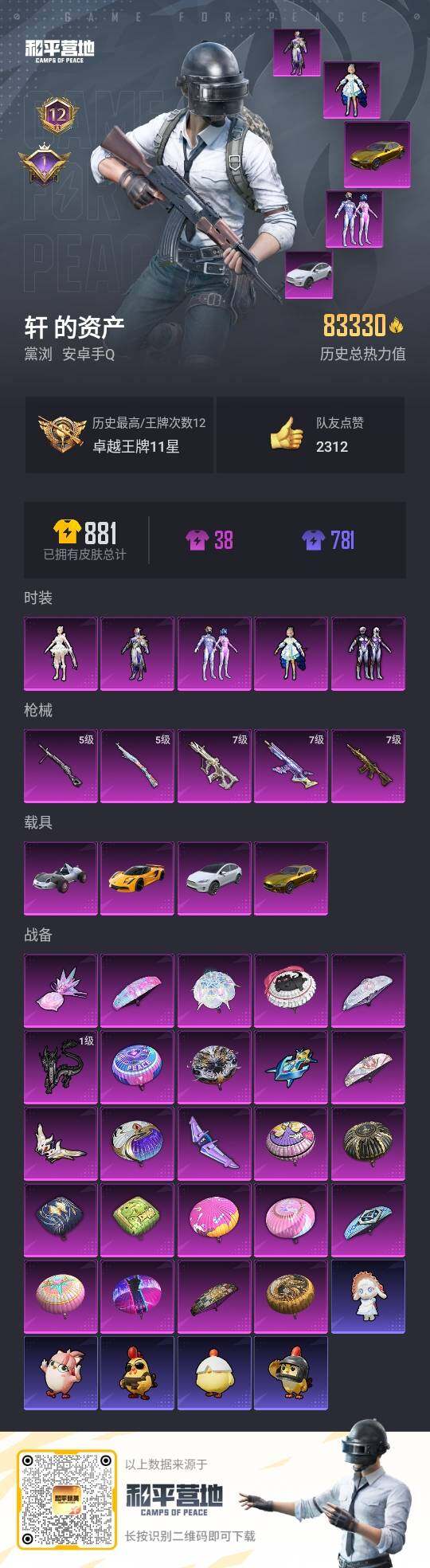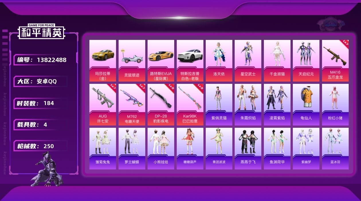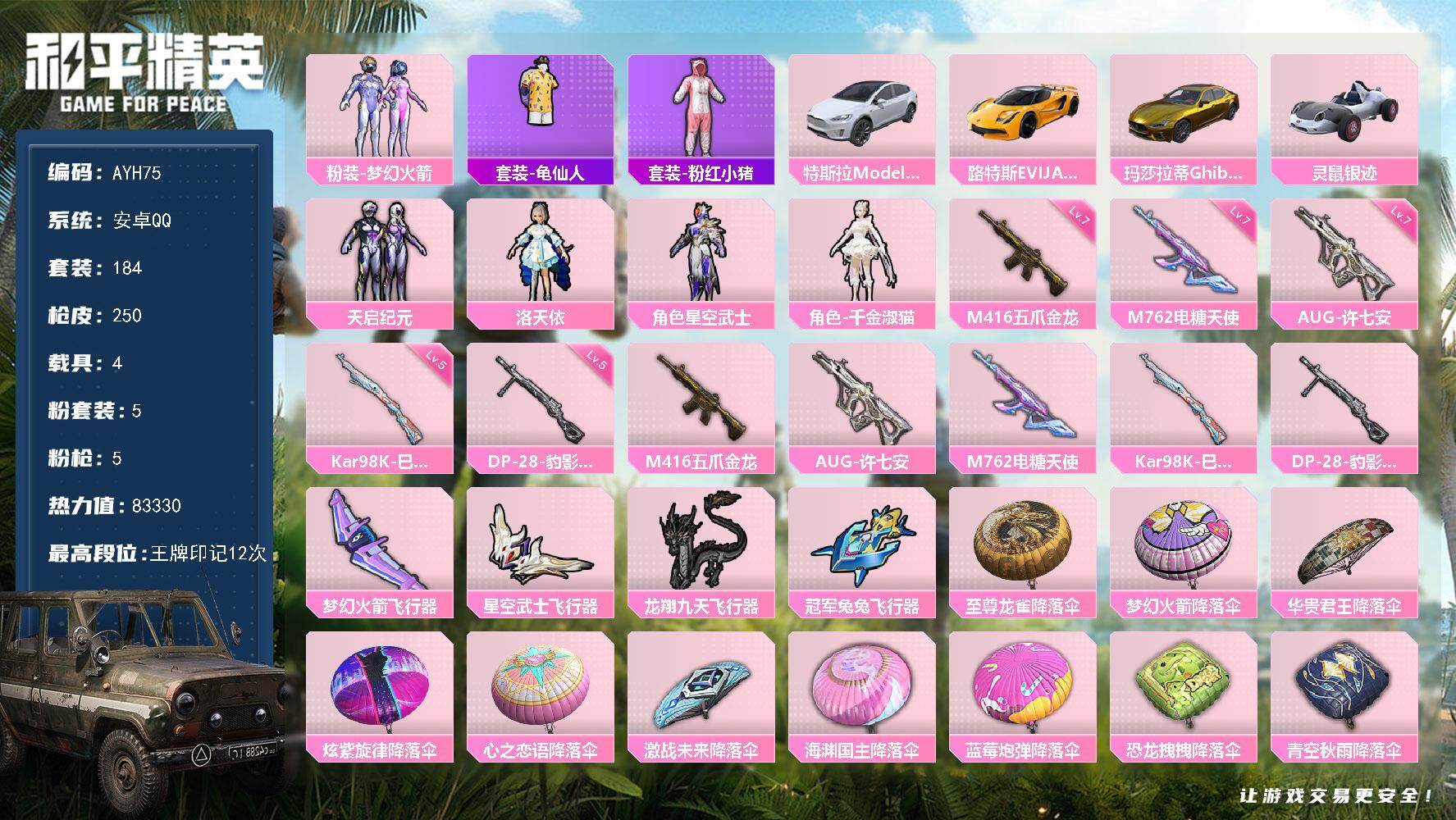 [13822488]【店主推荐捡漏号!可直接换绑】安卓 手Q-5粉装-5特效枪-4载具-5粉色飞行器-83330热力值-12王牌印记-184套装-250枪皮【热门品类】:粉装-梦幻火箭,套装-龟仙人,套装-粉红小猪【粉色载具】:特斯拉Model X(珍珠白),路特斯EVIJA(星际黄),玛莎拉蒂Ghibli(金),灵鼠银迹【粉色套装】:粉装-梦幻火箭,粉装-天启纪元,角色-洛天依,角色-星空武士,角色-千金淑猫【粉色枪皮等级】:M416-五爪金龙(七级),AUG-许七安(七级),M762-电糖天使(七级),Kar98K-巳巳如意(五级),DP-28-豹影疾电(五级)【粉色枪皮】:M416-五爪金龙,AUG-许七安,M762-电糖天使,Kar98K-巳巳如意,DP-28-豹影疾电【粉色飞行器】:梦幻火箭飞行器,星空武士飞行器,龙翔九天飞行器,冠军兔兔飞行器