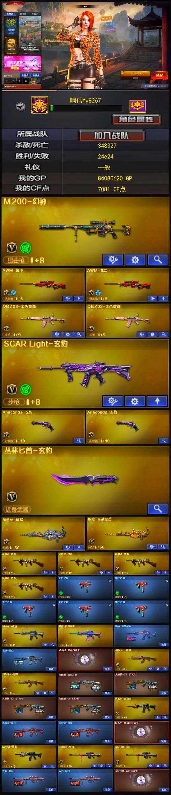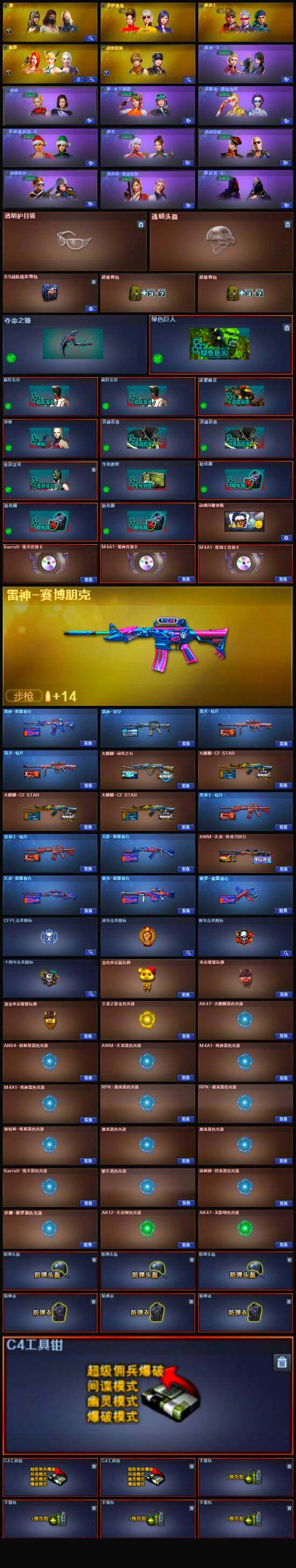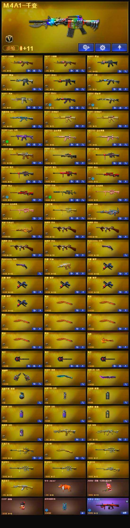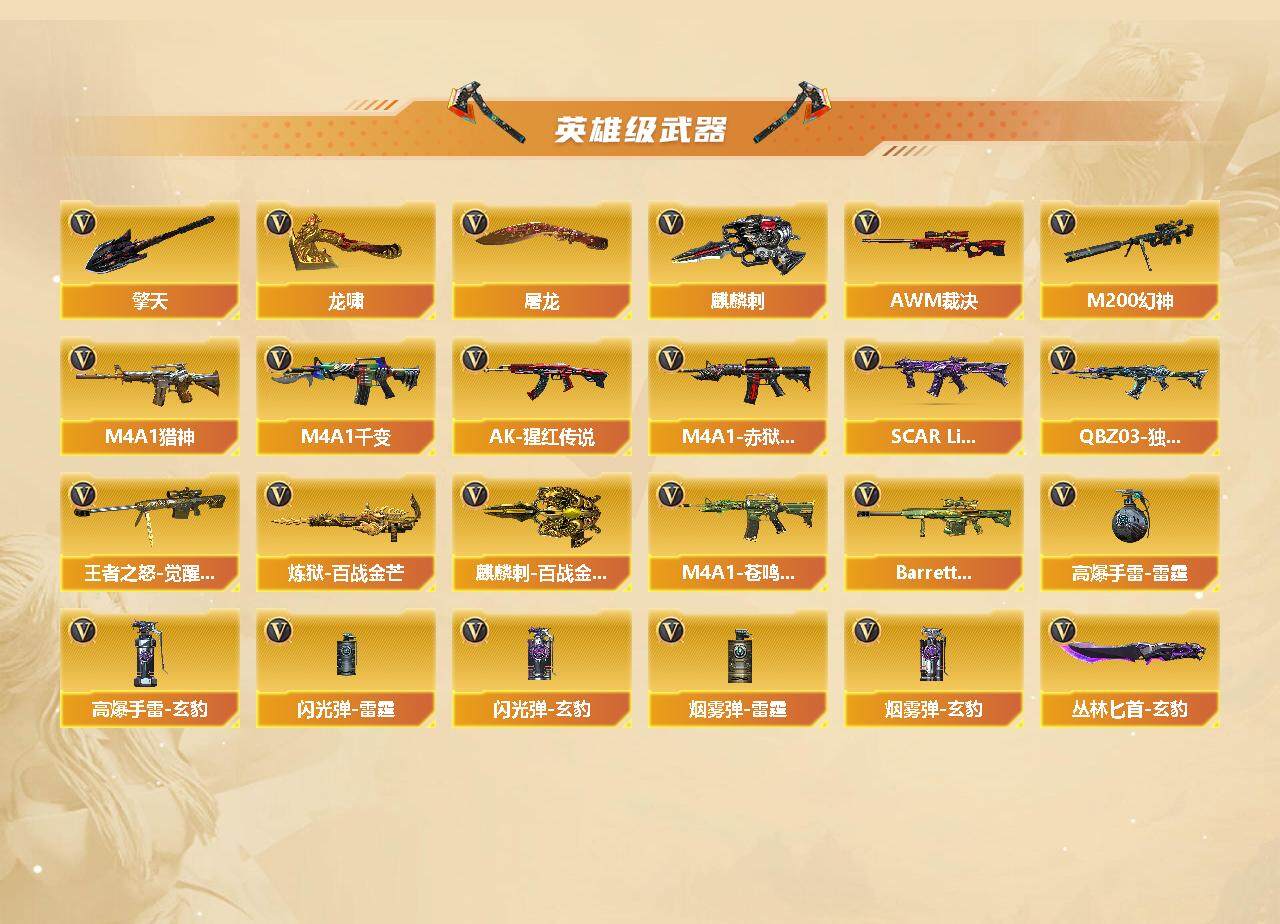 【英雄级武器】:M4A1-千变,AK47-火麒麟*2,M4A1-黑龙,M4A1-雷神,M4A1-黑骑士,AK47-无影,M4A1-死神,AK47-黑武士,AN94-超新星,SCAR Light-玄豹,QBZ03-独角-IV,M4A1-玫瑰精灵*2,QBZ03-金色蔷薇*2,M4A1-猎神,AK-47-猩红传说,AWM-天龙,Barrett-毁灭*2,Barrett-极光,AWM-裁决*2,M200-幻神,Barrett-金色蔷薇*2,王者之怒-觉醒版,加特林-炼狱,炼狱-百战金芒,汤姆逊-烈龙*4,沙鹰-修罗*5,沙鹰-天神,Anaconda-玄豹*2,屠龙*7,龙啸,擎天*3,麒麟刺,麒麟刺-百战金芒,丛林匕首-玄豹,高爆手雷-雷霆,高爆手雷-玄豹,闪光弹-雷霆,闪光弹-玄豹*2,烟雾弹-雷霆,烟雾弹-玄豹,M4A1-赤狱骑士,M4A1-苍鸣雷神,Barrett-碧霄极光