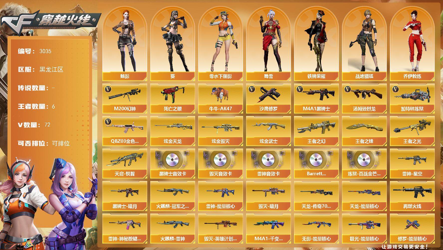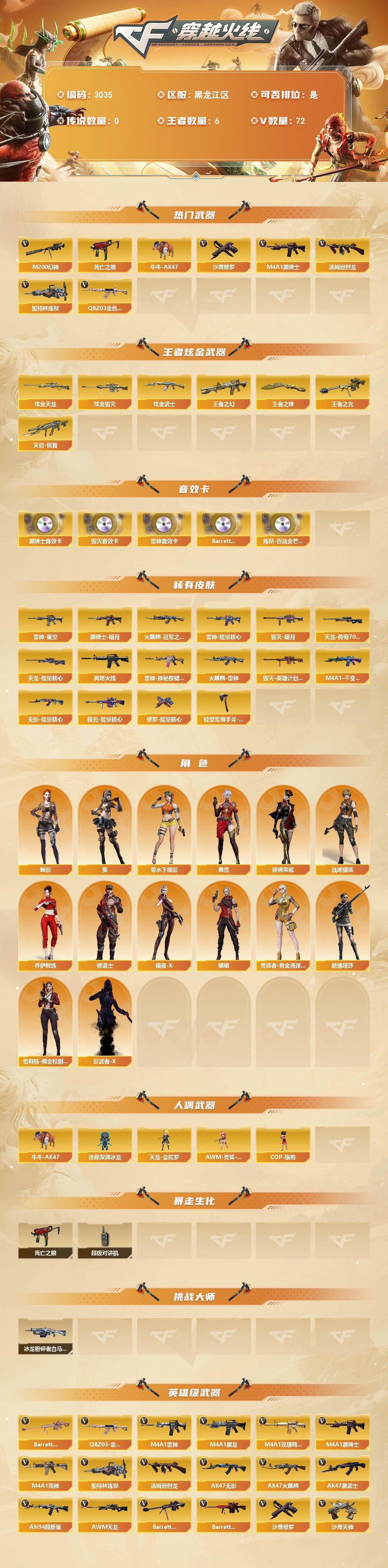 [13522612]黑龙江区-72V-6王者-5炫金 【热门武器】:QBZ03-金色蔷薇*2,M200-幻神,死亡之眼*5,牛牛-AK47,M4A1-黑骑士,汤姆逊-烈龙*4,加特林-炼狱,沙鹰-修罗*5 【王者炫金武器】:天启-悦智,王者之幻,王者之光,王者之锋,炫金武士,炫金毁灭*3,炫金天龙 【音效卡】:M4A1-雷神音效卡,M4A1-黑骑士音效卡,Barrett-毁灭音效卡,Barrett-碧霄极光音效卡,炼狱-百战金芒-庆典舞曲音效卡 【皮肤】:雷神-能量核心,雷神-星空,M4A1-再燃火线,雷神-神秘按键 皮肤,火麒麟-雷神,火麒麟-冠军之心,毁灭-暗月*2,毁灭-英雄计划 皮肤,M4A1-千变-孔明皮肤,黑骑士-暗月*2,无影-能量核心,天龙-能量核心,AWM-天龙-传奇70KG,极光-能量核心,修罗-能量核心,轻型军用手斧-再燃火线 【角色】:葵,魅影,战地猎狐,乔伊教练,修道士,暗夜-X,娟娟,零-水下丽影,灵狐者-黄金海岸,蜀雪,铁骑荣耀,新娜塔莎,雪莉杨-摸金校尉,影武者-X 【人偶武器】:天龙-曼陀罗,AWM-灵狐-15周年嘉年华,COP-旗袍,牛牛-AK47,迷你深渊冰龙 【暴走生化】:死亡之眼*5,超级对讲机 【挑战大师】:冰龙粉碎者-白马银枪 【英雄级武器】:M4A1-千变,AK47-火麒麟*2,M4A1-黑龙,M4A1-雷神,M4A1-黑骑士,AK47-无影,M4A1-死神,AK47-黑武士,AN94-超新星,SCAR Light-玄豹,QBZ03-独角-IV,M4A1-玫瑰精灵*2,QBZ03-金色蔷薇*2,M4A1-猎神,AK-47-猩红传说,AWM-天龙,Barrett-毁灭*2,Barrett-极光,AWM-裁决*2,M200-幻神,Barrett-金色蔷薇*2,王者之怒-觉醒版,加特林-炼狱,炼狱-百战金芒,汤姆逊-烈龙*4,沙鹰-修罗*5,沙鹰-天神,Anaconda-玄豹*2,屠龙*7,龙啸,擎天*3,麒麟刺,麒麟刺-百战金芒,丛林匕首-玄豹,高爆手雷-雷霆,高爆手雷-玄豹,闪光弹-雷霆,闪光弹-玄豹*2,烟雾弹-雷霆,烟雾弹-玄豹,M4A1-赤狱骑士,M4A1-苍鸣雷神,Barrett-碧霄极光 【道具】:BS战队炫彩背包,亚洲杯纪念炫彩背包,炫彩背包,百战金芒炫彩背包,超级背包*2,女皇终结者-魔龙之吻,救世主-黑桃战神,妩媚妖姬,绿