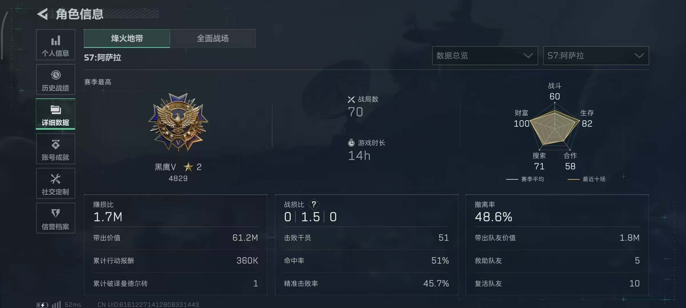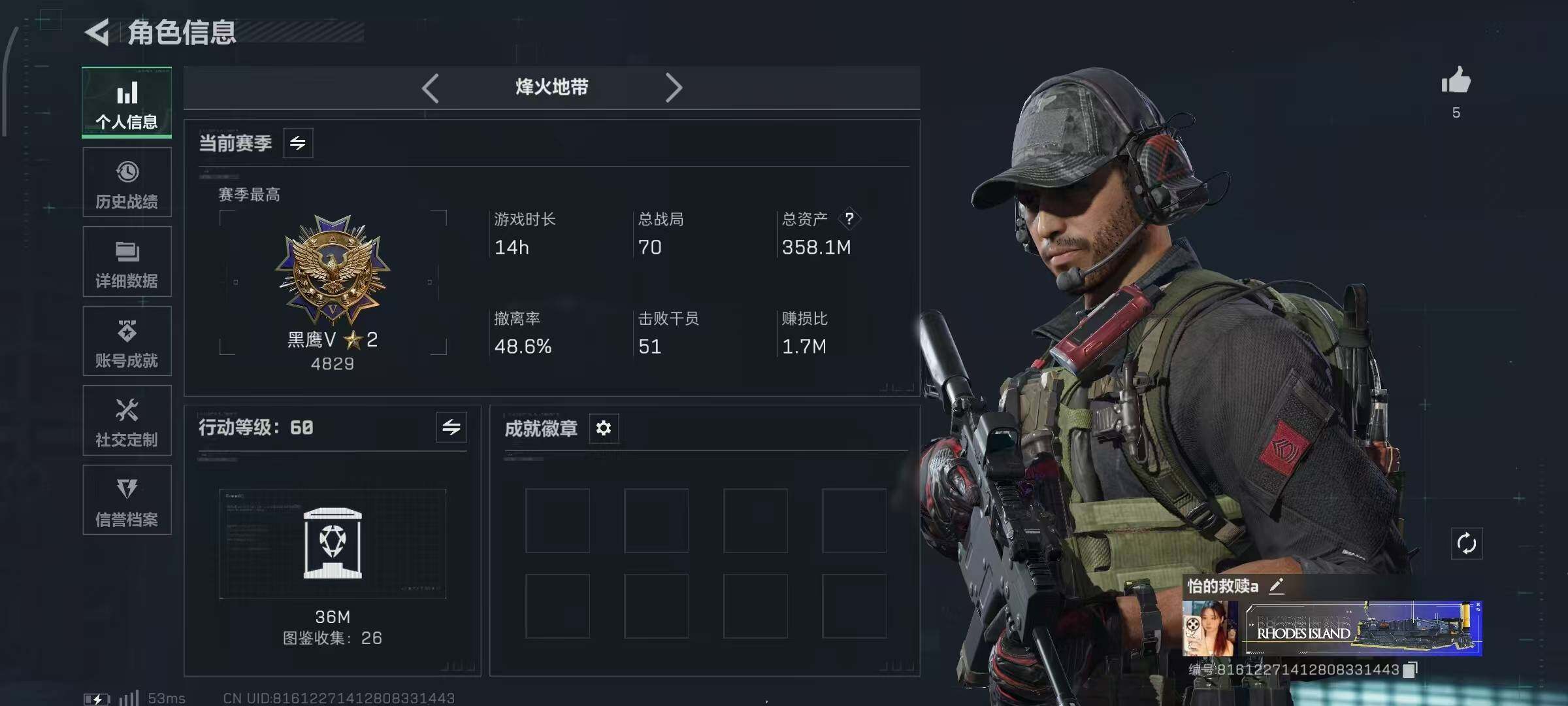 [13822978]可直接换绑 总资产358m 184472k哈伏币-358.1m流动资产-60烽火等级-黑鹰-1战场等级-无军衔