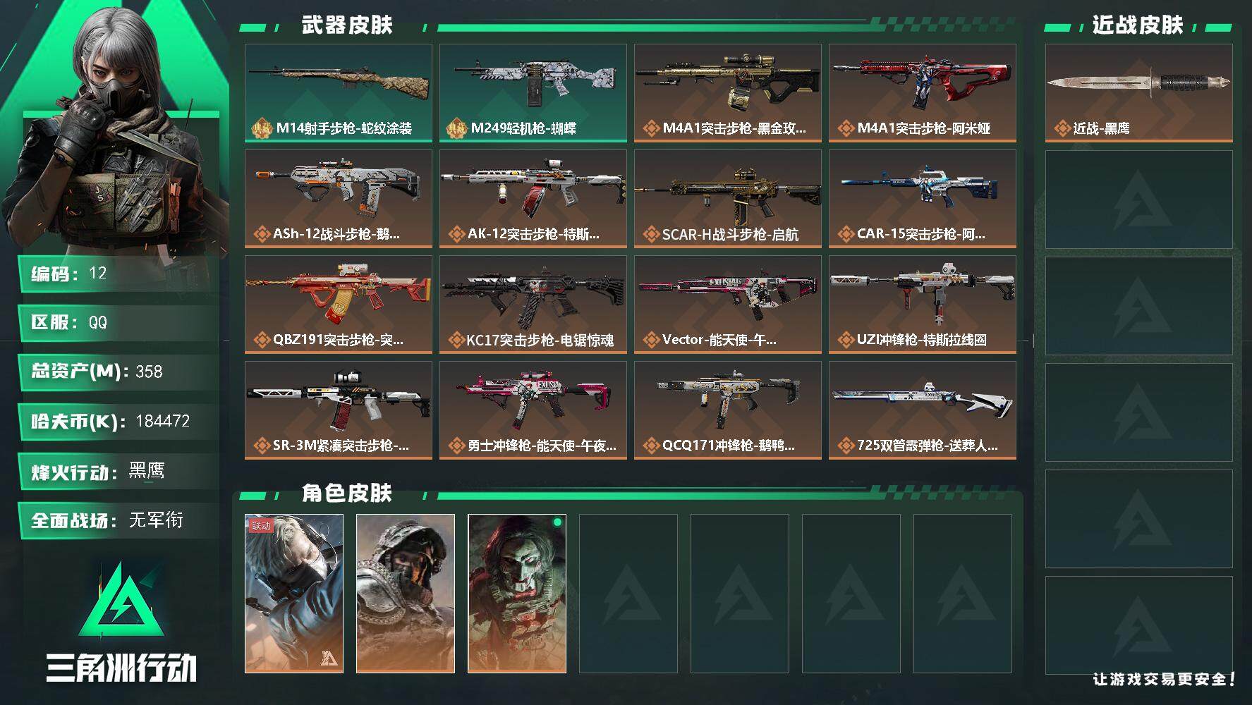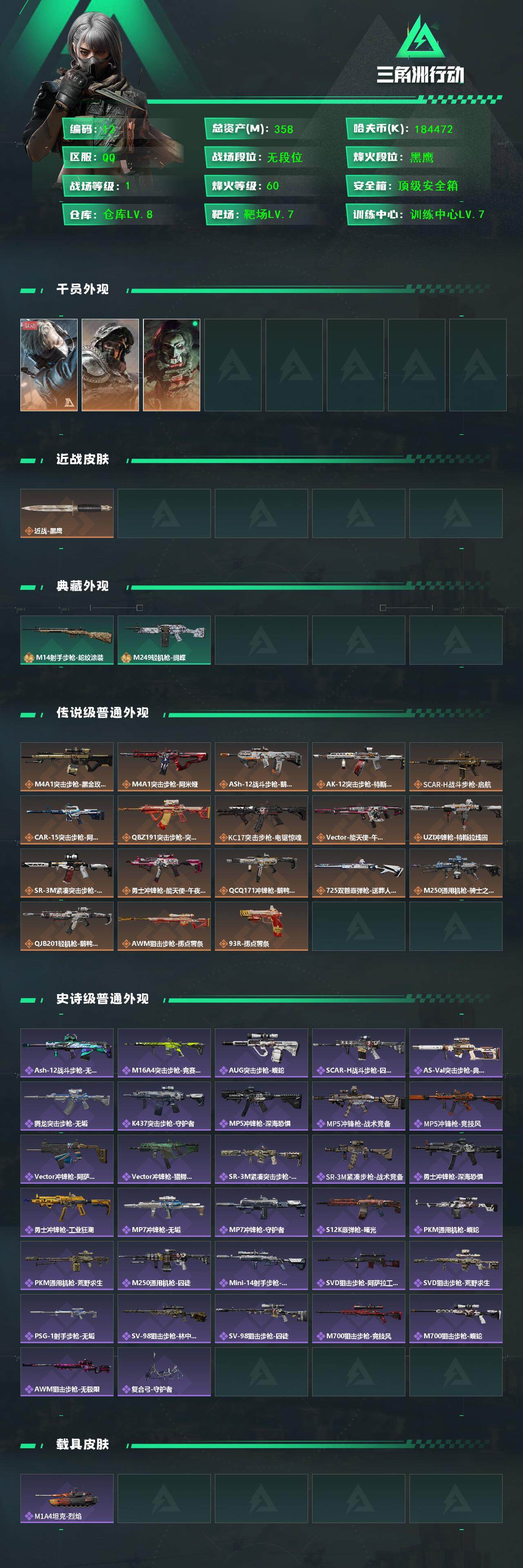 [13822978]可直接换绑 总资产358m 184472k哈伏币-358.1m流动资产-60烽火等级-黑鹰-1战场等级-无军衔 【干员外观】:蜂医-送葬人·无题密令,深蓝-不破誓约,红狼-电锯惊魂 【近战皮肤】:近战-黑鹰 【典藏外观】:M14射手步枪-蛇纹涂装,M249轻机枪-蝴蝶 【传说级普通外观】:M4A1突击步枪-蚀金玫瑰,M4A1突击步枪-阿米娅,ASh-12战斗步枪-鹅鸭杀,AK-12突击步枪-特斯拉线圈,SCAR-H战斗步枪-启航,CAR-15突击步枪-阿米娅,腾龙突击步枪-捞点薯条,KC17突击步枪-电锯惊魂,Vector冲锋枪-能天使-午夜邮差,UZI冲锋枪-特斯拉线圈,SR-3M紧凑突击步枪-特斯拉线圈,勇士冲锋枪-能天使-午夜邮差,QCQ171冲锋枪-鹅鸭杀,725双管霰弹枪-送葬人-无题密令,M250通用机枪-骑士之心,QJB201轻机枪-鹅鸭杀,AWM狙击步枪-捞点薯条,93R-捞点薯条 【史诗级普通外观】:ASh-12战斗步枪-无极限,M16A4突击步枪-竞赛选手,AUG突击步枪-蝮蛇,SCAR-H战斗步枪-囚徒,AS Val突击步枪-典狱官,腾龙突击步枪-无垢,K437突击步枪-守护者,MP5冲锋枪-深海恐惧,MP5冲锋枪-战术竞备,MP5冲锋枪-竞技风,Vector冲锋枪-阿萨拉文明,Vector冲锋枪-猎鳄行动,SR-3M紧凑突击步枪-荒野求生,SR-3M紧凑突击步枪-战术竞备,勇士冲锋枪-深海恐惧,勇士冲锋枪-工业狂潮,MP7冲锋枪-无垢,MP7冲锋枪-守护者,S12K霰弹枪-曙光,PKM通用机枪-蝮蛇,PKM通用机枪-荒野求生,M250通用机枪-囚徒,Mini-14射手步枪-守护者,SVD狙击步枪-阿萨拉工艺,SVD狙击步枪-荒野求生,PSG-1射手步枪-无垢,SV-98狙击步枪-林中猎手,SV-98狙击步枪-囚徒,M700狙击步枪-竞技风,M700狙击步枪-蝮蛇,AWM狙击步枪-无极限,复合弓-守护者 【稀有级普通外观】:K416突击步枪-酷炫狂拽,K416突击步枪-虎啸,SCAR-H战斗步枪-荣耀列队,腾龙突击步枪-雪崩,K437突击步枪-天狼星,MP5冲锋枪-弄臣,MP5冲锋枪-虎啸,Vector冲锋枪-先锋,UZI冲锋枪-前沿科技,SMG-45-行动开启,SMG-45冲锋枪-幻影结构,SR-3M紧凑突击步枪-雪崩,M1014霰弹枪-幻