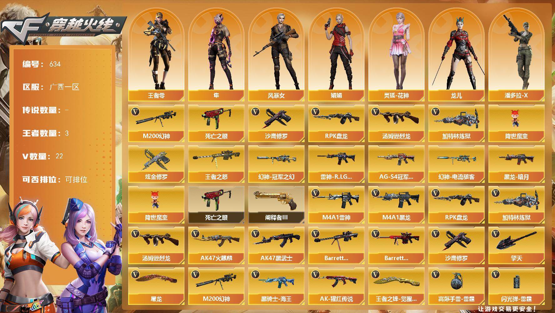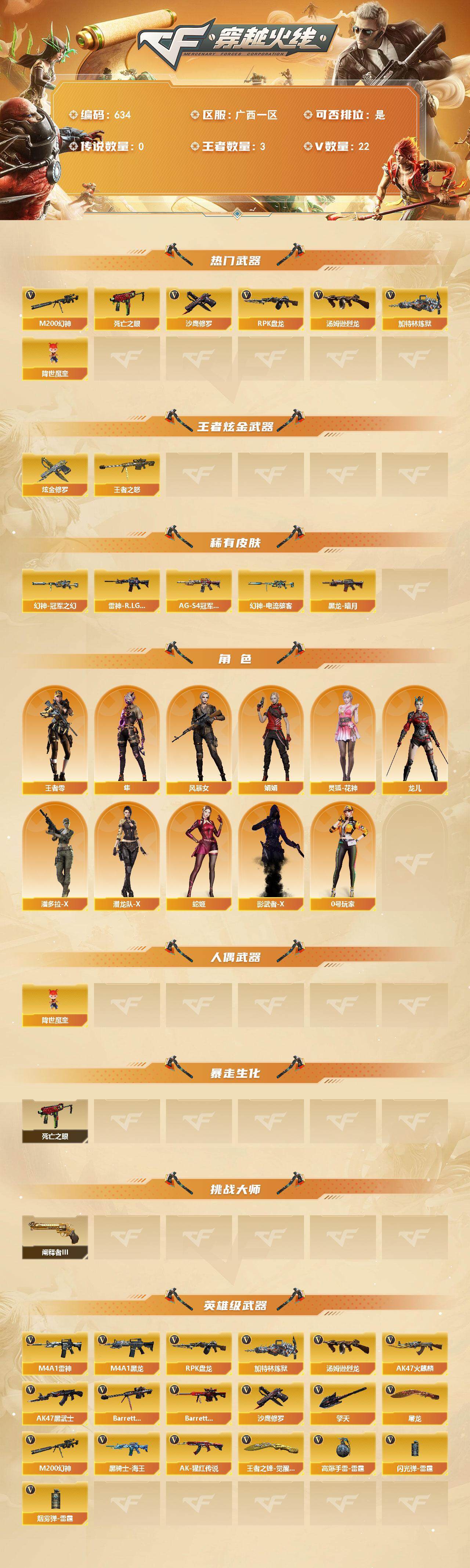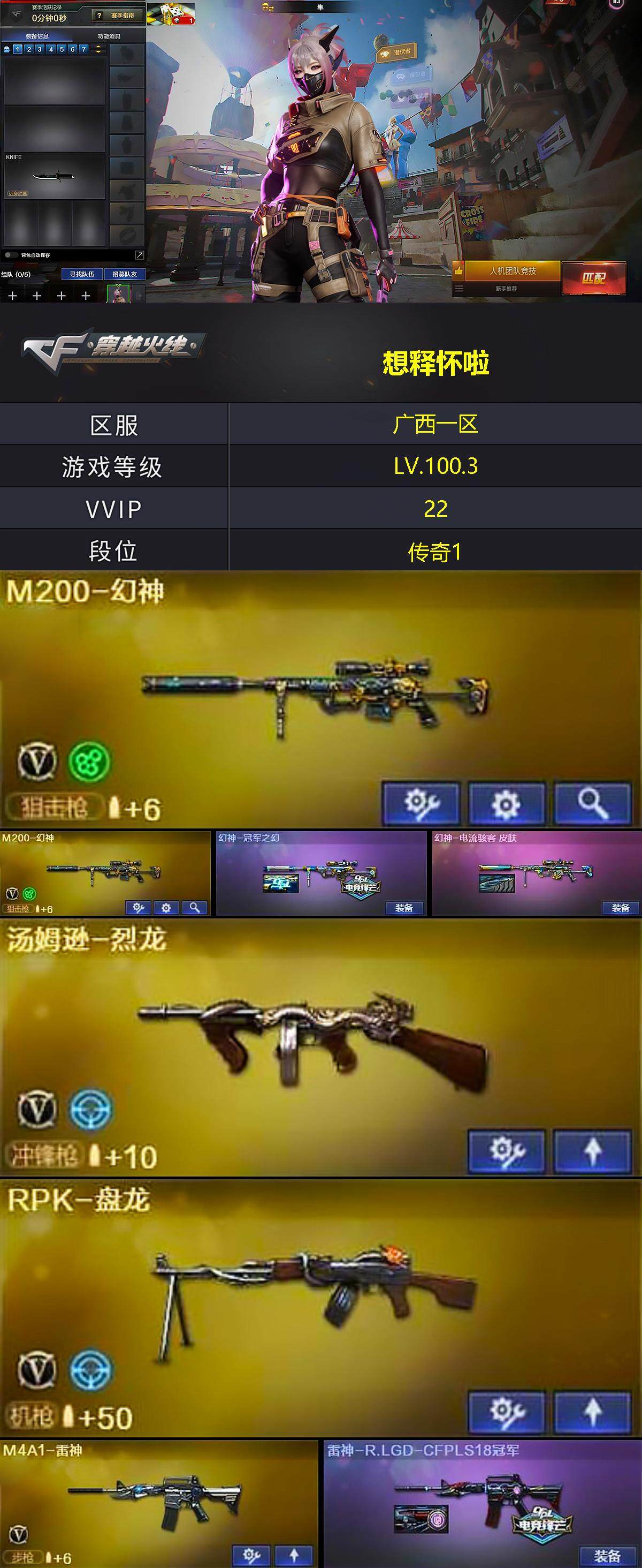 [13613747]广西一区-22V-3王者-1炫金 【热门武器】:M200-幻神*2,死亡之眼,汤姆逊-烈龙,RPK-盘龙,加特林-炼狱,降世魔童,沙鹰-修罗 【王者炫金武器】:王者之怒,炫金修罗 【皮肤】:幻神-冠军之幻,幻神-电流骇客 皮肤,雷神-R.LGD-CFPLS18冠军,黑龙-暗月,黑骑士-AG-S4冠军典藏 【角色】:隼,王者-零,风暴女,娟娟,0号玩家,灵狐-花神,龙儿,潘多拉-X,潜龙队-X,蛇姬,影武者-X 【人偶武器】:降世魔童 【暴走生化】:死亡之眼 【挑战大师】:阐释者III 【英雄级武器】:AK47-火麒麟,M4A1-黑龙,M4A1-雷神,AK47-黑武士,AK-47-猩红传说*2,黑骑士-海王,Barrett-毁灭,Barrett-极光,M200-幻神*2,RPK-盘龙,加特林-炼狱,汤姆逊-烈龙,沙鹰-修罗,屠龙,擎天,王者之锋-觉醒版,高爆手雷-雷霆,闪光弹-雷霆,烟雾弹-雷霆 【道具】:战舰背包,超级背包,变异宝贝,夺命之镰,防化服,星辰流光-枪王排位,巅峰赛先锋-金色流光,枪王排位28赛季金色流光,枪王排位29赛季金色流光,防弹头盔*5,防弹衣*6,C4工具钳*4,手雷包*5 【特殊枪械】:1烈龙,1盘龙,1炼狱