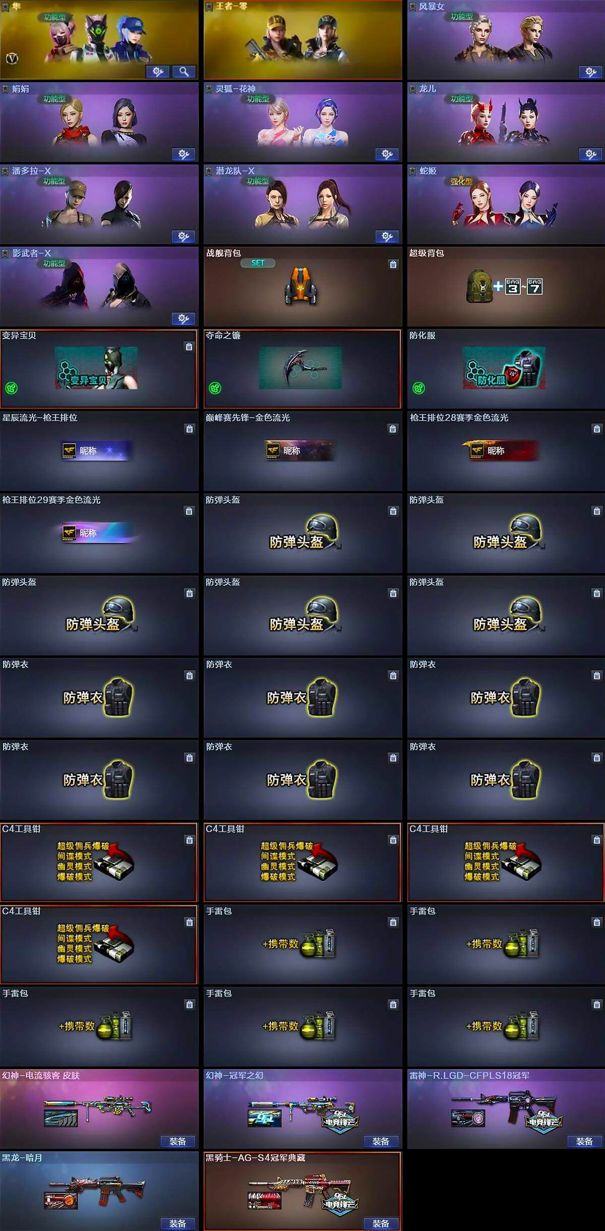 【道具】:战舰背包,超级背包,变异宝贝,夺命之镰,防化服,星辰流光-枪王排位,巅峰赛先锋-金色流光,枪王排位28赛季金色流光,枪王排位29赛季金色流光,防弹头盔*5,防弹衣*6,C4工具钳*4,手雷包*5