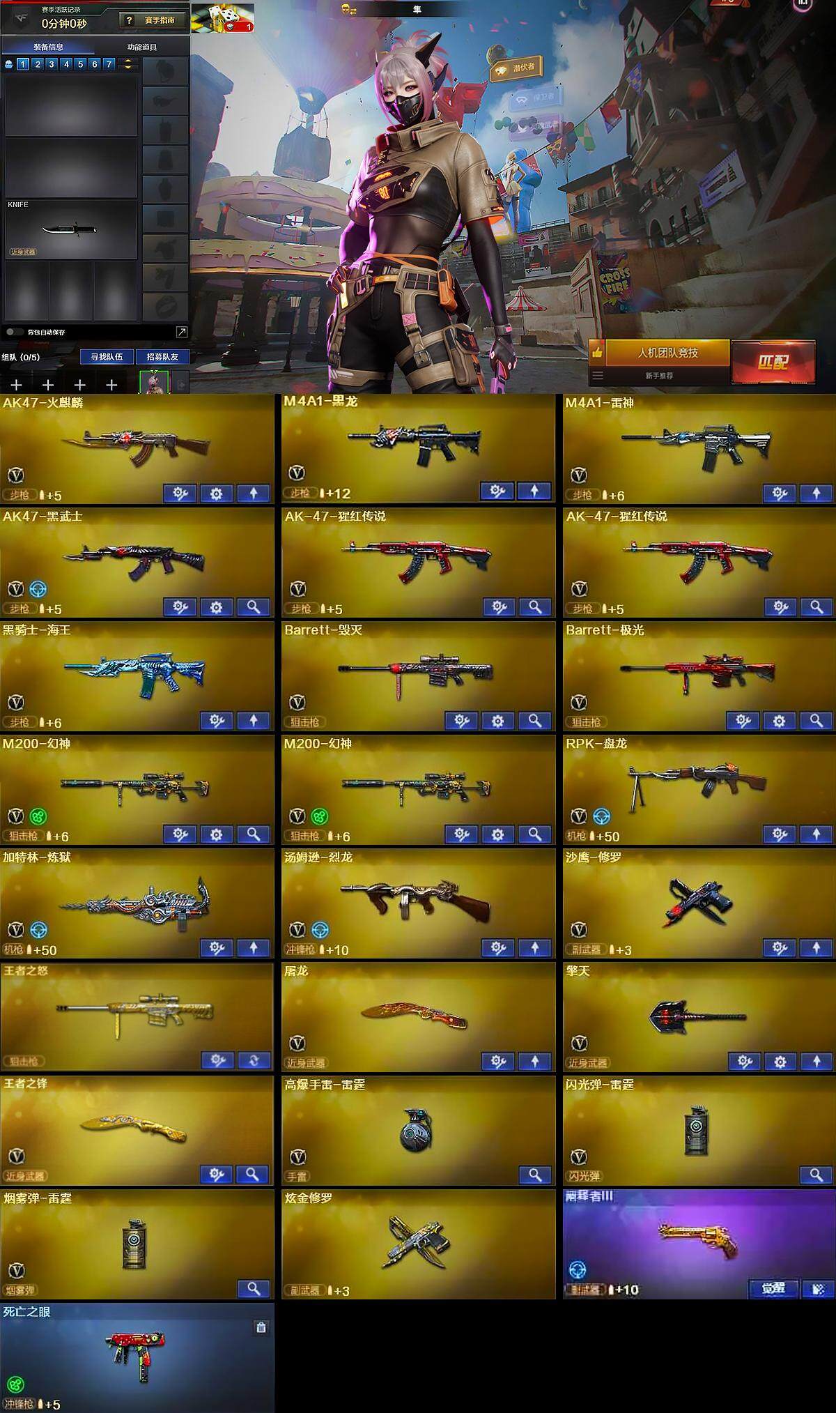 【英雄级武器】:AK47-火麒麟,M4A1-黑龙,M4A1-雷神,AK47-黑武士,AK-47-猩红传说*2,黑骑士-海王,Barrett-毁灭,Barrett-极光,M200-幻神*2,RPK-盘龙,加特林-炼狱,汤姆逊-烈龙,沙鹰-修罗,屠龙,擎天,王者之锋-觉醒版,高爆手雷-雷霆,闪光弹-雷霆,烟雾弹-雷霆