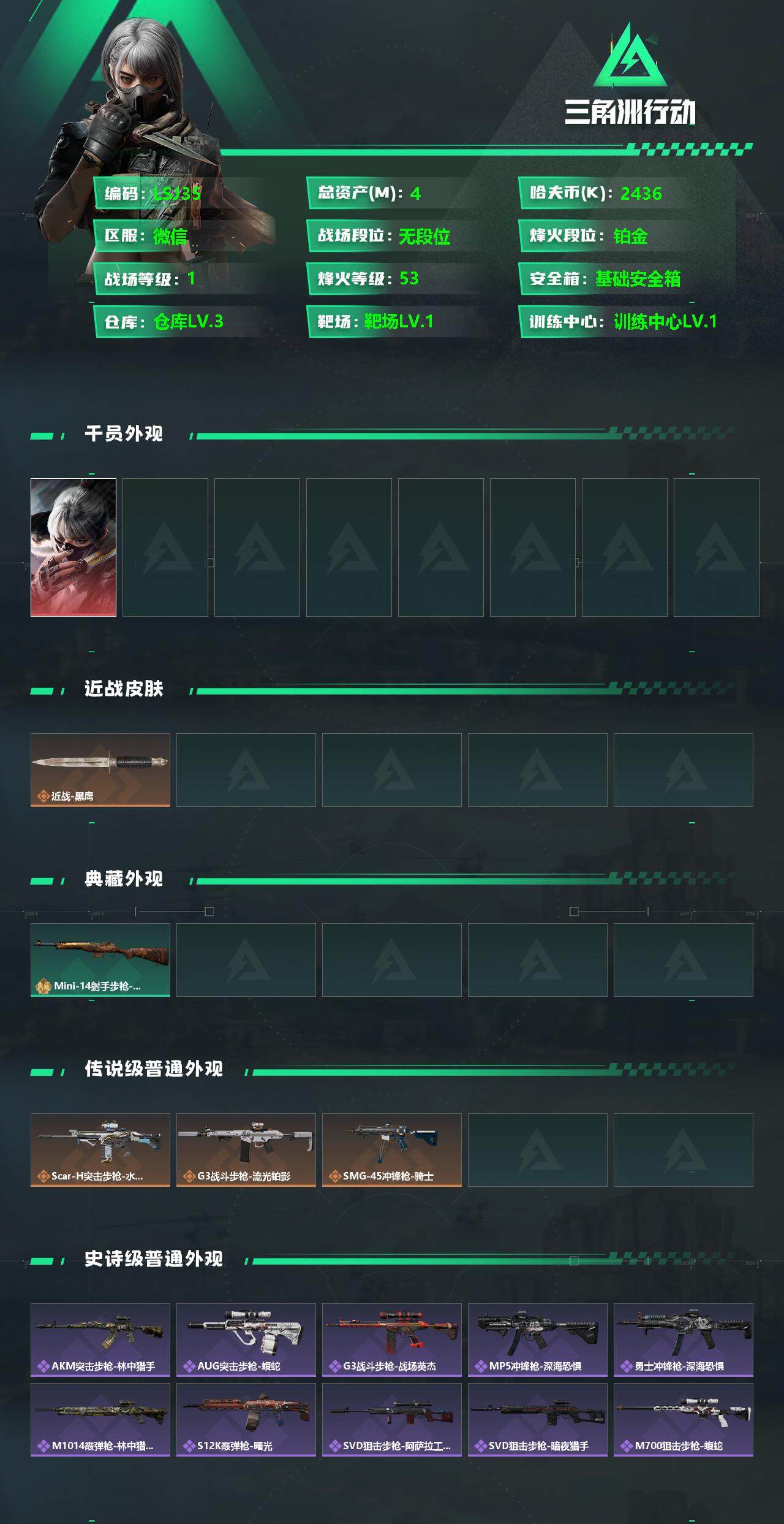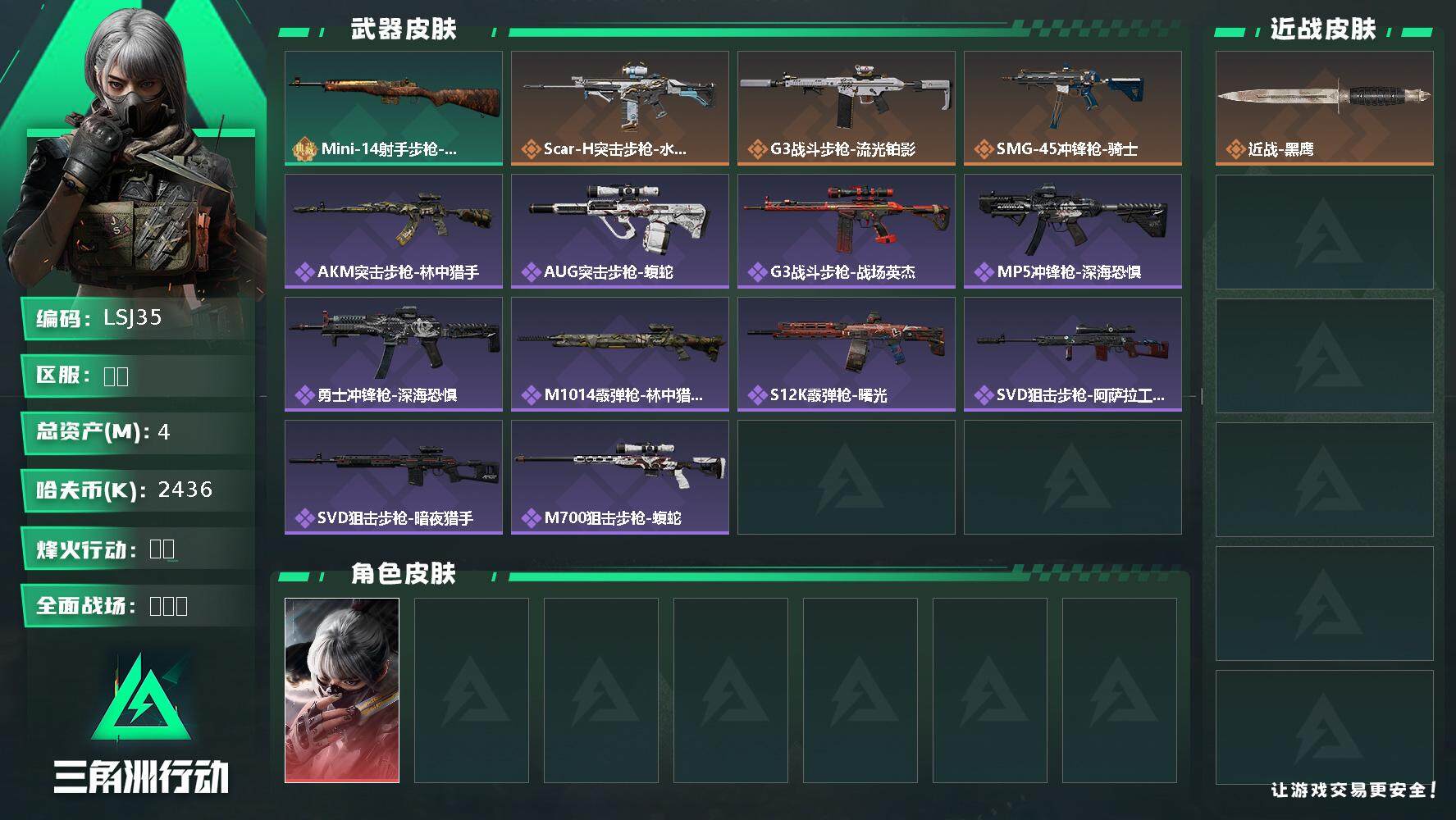 [13312491]总资产3.9m 2436k哈伏币-4m流动资产-53烽火等级-铂金-1战场等级-无军衔 【干员外观】:骇爪-水墨云图 【近战皮肤】:近战-黑鹰 【典藏外观】:Mini-14射手步枪-黄铜 【传说级普通外观】:SCAR-H战斗步枪-水墨云图,G3战斗步枪-流光铂影,SMG-45冲锋枪-骑士 【史诗级普通外观】:AKM突击步枪-林中猎手,AUG突击步枪-蝮蛇,G3战斗步枪-战场英杰,MP5冲锋枪-深海恐惧,勇士冲锋枪-深海恐惧,M1014霰弹枪-林中猎手,S12K霰弹枪-曙光,SVD狙击步枪-阿萨拉工艺,SVD狙击步枪-暗夜猎手,M700狙击步枪-蝮蛇 【稀有级普通外观】:M4A1突击步枪-刚枪之王,ASh-12战斗步枪-星链科技,K416突击步枪-街头涂鸦,MP5冲锋枪-弄臣,P90冲锋枪-浅鲨小队,P90冲锋枪-新生,Vector冲锋枪-先锋,VECTOR冲锋枪-街头涂鸦,SMG-45-行动开启,SMG-45冲锋枪-幻影结构,MP7冲锋枪-幻影结构,M1014霰弹枪-幻影结构,M1014霰弹枪-童趣,PKM通用机枪-英雄,VSS射手步枪-童趣,SKS射手步枪-弄臣,SR-25射手步枪-开拓,SR-25射手步枪-蜂窝科技,SV-98狙击步枪-星链科技,G18-星链科技 【普通级普通外观】:M4A1突击步枪-粉色涂装,M4A1突击步枪-高雅黑,M4A1突击步枪-海色,QBZ95-1突击步枪-高雅黑,QBZ95-1突击步枪-海浪,QBZ95-1突击步枪-海色,QBZ191突击步枪-三角洲力量,K416突击步枪-几何迷彩,K416突击步枪-高雅黑,AUG突击步枪-浅蓝涂装,M7战斗步枪-红色涂装,SG552突击步枪-浅蓝涂装,SG552突击步枪-海浪,AK-12突击步枪-冰川,AK-12突击步枪-落花,SCAR-H战斗步枪-数码迷彩,G3战斗步枪-高雅黑,MP5冲锋枪-安全工作,MP5冲锋枪-海色,P90冲锋枪-安全工作,Vector冲锋枪-几何迷彩,UZI冲锋枪-海色,QCQ171冲锋枪-三角洲力量,M1014霰弹枪-高雅黑,M1014霰弹枪-海浪,SV-98狙击步枪-红色涂装,.357左轮-精钢,沙漠之鹰-海浪,M1911-坚固材料 【军牌】:军牌-装备修理,军牌-夜间撤离,军牌-静谧时光,军牌-展示,军牌-享受音乐,军牌-永恒,军牌-零号大坝,军牌-钻石皇后酒店,军