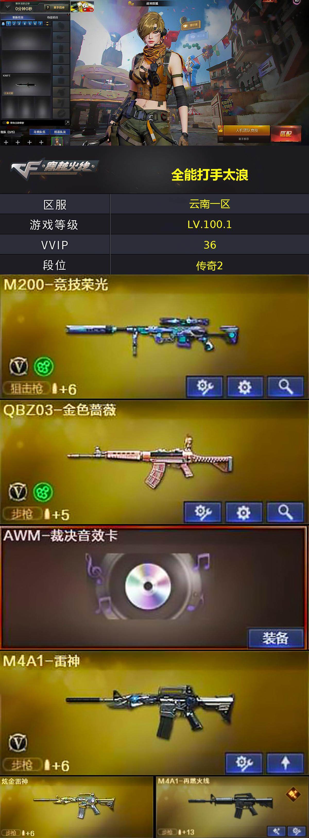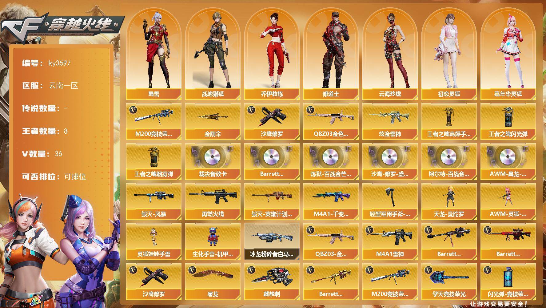 [13854678]云南一区-36V-8王者-1炫金 【热门武器】:QBZ03-金色蔷薇,M200-竞技荣光,沙鹰-修罗,金刚伞 【王者炫金武器】:炫金雷神,王者之魄高爆手雷,王者之魄闪光弹,王者之魄烟雾弹 【音效卡】:AWM-裁决音效卡,Barrett-碧霄极光音效卡,炼狱-百战金芒-庆典舞曲音效卡,沙鹰-修罗-盛典舞曲音效卡,柯尔特-百战金芒-庆典舞曲音效卡,AWM-昌龙-怀旧音效卡 【皮肤】:M4A1-再燃火线,毁灭-风暴,毁灭-英雄计划 皮肤,M4A1-千变-孔明皮肤,轻型军用手斧-再燃火线 【角色】:战地猎狐,乔伊教练,修道士,云海玲珑,初恋灵狐,嘉年华灵狐,疾风,娟娟,兰-海滩派对,兰妹妹,灵狐者-七夕宝贝,潘多拉-甜心教官,斯沃特-X,蜀雪 【人偶武器】:天龙-曼陀罗,AWM-灵狐-15周年嘉年华*2,生化手雷-机甲核心,灵狐娃娃手雷 【挑战大师】:冰龙粉碎者-白马银枪 【英雄级武器】:M4A1-雷神,QBZ03-金色蔷薇,王者之势-觉醒版,超新星-悦享-觉醒版,王者火魄-觉醒版,黑骑士-海王,Barrett-毁灭,Barrett-极光,Barrett-朱雀,M200-竞技荣光,王者森决-觉醒版,炼狱-百战金芒,沙鹰-修罗,屠龙*3,麒麟刺,擎天-竞技荣光,麒麟刺-百战金芒,高爆手雷-竞技荣光*6,闪光弹-竞技荣光*5,闪光弹-雷霆王者-觉醒版,烟雾弹-竞技荣光*5,M4A1-赤狱骑士,AWM-昌龙,Barrett-碧霄极光 【道具】:BS战队炫彩背包,云山科技背包,百战金芒炫彩背包,虎牙炫彩背包,女皇终结者-魔龙之吻,救世主-黑桃战神,黄金生化钩,绿色巨人,灵魂忍者,妖姬,迷雾幽灵,夺命之镰,防化服*3,金色流光-枪王排位,流光-再燃火线,语音特效-盛典烟火,萌萌小葵表情,炽雪表情,防弹头盔*6,防弹衣*6,C4工具钳*6,手雷包*6 【特殊枪械】: