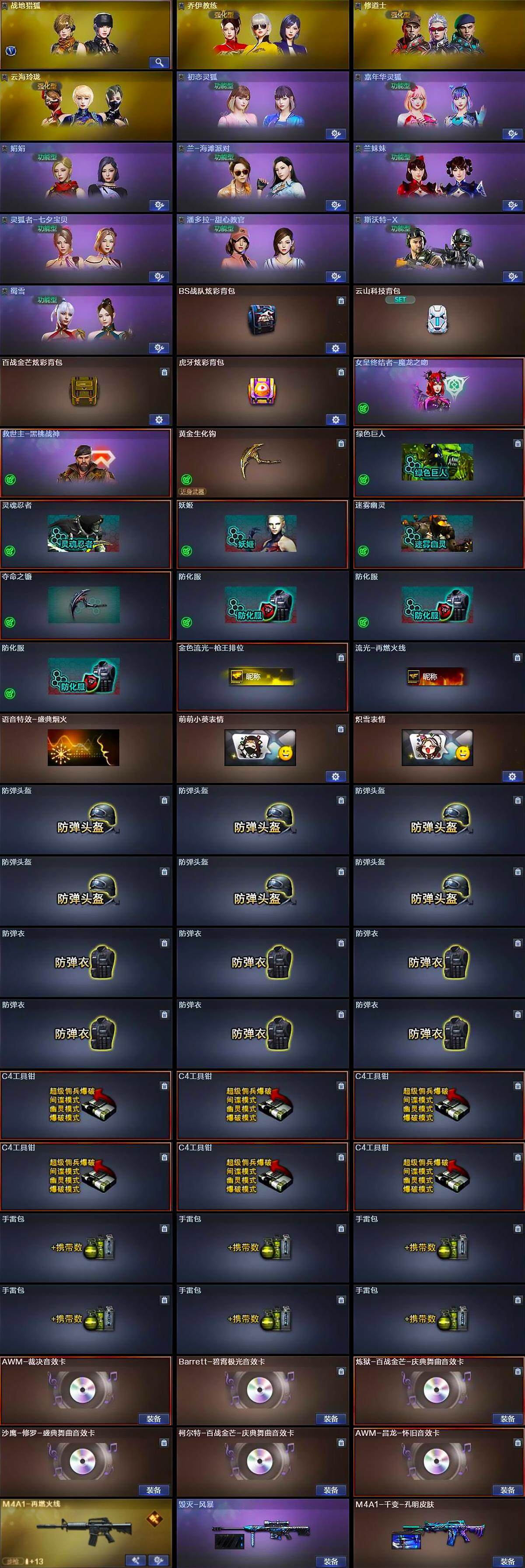 【英雄级武器】:M4A1-雷神,QBZ03-金色蔷薇,王者之势-觉醒版,超新星-悦享-觉醒版,王者火魄-觉醒版,黑骑士-海王,Barrett-毁灭,Barrett-极光,Barrett-朱雀,M200-竞技荣光,王者森决-觉醒版,炼狱-百战金芒,沙鹰-修罗,屠龙*3,麒麟刺,擎天-竞技荣光,麒麟刺-百战金芒,高爆手雷-竞技荣光*6,闪光弹-竞技荣光*5,闪光弹-雷霆王者-觉醒版,烟雾弹-竞技荣光*5,M4A1-赤狱骑士,AWM-昌龙,Barrett-碧霄极光