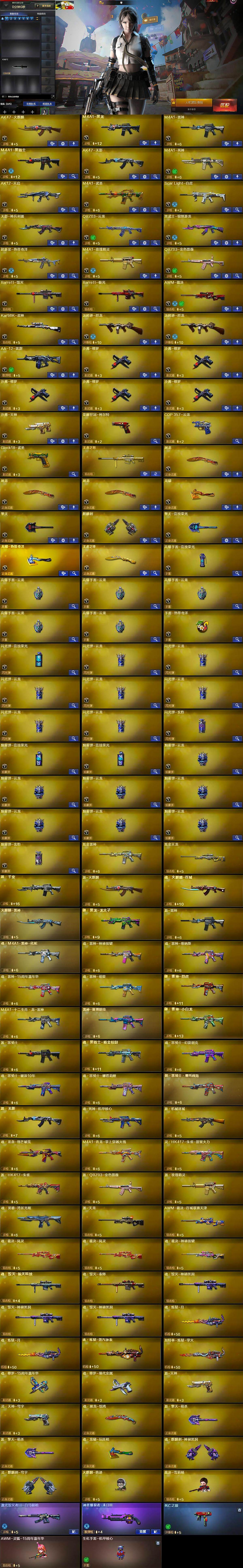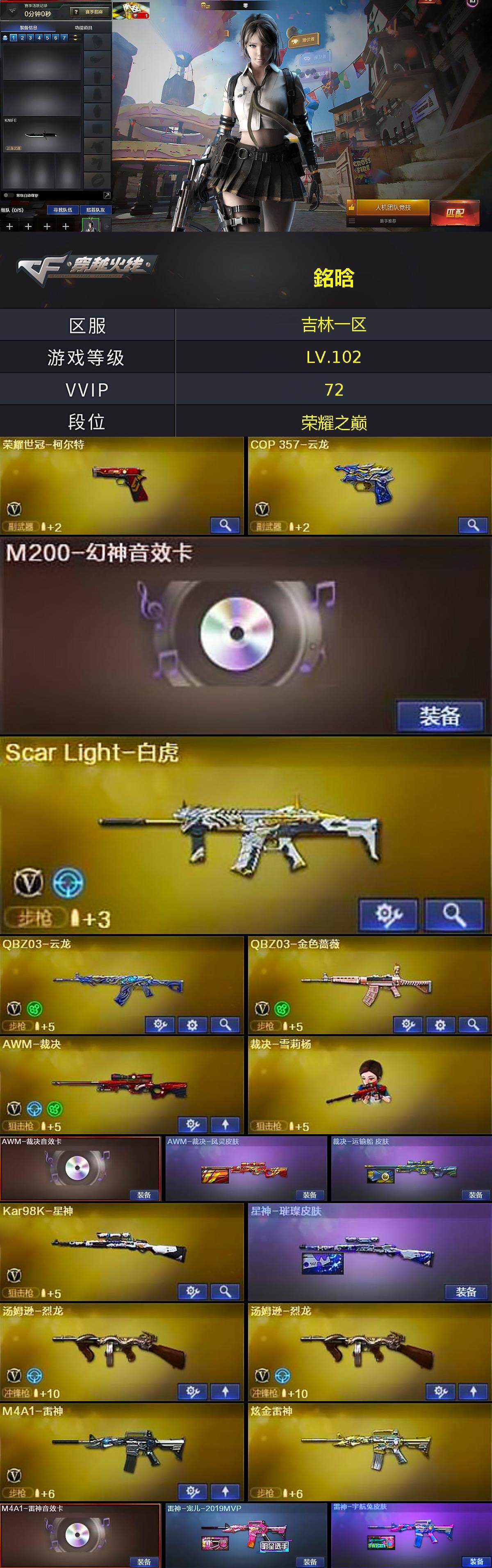 【热门武器】:QBZ03-金色蔷薇,Scar Light-白虎,死亡之眼,荣耀世冠-柯尔特,Kar98K-星神,M4A1-黑骑士,汤姆逊-烈龙*2,羊驼玩偶,裁决-雪莉杨,火麒麟-绝迹,沙鹰-修罗*5