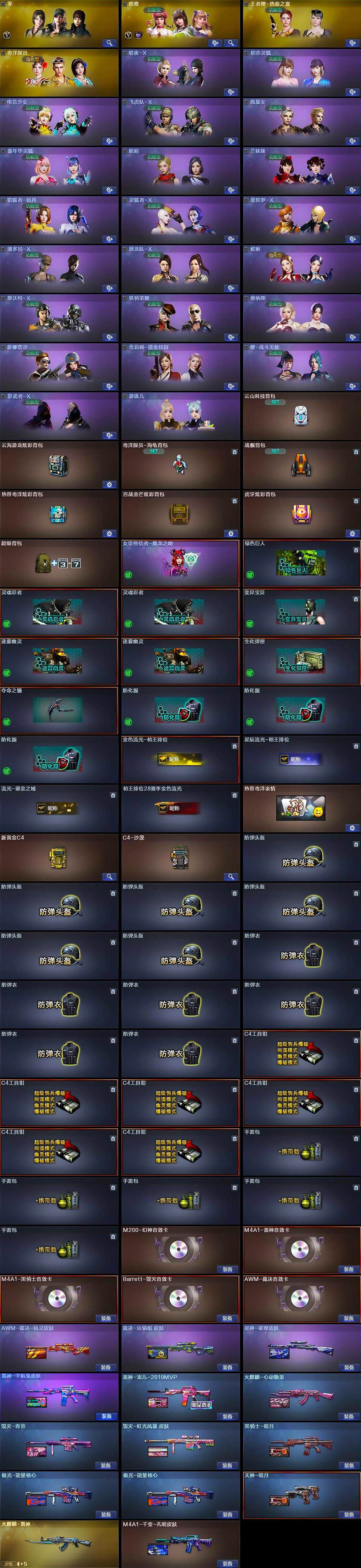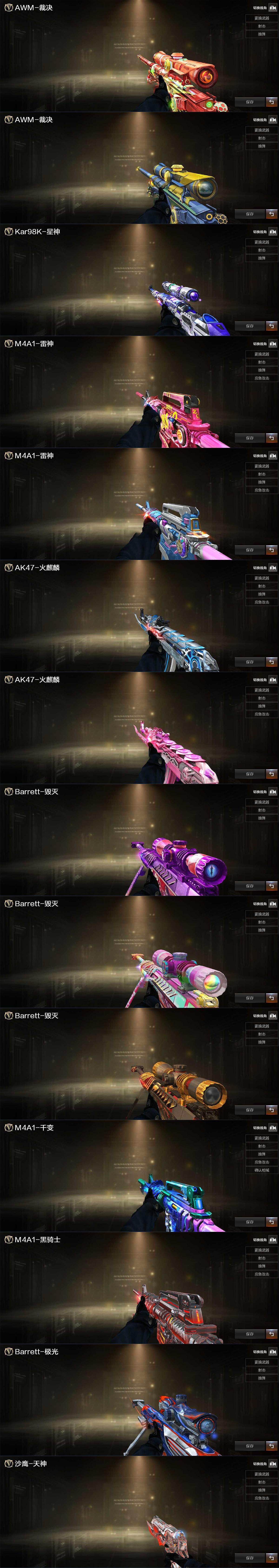 【英雄级武器】:AK47-火麒麟,M4A1-黑龙,M4A1-雷神,M4A1-黑骑士,AK47-无影,M4A1-死神,AK12-天启,M4A1-武圣,Scar Light-白虎,无影-神兵利器,QBZ03-云龙,黑武士-锦绣游龙,超新星-热带奇洋,M4A1-玫瑰精灵,QBZ03-金色蔷薇,Barrett-毁灭,Barrett-极光,AWM-裁决,Kar98K-星神,汤姆逊-烈龙*2,AA-12-雷霆,沙鹰-修罗*5,沙鹰-天神,荣耀世冠-柯尔特,COP 357-云龙,Glock18-武圣,屠龙*3,龙啸,擎天,麒麟刺,擎天-竞技荣光,龙啸-热带奇洋,王者之锋-觉醒版,高爆手雷-竞技荣光,高爆手雷-云龙*5,手雷-热带奇洋,闪光弹-竞技荣光,闪光弹-云龙*7,闪光弹-玄豹,烟雾弹-竞技荣光*2,烟雾弹-云龙*7,烟雾弹-玄豹