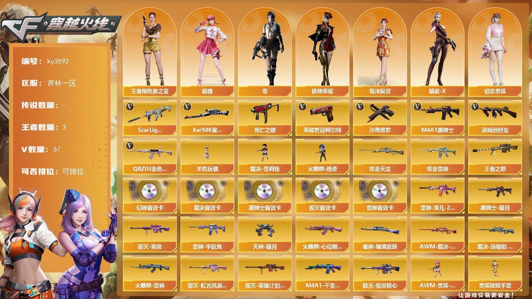 [13855098]吉林一区-67V-3王者-2炫金 【热门武器】:QBZ03-金色蔷薇,Scar Light-白虎,死亡之眼,荣耀世冠-柯尔特,Kar98K-星神,M4A1-黑骑士,汤姆逊-烈龙*2,羊驼玩偶,裁决-雪莉杨,火麒麟-绝迹,沙鹰-修罗*5 【王者炫金武器】:王者之怒,炫金雷神,炫金天龙 【音效卡】:M200-幻神音效卡,M4A1-雷神音效卡,M4A1-黑骑士音效卡,Barrett-毁灭音效卡,AWM-裁决音效卡 【皮肤】:AWM-裁决-凤灵皮肤,裁决-运输船 皮肤,星神-璀璨皮肤,雷神-宠儿-2019MVP,雷神-宇航兔皮肤,火麒麟-雷神,火麒麟-心动糖果,毁灭-青帝,毁灭-虹光风暴 皮肤,毁灭-英雄计划 皮肤,M4A1-千变-孔明皮肤,黑骑士-暗月,极光-能量核心*2,天神-暗月 【角色】:零,晴雅,王者樱-热浪之夏,奇洋探员,暗夜-X,初恋灵狐,电竞少女,飞虎队-X,风暴女,嘉年华灵狐,娟娟,兰妹妹,猎狐者-追月,灵狐者-X,曼陀罗-X,潘多拉-X,潜龙队-X,蛇姬,斯沃特-X,铁骑荣耀,兔囡囡,维纳斯,新娜塔莎,雪莉杨-摸金校尉,樱-战斗天使,影武者-X,游珑儿 【人偶武器】:火麒麟-绝迹,裁决-雪莉杨,AWM-灵狐-15周年嘉年华,生化手雷-机甲核心,灵狐娃娃手雷 【暴走生化】:死亡之眼 【挑战大师】:激光毁灭者III-白马银枪,神圣爆裂者-末日III 【英雄级武器】:AK47-火麒麟,M4A1-黑龙,M4A1-雷神,M4A1-黑骑士,AK47-无影,M4A1-死神,AK12-天启,M4A1-武圣,Scar Light-白虎,无影-神兵利器,QBZ03-云龙,黑武士-锦绣游龙,超新星-热带奇洋,M4A1-玫瑰精灵,QBZ03-金色蔷薇,Barrett-毁灭,Barrett-极光,AWM-裁决,Kar98K-星神,汤姆逊-烈龙*2,AA-12-雷霆,沙鹰-修罗*5,沙鹰-天神,荣耀世冠-柯尔特,COP 357-云龙,Glock18-武圣,屠龙*3,龙啸,擎天,麒麟刺,擎天-竞技荣光,龙啸-热带奇洋,王者之锋-觉醒版,高爆手雷-竞技荣光,高爆手雷-云龙*5,手雷-热带奇洋,闪光弹-竞技荣光,闪光弹-云龙*7,闪光弹-玄豹,烟雾弹-竞技荣光*2,烟雾弹-云龙*7,烟雾弹-玄豹 【道具】:云山科技背包,云海游龙炫彩背包,奇洋探员-海龟背包,战舰背包,热带奇洋炫彩背包,