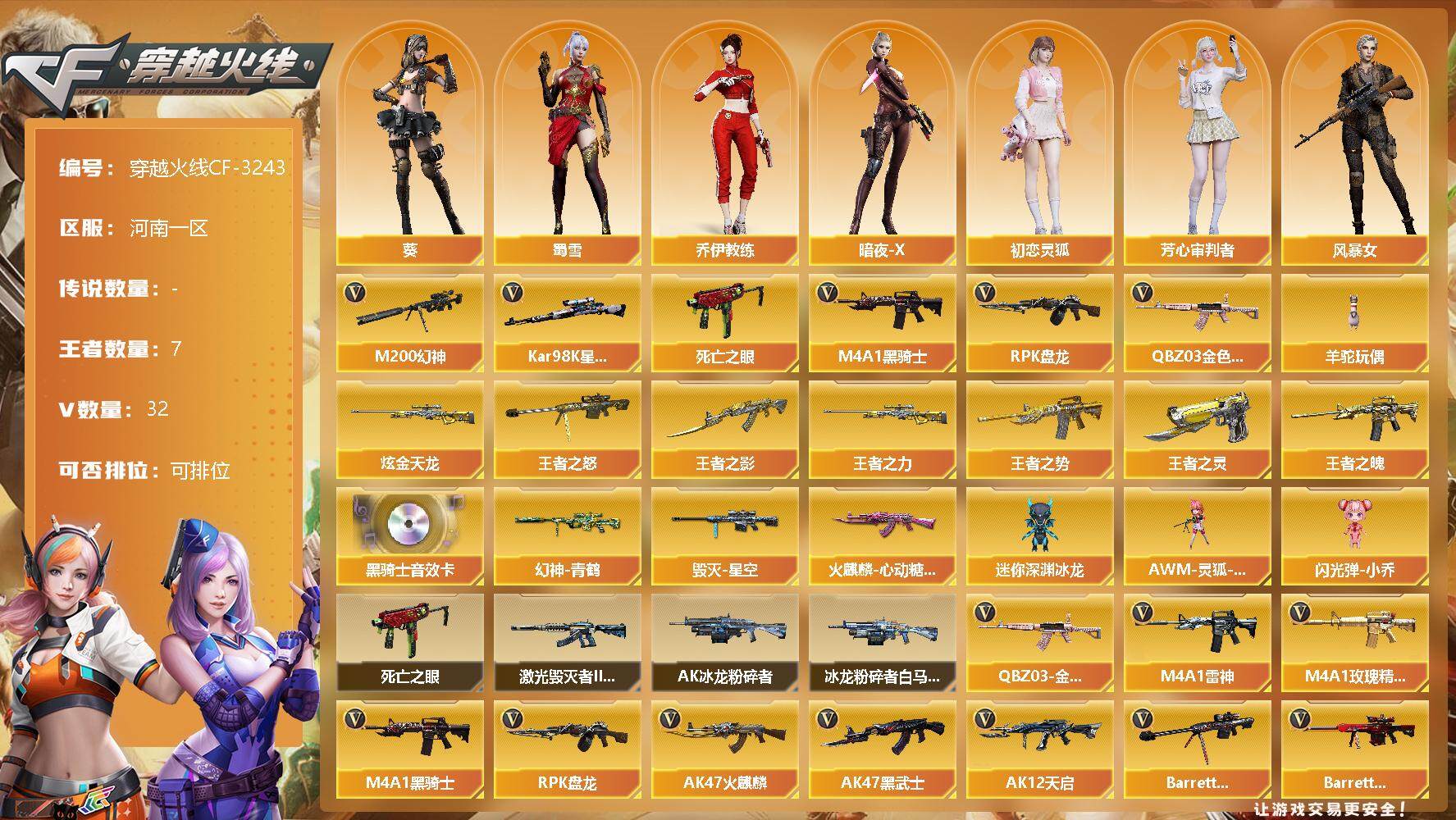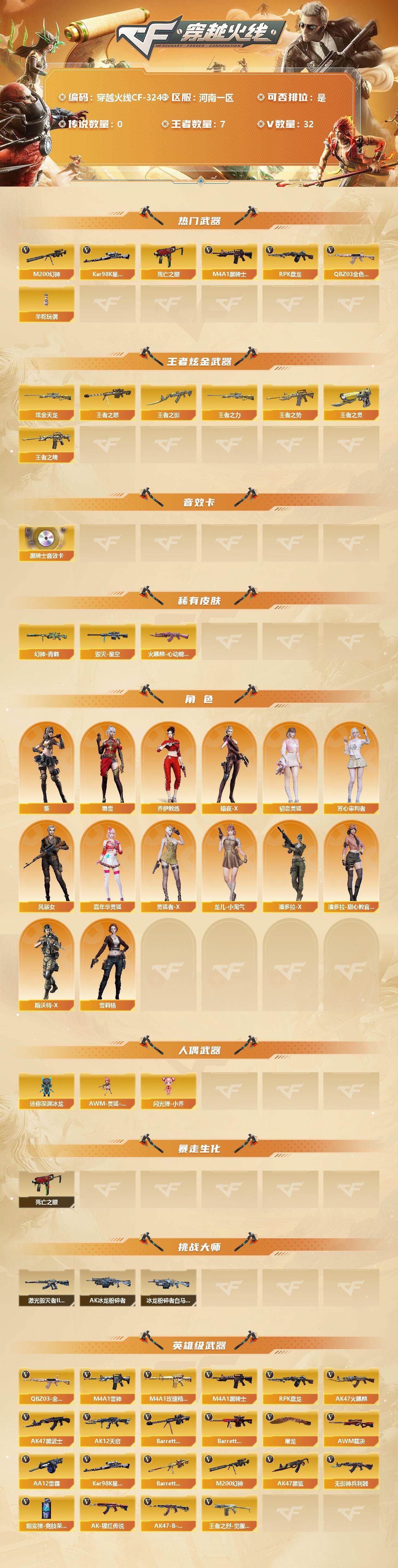 [13331461]河南一区-32V-7王者-1炫金 【热门武器】:QBZ03-金色蔷薇,M200-幻神,死亡之眼,Kar98K-星神,M4A1-黑骑士,RPK-盘龙,羊驼玩偶 【王者炫金武器】:王者之势,王者之影,王者之魄,王者之怒,王者之力,王者之灵,炫金天龙 【音效卡】:M4A1-黑骑士音效卡 【皮肤】:幻神-青鹤,火麒麟-雷神,火麒麟-心动糖果,毁灭-星空,M4A1-千变-孔明皮肤 【角色】:葵,乔伊教练,暗夜-X,初恋灵狐,芳心审判者,风暴女,嘉年华灵狐,灵狐者-X,龙儿-小淘气,潘多拉-X,潘多拉-甜心教官,斯沃特-X,蜀雪,雪莉杨 【人偶武器】:AWM-灵狐-15周年嘉年华,迷你深渊冰龙,闪光弹-小乔 【暴走生化】:死亡之眼 【挑战大师】:AK47-冰龙粉碎者,冰龙粉碎者-白马银枪,激光毁灭者III-白马银枪 【英雄级武器】:AK47-火麒麟*2,M4A1-雷神*2,M4A1-黑骑士,AK47-黑武士,AK12-天启*2,AK47-黑鲨*3,无影-神兵利器,M4A1-玫瑰精灵,QBZ03-金色蔷薇,AK-47-猩红传说,AK47-B-战神,王者之烈-觉醒版,Barrett-毁灭*2,Barrett-极光,AWM-裁决,M200-幻神,Barrett-朱雀,Kar98K-星神,RPK-盘龙,AA-12-雷霆,屠龙,烟雾弹-竞技荣光 【道具】:战舰背包,虎牙炫彩背包,超级背包,黄金生化钩,绿色巨人,灵魂忍者,迷雾幽灵,夺命之镰,防化服*2,金色流光-枪王排位*2,星辰流光-枪王排位,流光-鎏金之域,枪王排位28赛季金色流光,枪王排位29赛季金色流光,防弹头盔*5,防弹衣*6,C4工具钳*3,手雷包*3 【特殊枪械】:1黑骑士,1盘龙