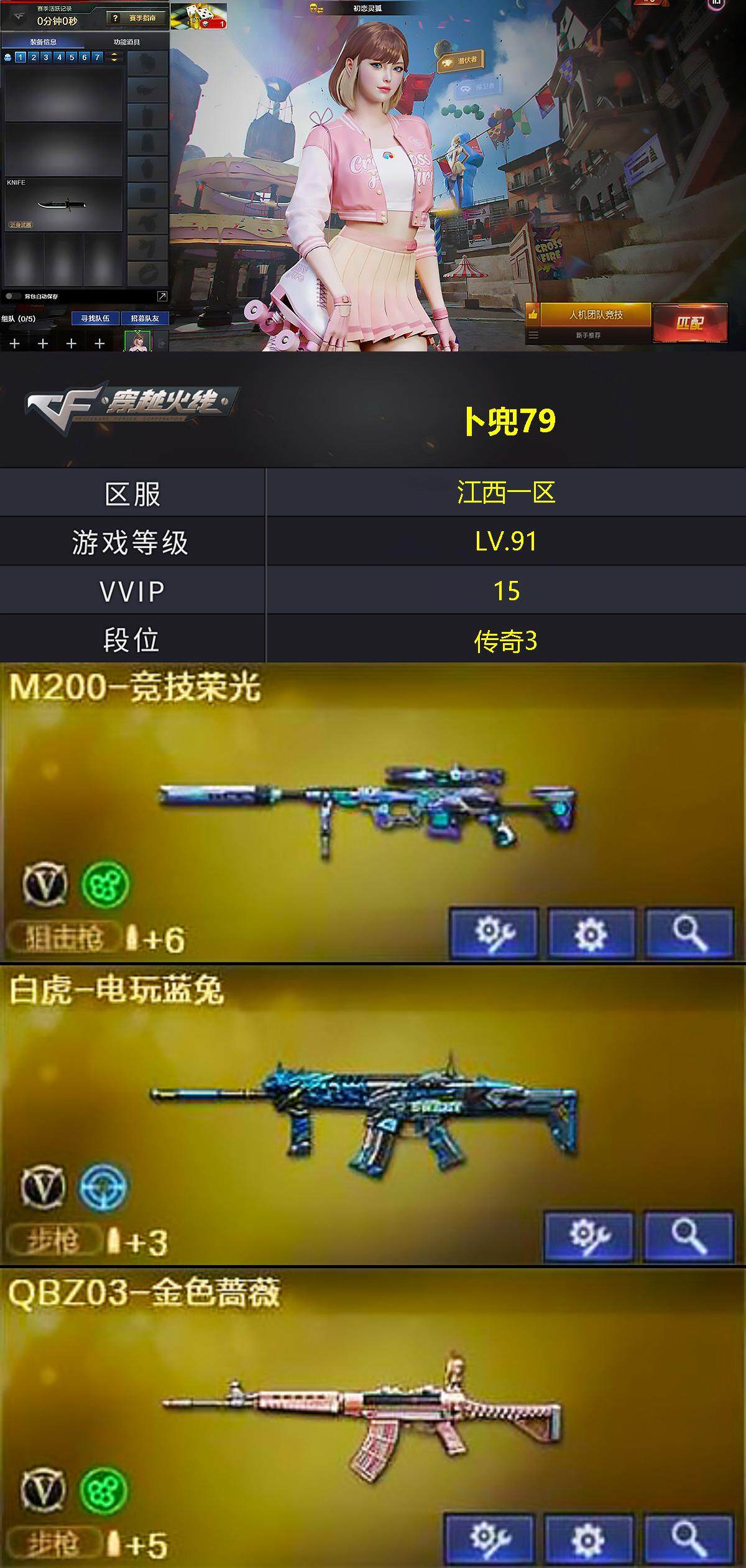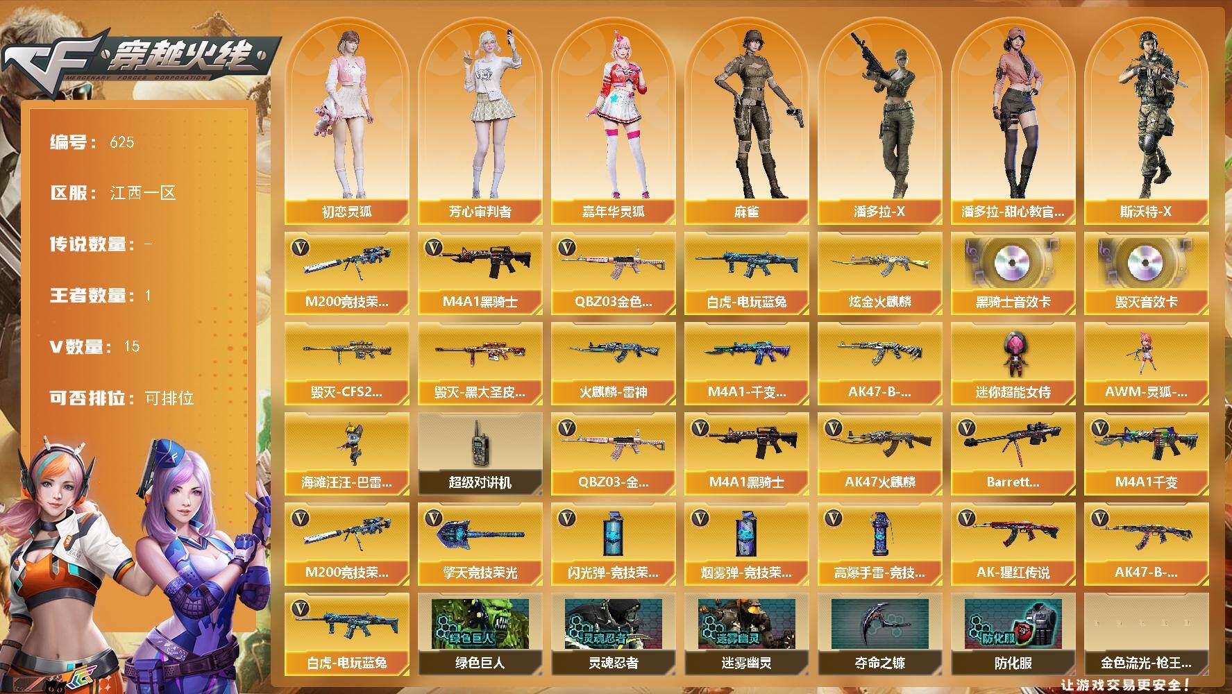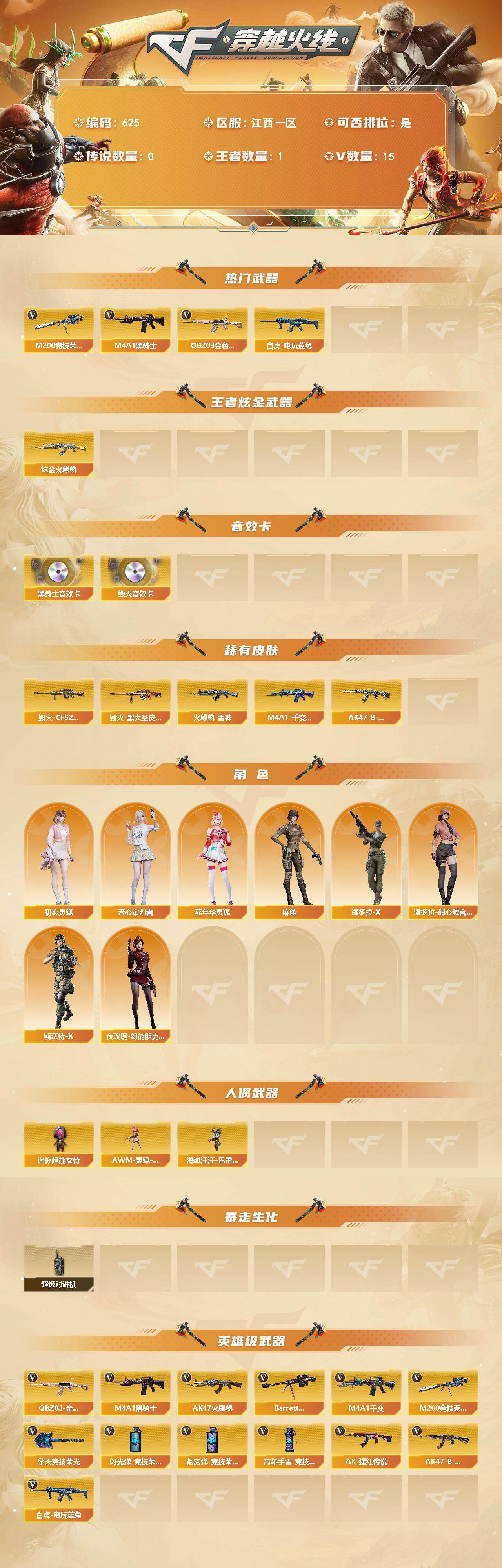 [13631077]江西一区-15V-1王者-1炫金 【热门武器】:QBZ03-金色蔷薇,M200-竞技荣光,白虎-电玩蓝兔,M4A1-黑骑士 【王者炫金武器】:炫金火麒麟 【音效卡】:M4A1-黑骑士音效卡,Barrett-毁灭音效卡 【皮肤】:火麒麟-雷神,毁灭-CFS2020,毁灭-黑大圣皮肤,M4A1-千变-孔明皮肤,AK47-B-常胜将军-刘备 【角色】:初恋灵狐,芳心审判者,嘉年华灵狐,麻雀,潘多拉-X,潘多拉-甜心教官,斯沃特-X,夜玫瑰-幻能朋克 【人偶武器】:AWM-灵狐-15周年嘉年华,海滩汪汪-巴雷特,迷你超能女侍 【暴走生化】:超级对讲机 【英雄级武器】:M4A1-千变,AK47-火麒麟,M4A1-黑骑士,QBZ03-金色蔷薇,AK-47-猩红传说*2,AK47-B-战神,白虎-电玩蓝兔,Barrett-毁灭,M200-竞技荣光,擎天-竞技荣光,高爆手雷-竞技荣光,闪光弹-竞技荣光,烟雾弹-竞技荣光 【道具】:绿色巨人,灵魂忍者,迷雾幽灵,夺命之镰,防化服*2,金色流光-枪王排位,星辰流光-枪王排位,枪王排位28赛季金色流光,电玩兔兔表情,防弹头盔*8,防弹衣*8,C4工具钳*8,手雷包*8 【特殊枪械】:1黑骑士