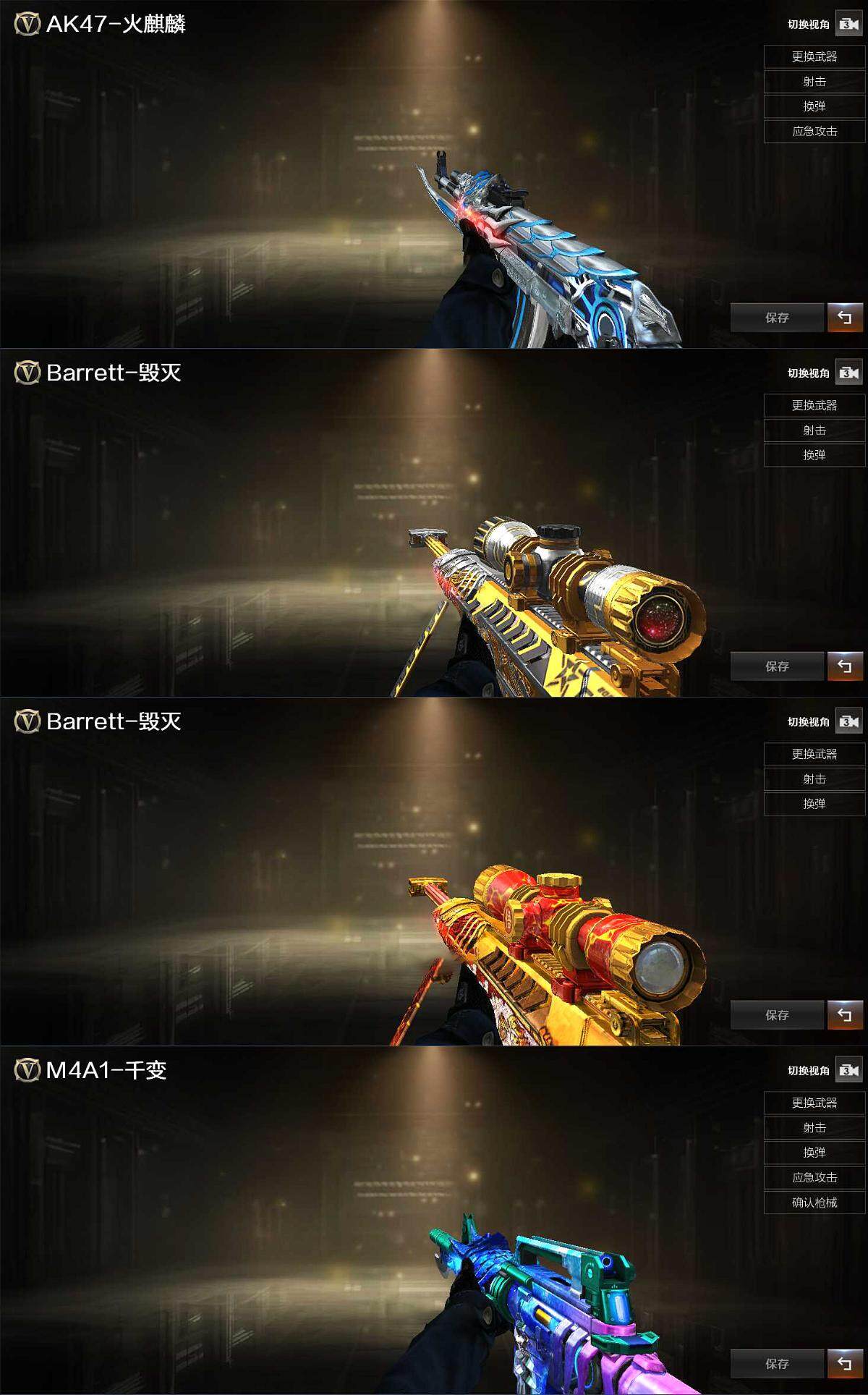 【皮肤】:火麒麟-雷神,毁灭-CFS2020,毁灭-黑大圣皮肤,M4A1-千变-孔明皮肤,AK47-B-常胜将军-刘备