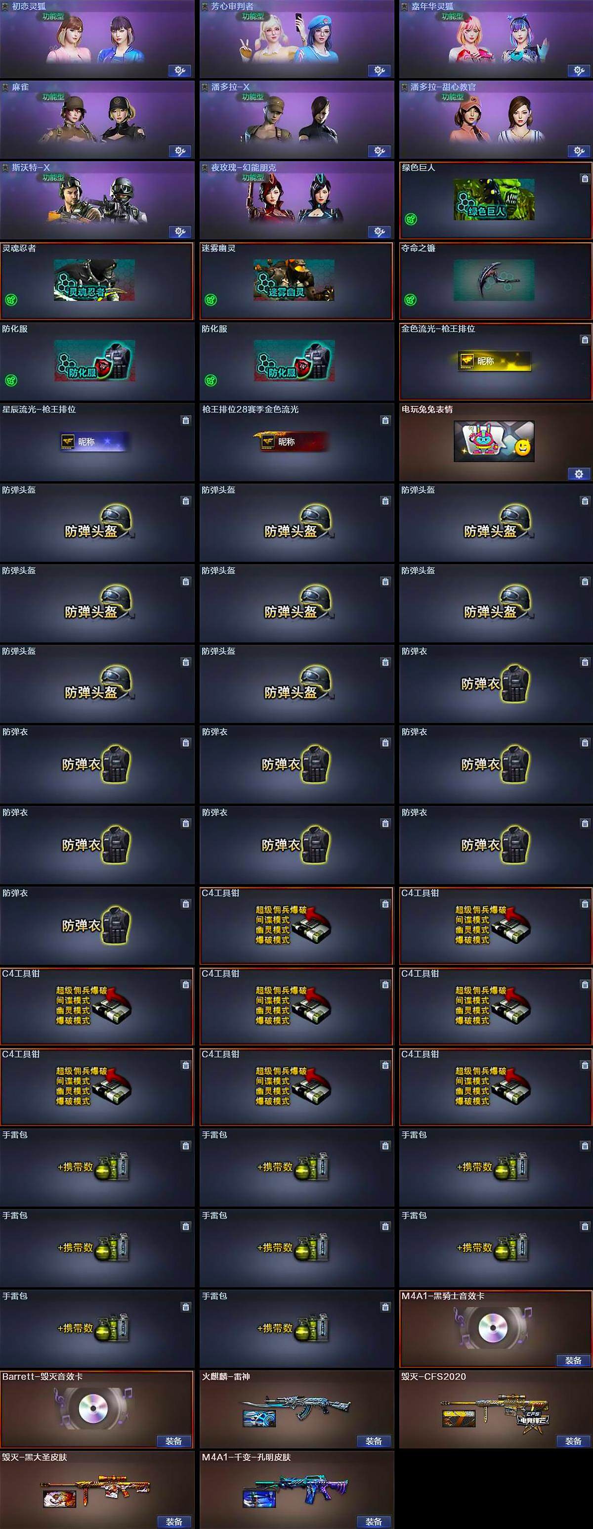 【道具】:绿色巨人,灵魂忍者,迷雾幽灵,夺命之镰,防化服*2,金色流光-枪王排位,星辰流光-枪王排位,枪王排位28赛季金色流光,电玩兔兔表情,防弹头盔*8,防弹衣*8,C4工具钳*8,手雷包*8