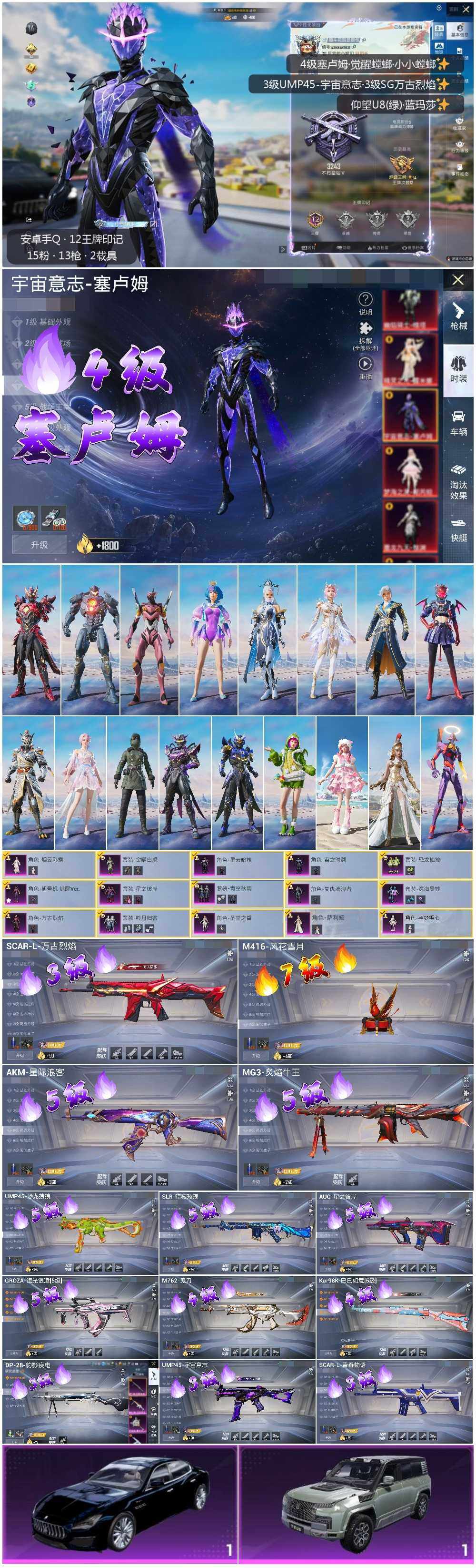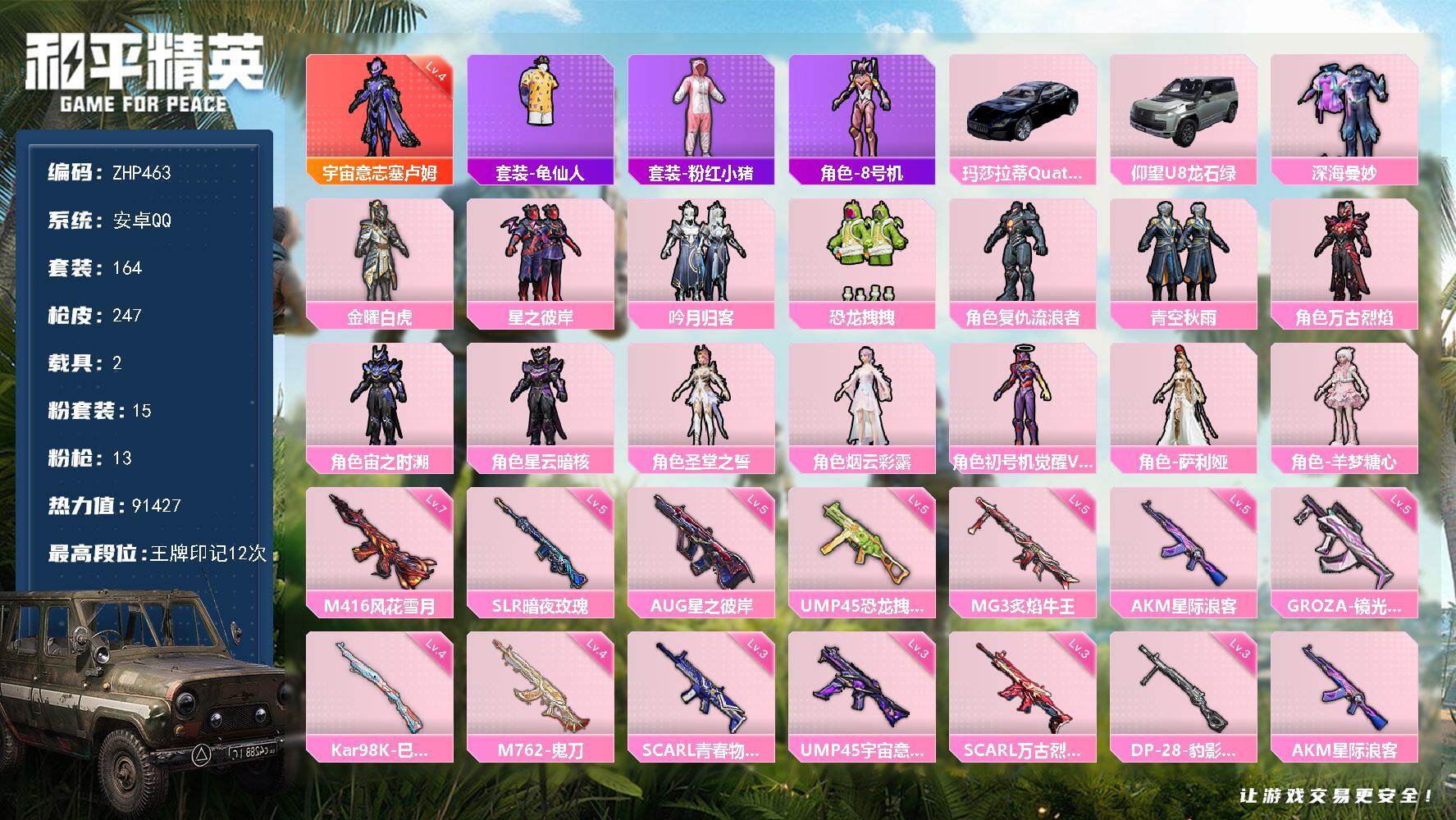 [13565582]可二次【店主推荐捡漏号!可直接换绑】/素材身法号/宇宙意志-塞卢姆(四级) 安卓 手Q-1神装-15粉装-13特效枪-2载具-5粉色飞行器-9.1w热力值-12王牌印记-164套装-247枪皮【红色神装等级】:宇宙意志-塞卢姆(四级)【热门品类】:套装-龟仙人,套装-粉红小猪,角色-8号机【粉色载具】:玛莎拉蒂Quattroporte(夜幕蓝),仰望U8(龙石绿)【粉色套装】:粉装-深海曼妙,粉装-金曜白虎,粉装-星之彼岸,粉装-吟月归客,粉装-恐龙拽拽,角色-复仇流浪者,粉装-青空秋雨,角色-万古烈焰,角色-宙之时溯,角色-星云暗核,角色-圣堂之誓,角色-烟云彩露,角色-初号机 觉醒Ver.,角色-萨利娅,角色-羊梦糖心【粉色枪皮等级】:AKM-星际浪客(五级),SCAR-L-青春物语(三级),SCAR-L-万古烈焰(三级),M416-风花雪月(七级),GROZA-镜光银凌(五级),AUG-星之彼岸(五级),M762-鬼刀(四级),UMP45-恐龙拽拽(五级),UMP45-宇宙意志(三级),Kar98K-巳巳如意(四级),SLR-暗夜玫瑰(五级),DP-28-豹影疾电(三级),MG3-炙焰牛王(五级)【粉色飞行器】:星之彼岸飞行器,沙丘之主天马,龙翔九天飞行器,深渊漩涡飞行器,灵珠游龙飞行器