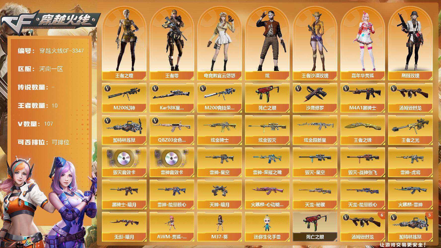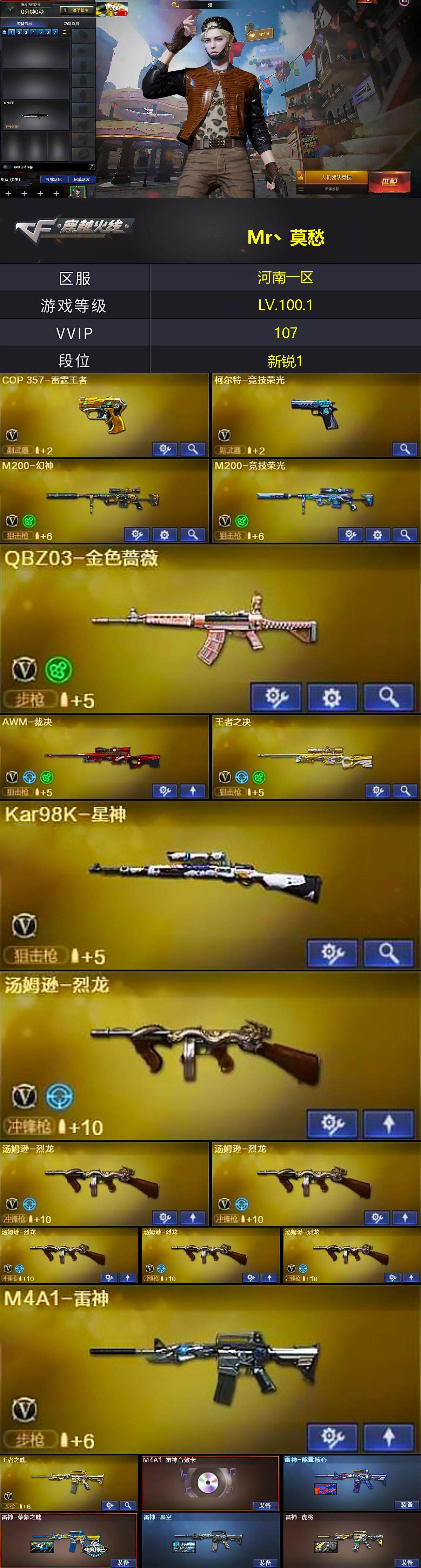 [13631627]河南一区-107V-10王者-5炫金 【热门武器】:QBZ03-金色蔷薇,M200-幻神,M200-竞技荣光,死亡之眼,Kar98K-星神,M4A1-黑骑士*3,汤姆逊-烈龙*6,加特林-炼狱*5,沙鹰-修罗*5 【王者炫金武器】:王者之光,王者之锋,炫金骑士,炫金超新星*2,炫金毁灭*2 【音效卡】:M4A1-雷神音效卡,Barrett-毁灭音效卡 【皮肤】:雷神-能量核心,雷神-荣耀之魄,雷神-星空,雷神-虎将,火麒麟-雷神,火麒麟-心动糖果,毁灭-星空,毁灭-战神张飞,黑骑士-暗月,无影-暗月,天龙-秘银*2,天龙-能量核心,天神-暗月*3 【角色】:炫,电竞教官-云悠悠,王者-零,王者之瞳,王者沙漠玫瑰,嘉年华灵狐,荆棘玫瑰,灵狐者-黄金海岸,潘多拉-X,斯沃特-X,雪莉杨 【人偶武器】:AWM-灵狐-15周年嘉年华,M37-葵,迷你生化手雷 【暴走生化】:死亡之眼 【挑战大师】:激光毁灭者III 【英雄级武器】:M4A1-千变,AK47-火麒麟*5,M4A1-黑龙*3,M4A1-雷神,M4A1-黑骑士*3,AK47-无影,M4A1-死神,AK47-黑武士,AK12-天启,AN94-超新星,AK47-机械迷城,AK47-黑鲨*3,M4A1-龙血,M4A1-雷霆,M4A1-玫瑰精灵*4,QBZ03-金色蔷薇,王者之心-觉醒版,王者之魄-觉醒版,AK-47-猩红传说,AWM-天龙,Barrett-毁灭*3,Barrett-极光,AWM-裁决,M200-幻神,Kar98K-星神,M200-竞技荣光,王者之决-觉醒版,加特林-炼狱*5,汤姆逊-烈龙*6,AA-12-雷霆*2,沙鹰-修罗*5,沙鹰-天神,COP 357-雷霆王者-觉醒版,柯尔特-竞技荣光,屠龙*6,龙啸,麒麟刺*5,擎天-竞技荣光,斩神刀-雷暴,王者之锋-觉醒版,高爆手雷-雷霆*7,高爆手雷-雷暴,高爆手雷-竞技荣光,闪光弹-雷霆*7,闪光弹-雷暴,闪光弹-竞技荣光,烟雾弹-雷霆*7,烟雾弹-雷暴,烟雾弹-竞技荣光,M4A1-赤狱骑士 【道具】:炫彩背包,救世主-黑桃战神,绿色巨人,灵魂忍者,迷雾幽灵,夺命之镰,防化服*2,金色流光-枪王排位*2,星辰流光-枪王排位,枪王排位28赛季金色流光,防弹头盔*2,防弹衣*2,C4工具钳*2,手雷包*2 【特殊枪械】:3黑骑士,6烈龙,5炼狱