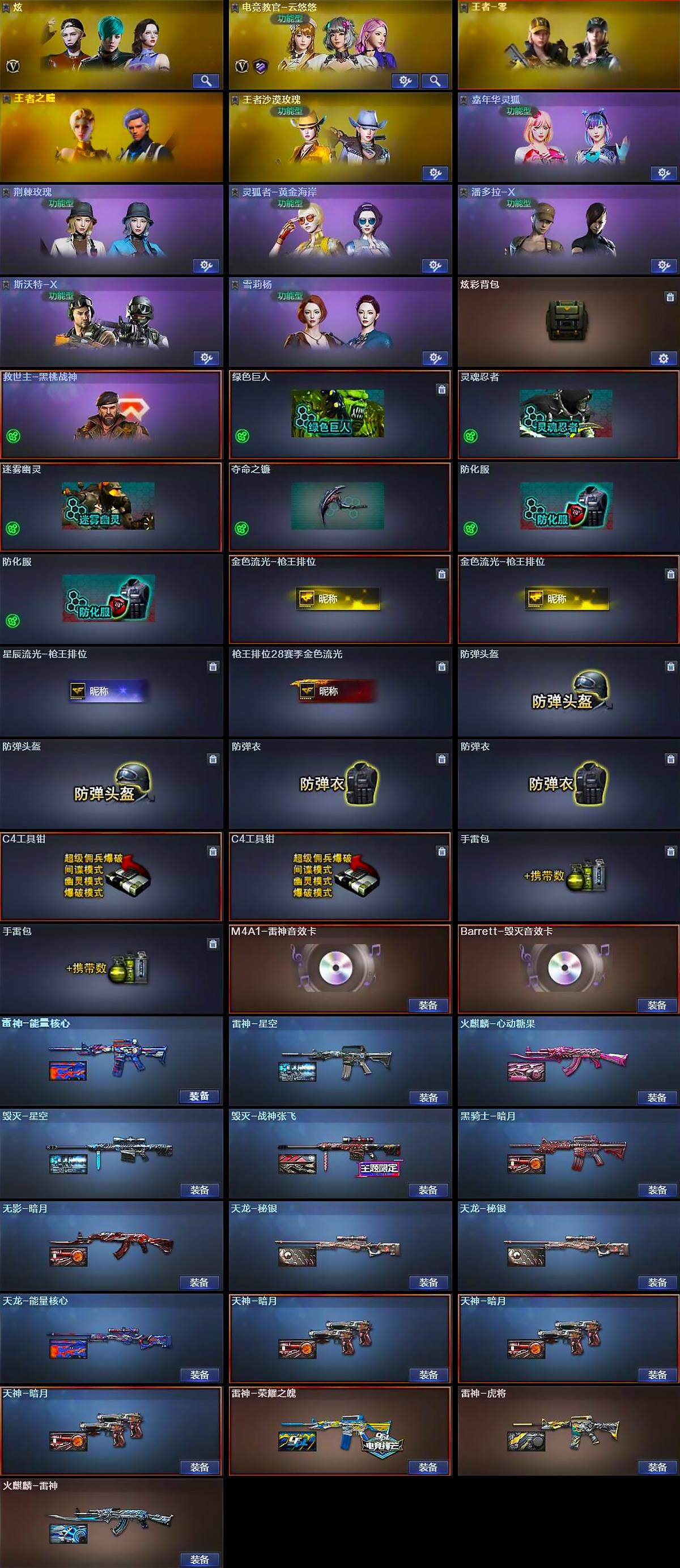 【道具】:炫彩背包,救世主-黑桃战神,绿色巨人,灵魂忍者,迷雾幽灵,夺命之镰,防化服*2,金色流光-枪王排位*2,星辰流光-枪王排位,枪王排位28赛季金色流光,防弹头盔*2,防弹衣*2,C4工具钳*2,手雷包*2