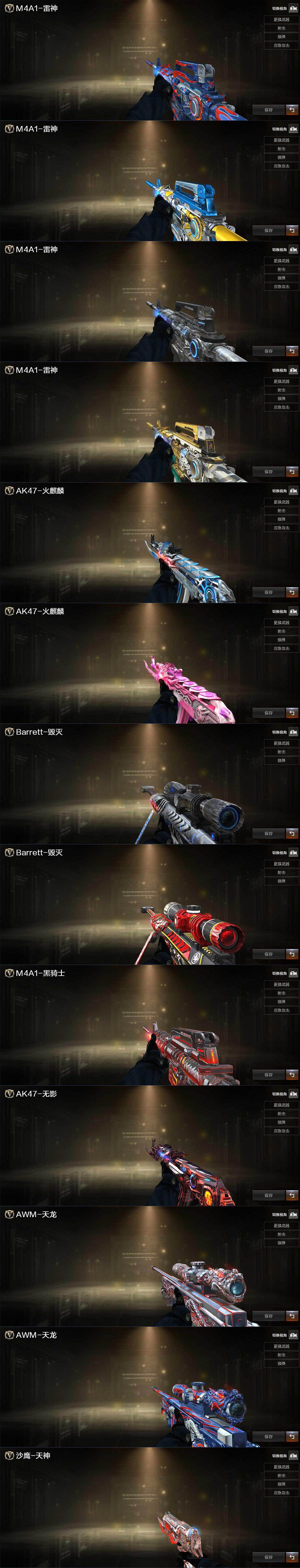 【英雄级武器】:M4A1-千变,AK47-火麒麟*5,M4A1-黑龙*3,M4A1-雷神,M4A1-黑骑士*3,AK47-无影,M4A1-死神,AK47-黑武士,AK12-天启,AN94-超新星,AK47-机械迷城,AK47-黑鲨*3,M4A1-龙血,M4A1-雷霆,M4A1-玫瑰精灵*4,QBZ03-金色蔷薇,王者之心-觉醒版,王者之魄-觉醒版,AK-47-猩红传说,AWM-天龙,Barrett-毁灭*3,Barrett-极光,AWM-裁决,M200-幻神,Kar98K-星神,M200-竞技荣光,王者之决-觉醒版,加特林-炼狱*5,汤姆逊-烈龙*6,AA-12-雷霆*2,沙鹰-修罗*5,沙鹰-天神,COP 357-雷霆王者-觉醒版,柯尔特-竞技荣光,屠龙*6,龙啸,麒麟刺*5,擎天-竞技荣光,斩神刀-雷暴,王者之锋-觉醒版,高爆手雷-雷霆*7,高爆手雷-雷暴,高爆手雷-竞技荣光,闪光弹-雷霆*7,闪光弹-雷暴,闪光弹-竞技荣光,烟雾弹-雷霆*7,烟雾弹-雷暴,烟雾弹-竞技荣光,M4A1-赤狱骑士