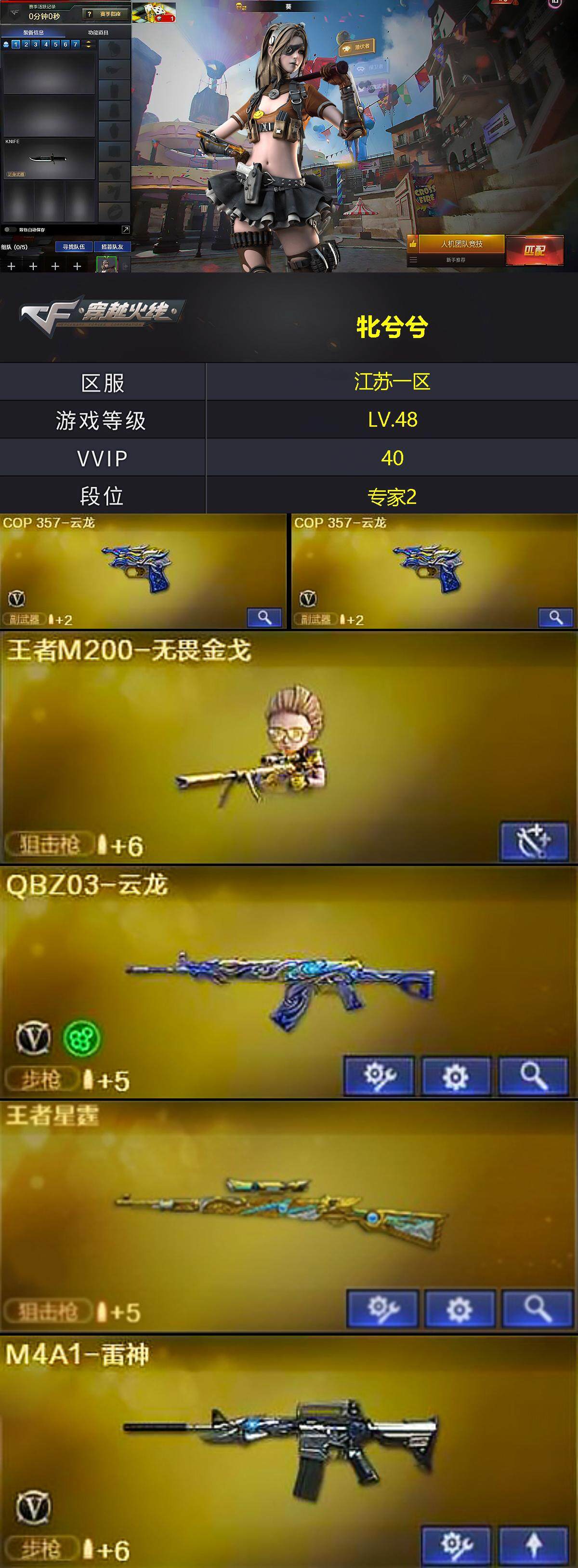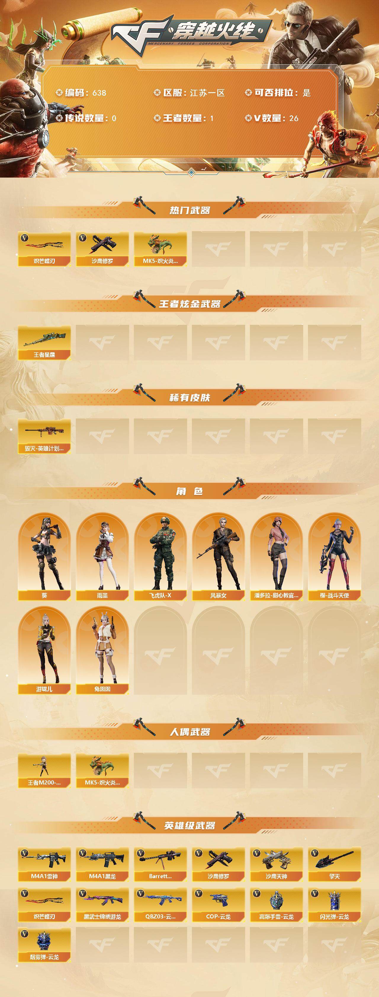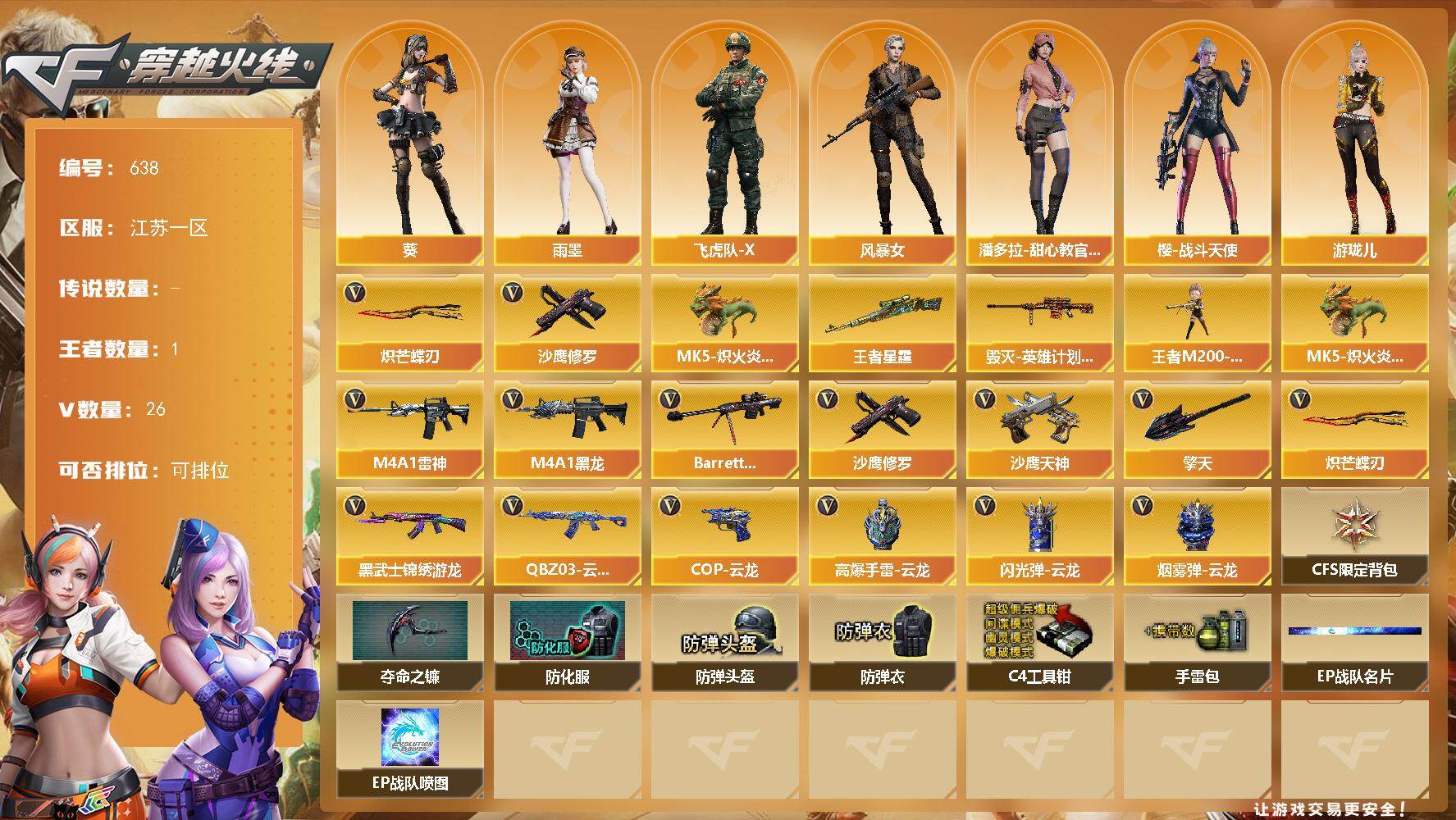 [13648547]江苏一区-26V-1王者-0炫金 【热门武器】:MK5-炽火炎龙,沙鹰-修罗,炽芒蝶刃 【王者炫金武器】:王者星霆 【皮肤】:毁灭-英雄计划 皮肤 【角色】:葵,雨墨,飞虎队-X,风暴女,潘多拉-甜心教官,兔囡囡,樱-战斗天使,游珑儿 【人偶武器】:王者M200-无畏金戈,MK5-炽火炎龙 【英雄级武器】:M4A1-黑龙,M4A1-雷神,QBZ03-云龙,黑武士-锦绣游龙,Barrett-毁灭,沙鹰-修罗,沙鹰-天神,COP 357-云龙*2,擎天,炽芒蝶刃,高爆手雷-云龙*3,闪光弹-云龙*3,烟雾弹-云龙*4 【道具】:CFS限定背包,夺命之镰,防化服,枪王排位28赛季金色流光,EP战队名片,EP战队喷图,防弹头盔,防弹衣,C4工具钳,手雷包 【特殊枪械】: