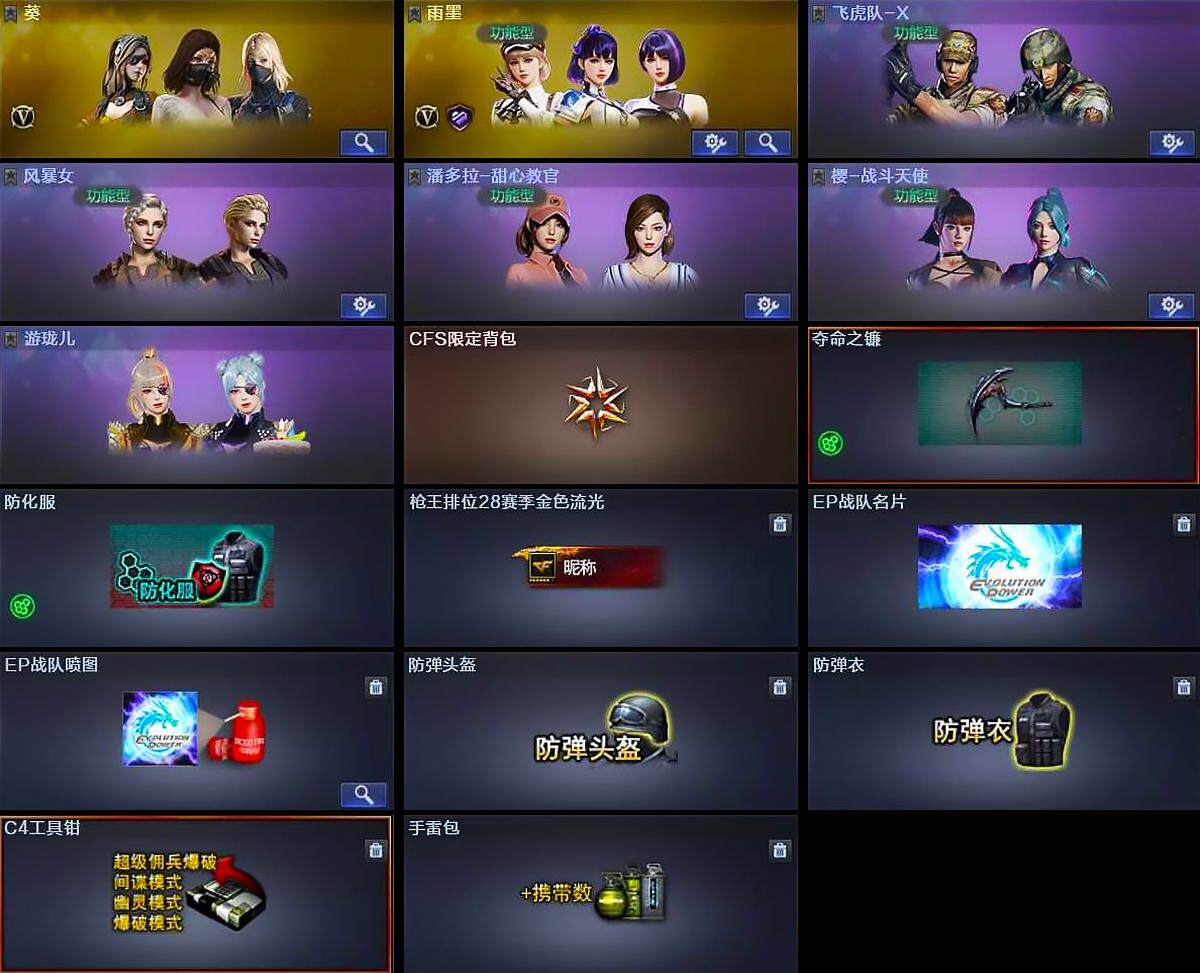 【道具】:CFS限定背包,夺命之镰,防化服,枪王排位28赛季金色流光,EP战队名片,EP战队喷图,防弹头盔,防弹衣,C4工具钳,手雷包