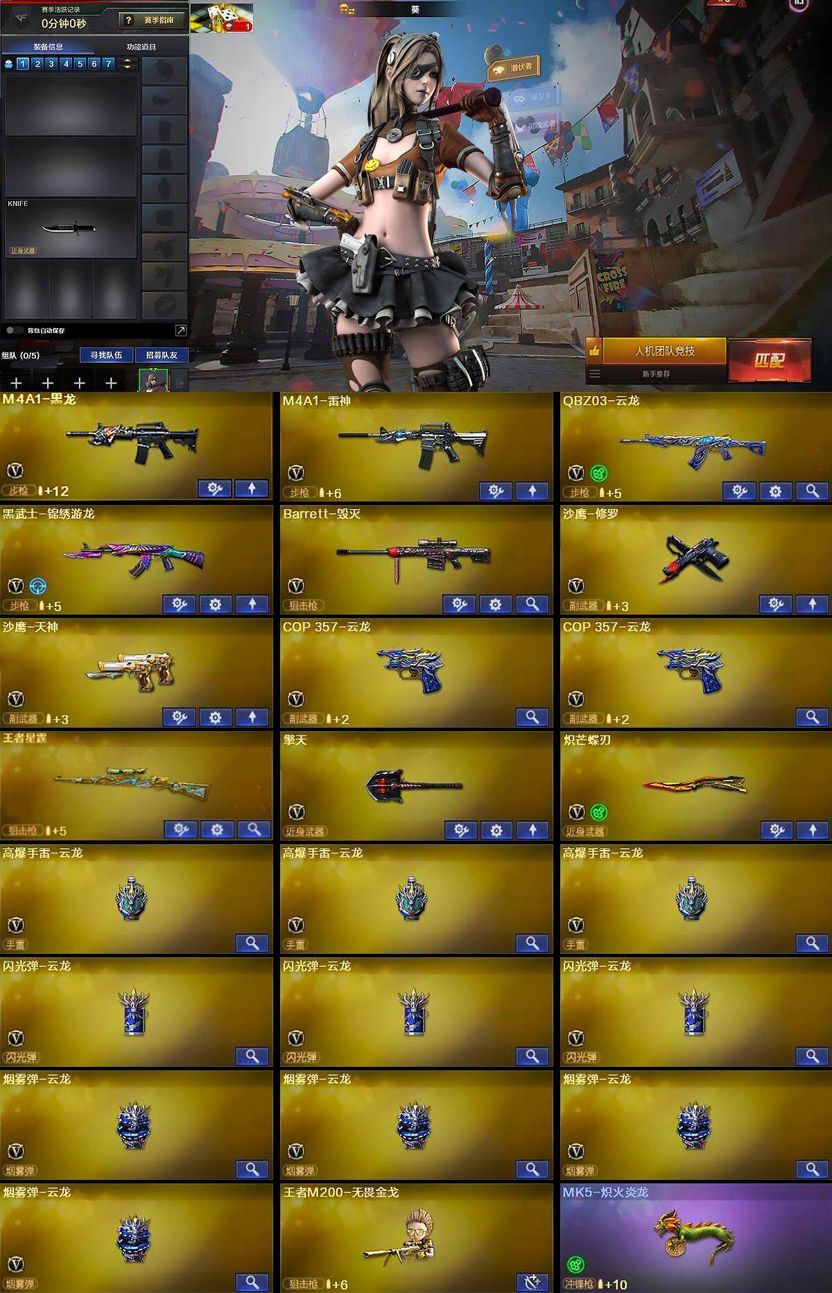 【英雄级武器】:M4A1-黑龙,M4A1-雷神,QBZ03-云龙,黑武士-锦绣游龙,Barrett-毁灭,沙鹰-修罗,沙鹰-天神,COP 357-云龙*2,擎天,炽芒蝶刃,高爆手雷-云龙*3,闪光弹-云龙*3,烟雾弹-云龙*4