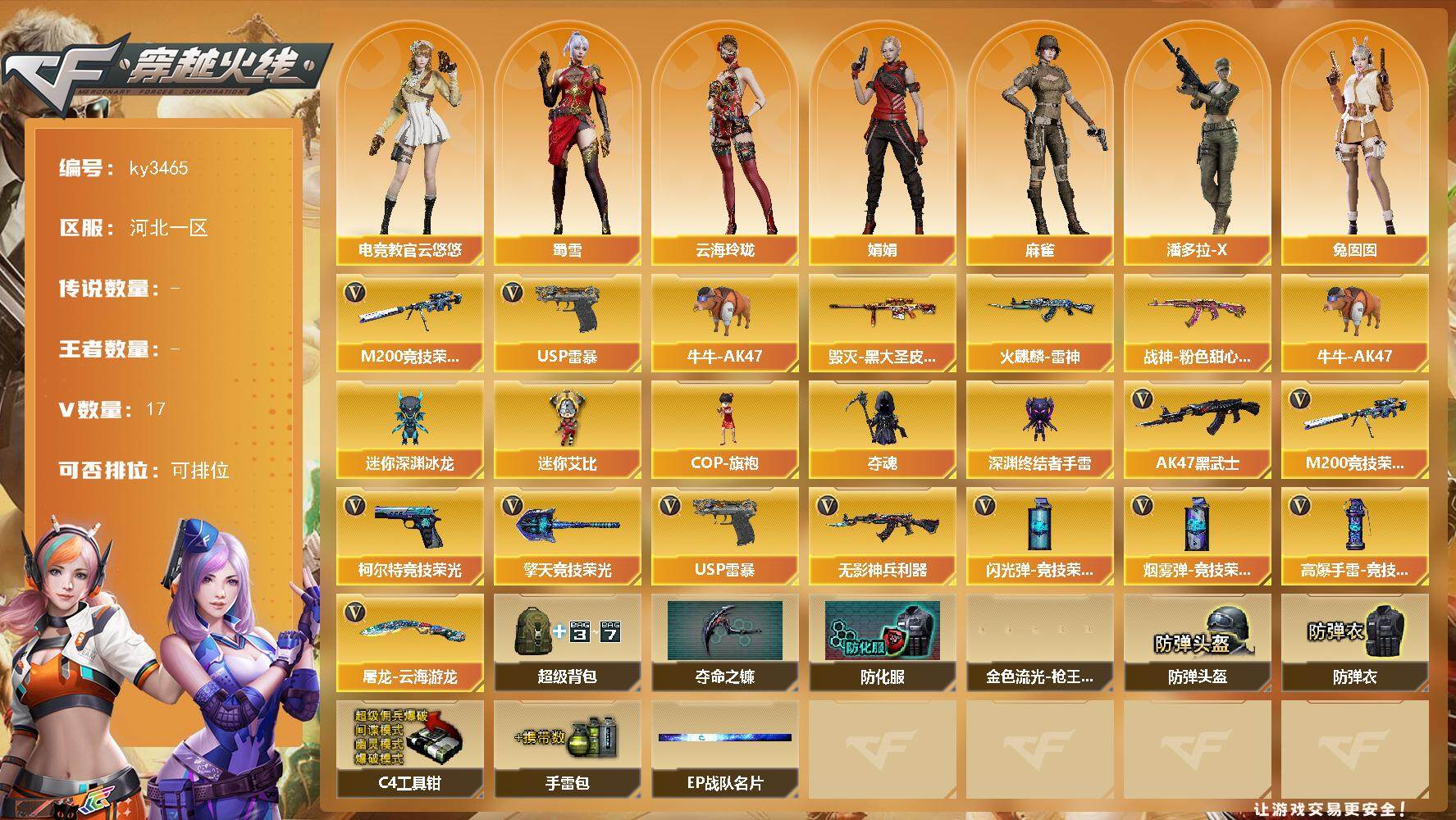 [13655737]河北一区-17V-0王者-0炫金 【热门武器】:M200-竞技荣光,牛牛-AK47,USP-雷暴 【皮肤】:火麒麟-雷神,毁灭-黑大圣皮肤,战神-粉色甜心皮肤 【角色】:电竞教官-云悠悠,云海玲珑,娟娟,麻雀,潘多拉-X,蜀雪,兔囡囡 【人偶武器】:COP-旗袍,牛牛-AK47,迷你深渊冰龙,夺魂,深渊终结者手雷,迷你艾比 【英雄级武器】:AK47-黑武士,无影-神兵利器,M200-竞技荣光,USP-雷暴,柯尔特-竞技荣光,擎天-竞技荣光,屠龙-云海游龙,高爆手雷-竞技荣光*2,闪光弹-竞技荣光*3,烟雾弹-竞技荣光*2 【道具】:超级背包,夺命之镰,防化服,金色流光-枪王排位*2,EP战队名片,防弹头盔,防弹衣,C4工具钳,手雷包 【特殊枪械】: