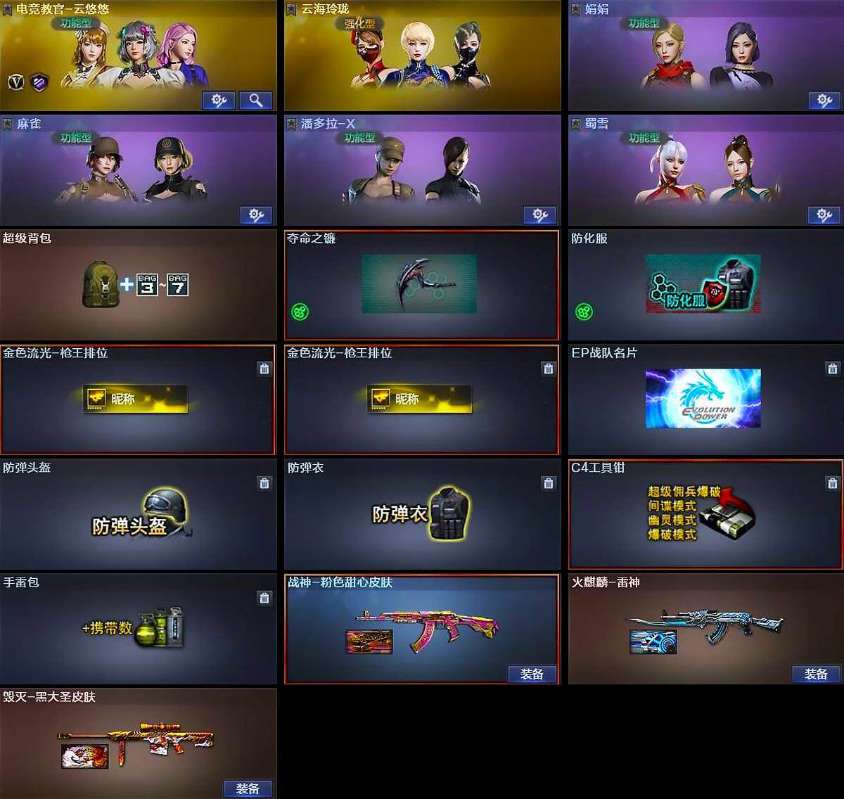 【道具】:超级背包,夺命之镰,防化服,金色流光-枪王排位*2,EP战队名片,防弹头盔,防弹衣,C4工具钳,手雷包