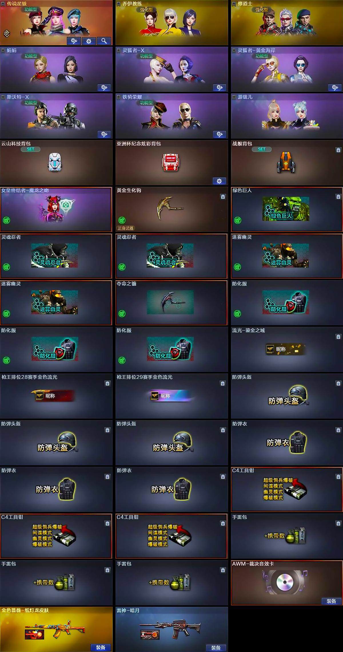 【道具】:云山科技背包,亚洲杯纪念炫彩背包,战舰背包,女皇终结者-魔龙之吻,黄金生化钩,绿色巨人,灵魂忍者*2,迷雾幽灵*2,夺命之镰,防化服*3,流光-鎏金之域,枪王排位28赛季金色流光,枪王排位29赛季金色流光,防弹头盔*3,防弹衣*3,C4工具钳*3,手雷包*3