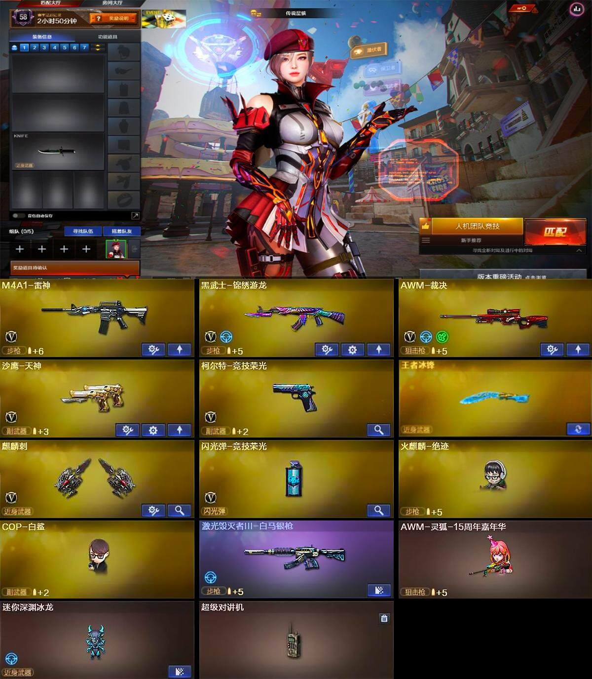 【英雄级武器】:M4A1-雷神,黑武士-锦绣游龙,AWM-裁决,沙鹰-天神,柯尔特-竞技荣光,麒麟刺,闪光弹-竞技荣光