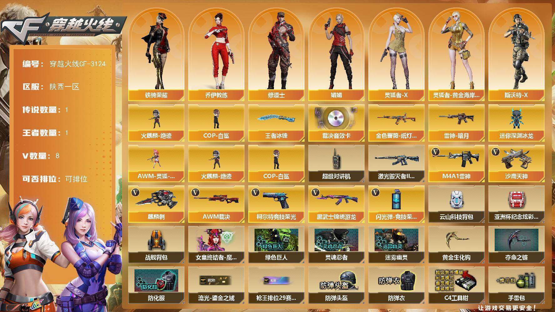 [13657807]陕西一区-8V-1王者-0炫金 【传说角色】:传说星骇 【热门武器】:火麒麟-绝迹,COP-白鲨 【王者炫金武器】:王者冰锋 【音效卡】:AWM-裁决音效卡 【皮肤】:金色蔷薇-纸灯龙皮肤,雷神-暗月 【角色】:乔伊教练,修道士,娟娟,0号玩家,灵狐者-X,灵狐者-黄金海岸,斯沃特-X,铁骑荣耀,游珑儿 【人偶武器】:火麒麟-绝迹,COP-白鲨,AWM-灵狐-15周年嘉年华,迷你深渊冰龙 【暴走生化】:超级对讲机 【挑战大师】:激光毁灭者III-白马银枪 【英雄级武器】:M4A1-雷神,黑武士-锦绣游龙,AWM-裁决,沙鹰-天神,柯尔特-竞技荣光,麒麟刺,闪光弹-竞技荣光 【道具】:云山科技背包,亚洲杯纪念炫彩背包,战舰背包,女皇终结者-魔龙之吻,黄金生化钩,绿色巨人,灵魂忍者*2,迷雾幽灵*2,夺命之镰,防化服*3,流光-鎏金之域,枪王排位28赛季金色流光,枪王排位29赛季金色流光,防弹头盔*3,防弹衣*3,C4工具钳*3,手雷包*3 【特殊枪械】: