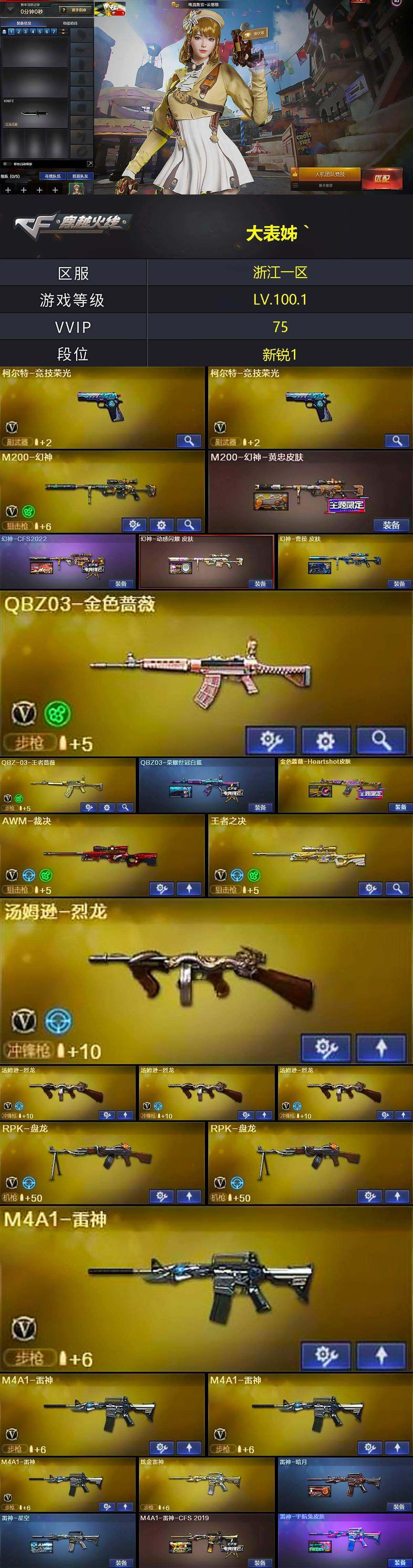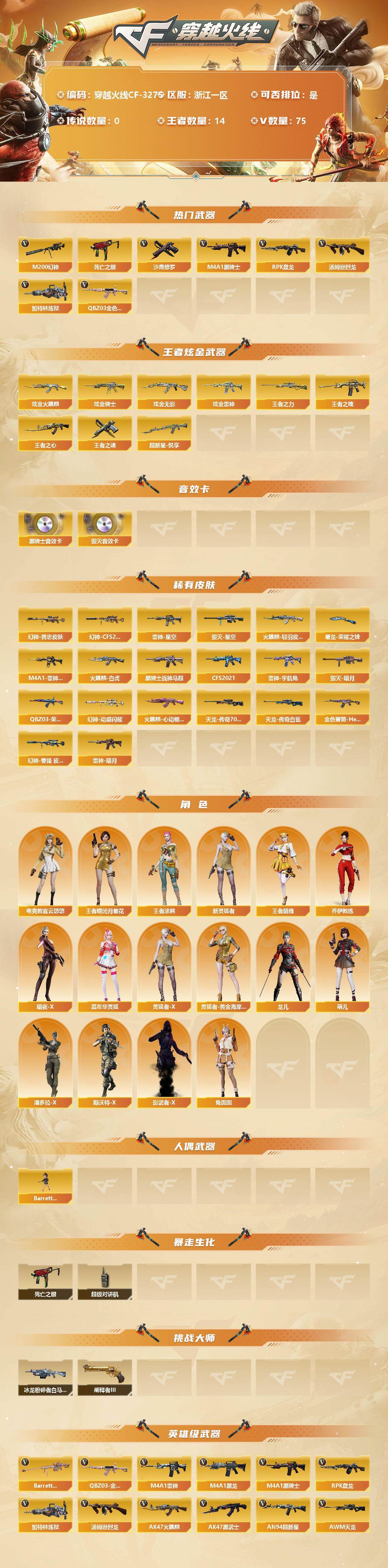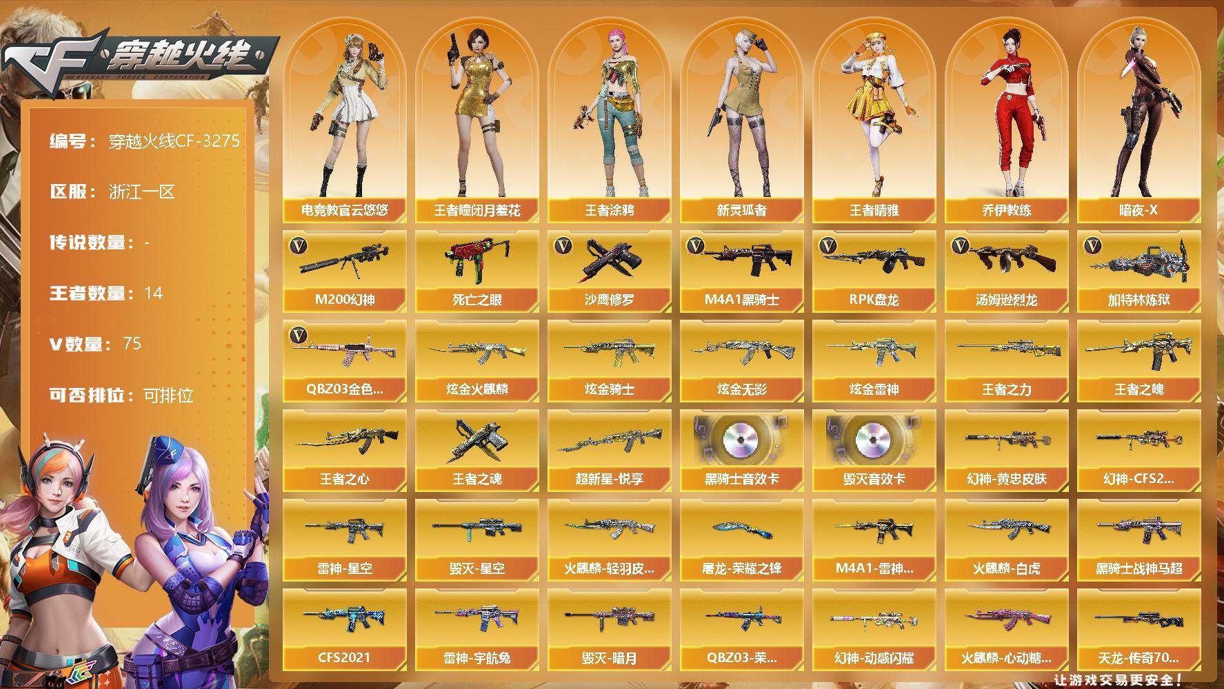 [13370271]浙江一区-75V-14王者-5炫金 【热门武器】:QBZ03-金色蔷薇,M200-幻神,死亡之眼,M4A1-黑骑士,汤姆逊-烈龙*4,RPK-盘龙*2,加特林-炼狱,沙鹰-修罗*5 【王者炫金武器】:超新星-悦享*3,王者之魄,王者之心,王者之力,王者之魂,炫金火麒麟,炫金骑士*2,炫金无影,炫金雷神 【音效卡】:M4A1-黑骑士音效卡,Barrett-毁灭音效卡 【皮肤】:M200-幻神-黄忠皮肤,幻神-CFS2022,幻神-动感闪耀 皮肤,幻神-曹操 皮肤,QBZ03-荣耀世冠白鲨,金色蔷薇-Heartshot皮肤,雷神-暗月,雷神-星空,M4A1-雷神-CFS 2019,雷神-宇航兔皮肤,火麒麟-轻羽皮肤,火麒麟-白虎,火麒麟-心动糖果,毁灭-暗月*2,毁灭-星空,毁灭-黑曼巴 皮肤,黑龙-能量核心,黑骑士-战神马超,黑骑士-CFS2021,黑骑士-破浪10年皮肤,AWM-天龙-传奇70KG,AWM-天龙-传奇白鲨,屠龙-荣耀之锋 【角色】:电竞教官-云悠悠,王者-瞳-闭月羞花,王者涂鸦,王者晴雅,乔伊教练,暗夜-X,嘉年华灵狐,灵狐者-X,灵狐者-黄金海岸,龙儿,萌儿,潘多拉-X,斯沃特-X,兔囡囡,新灵狐者,影武者-X 【人偶武器】:Barrett-夜玫瑰 【暴走生化】:死亡之眼,超级对讲机 【挑战大师】:冰龙粉碎者-白马银枪,阐释者III 【英雄级武器】:M4A1-千变,AK47-火麒麟*4,M4A1-黑龙,M4A1-雷神*4,M4A1-黑骑士,AK47-黑武士*6,AN94-超新星,M4A1-武圣,M4A1-龙血,QBZ03-金色蔷薇,QBZ-03-王者蔷薇-觉醒版,AWM-天龙,Barrett-毁灭,Barrett-极光,AWM-裁决,M200-幻神,Barrett-金色蔷薇,王者之决-觉醒版,RPK-盘龙*2,加特林-炼狱,汤姆逊-烈龙*4,AA-12-雷霆,沙鹰-修罗*5,沙鹰-天神,柯尔特-竞技荣光*2,天神-动感闪耀,屠龙*2,麒麟刺,擎天-竞技荣光,王者之啸-觉醒版*2,高爆手雷-雷霆,高爆手雷-幻灵,高爆手雷-竞技荣光*6,手雷-动感闪耀,闪光弹-雷霆,闪光弹-幻灵,闪光弹-竞技荣光*6,烟雾弹-雷霆,烟雾弹-竞技荣光*6 【道具】:CFS限定背包,EDG炫彩背包,云山科技背包,炫彩背包,绿色巨人,灵魂忍者,迷雾幽灵,夺命之镰,防化服*